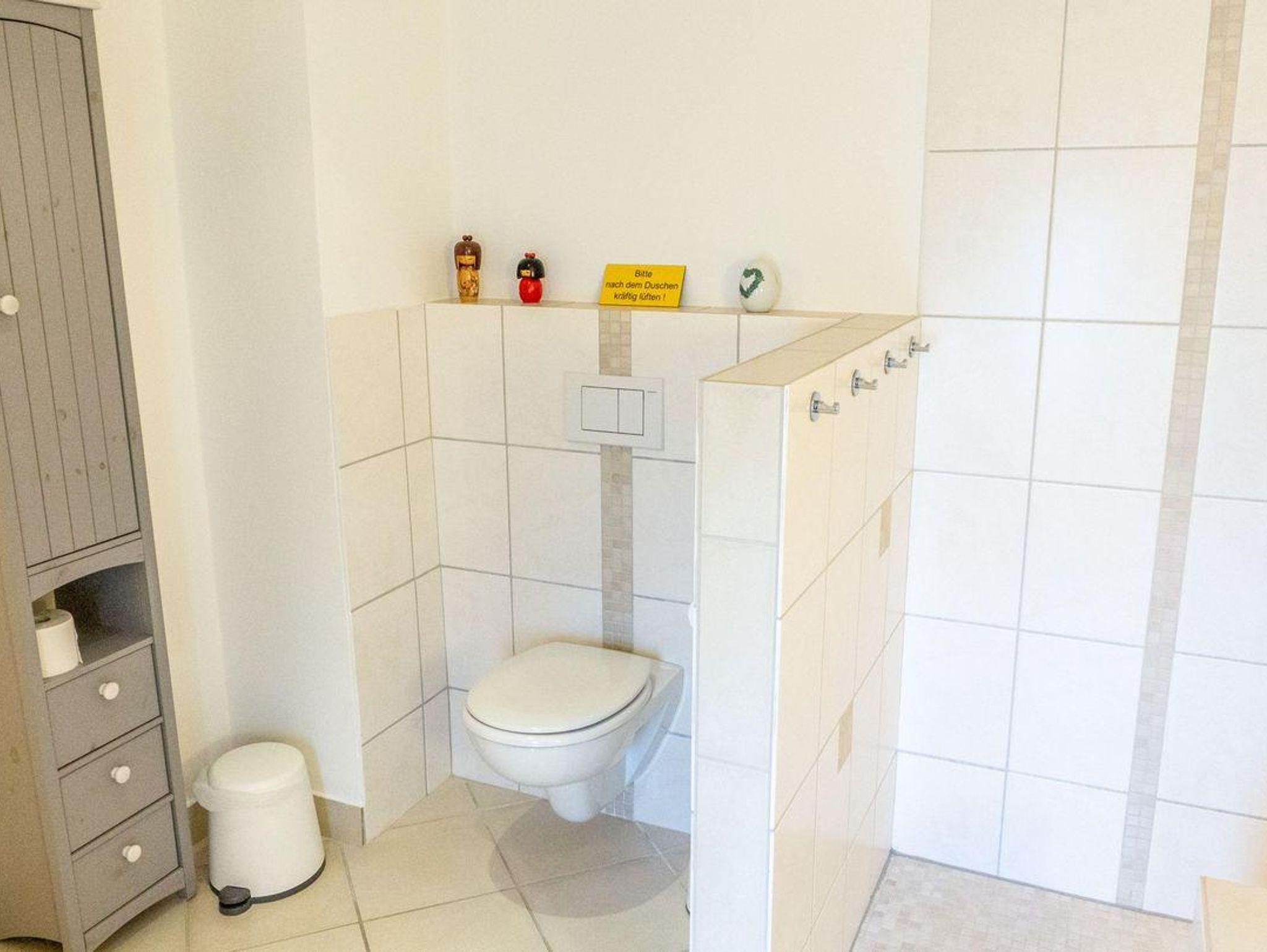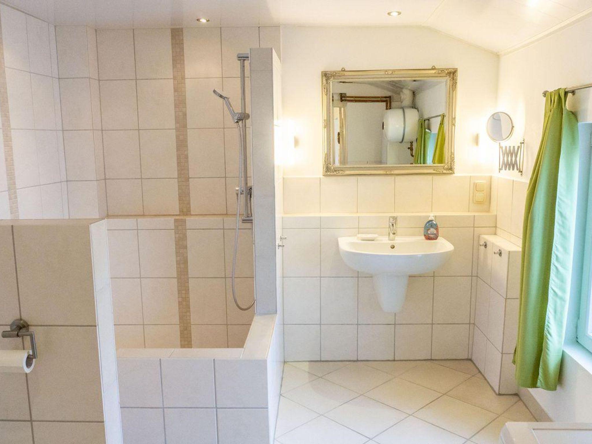 Das Badezimmer im Erdgeschoß ist funktional gestaltet und verfügt über eine bodengleiche Dusche, WC, Waschbecken, Haartrockner, Kosmetikspiegel und Fenster. Hier finden Sie außerdem eine Waschmaschine zur Eigennutzung.