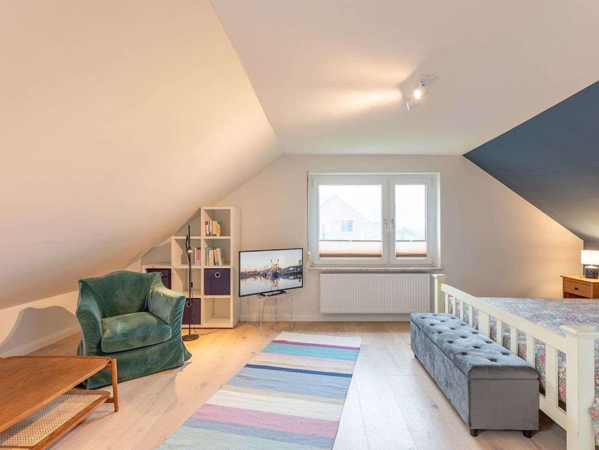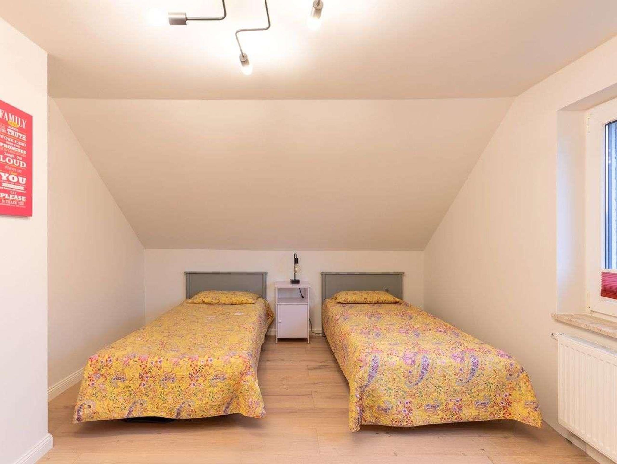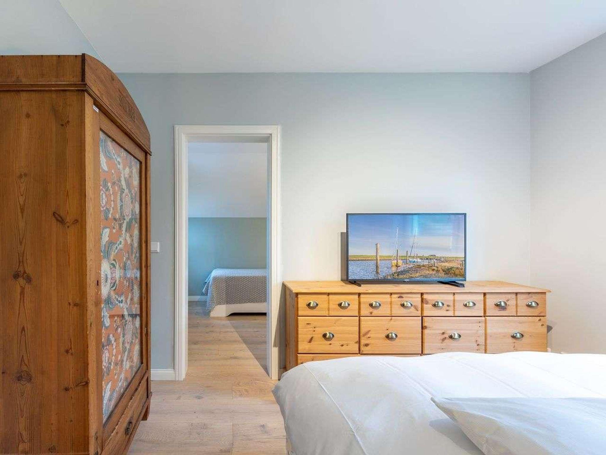 Im Obergeschoss befinden sich weitere zwei Schlafzimmer, das erste mit einem Doppelbett (180 × 200), ebenfalls mit eigenem Flachbildfernseher. Das zweite Schlafzimmer im Obergeschoss bietet zusätzlich zwei Einzelbetten (90 × 200). Reichlich Platz und schöne Rückzugsorte für Freunde und Familie.