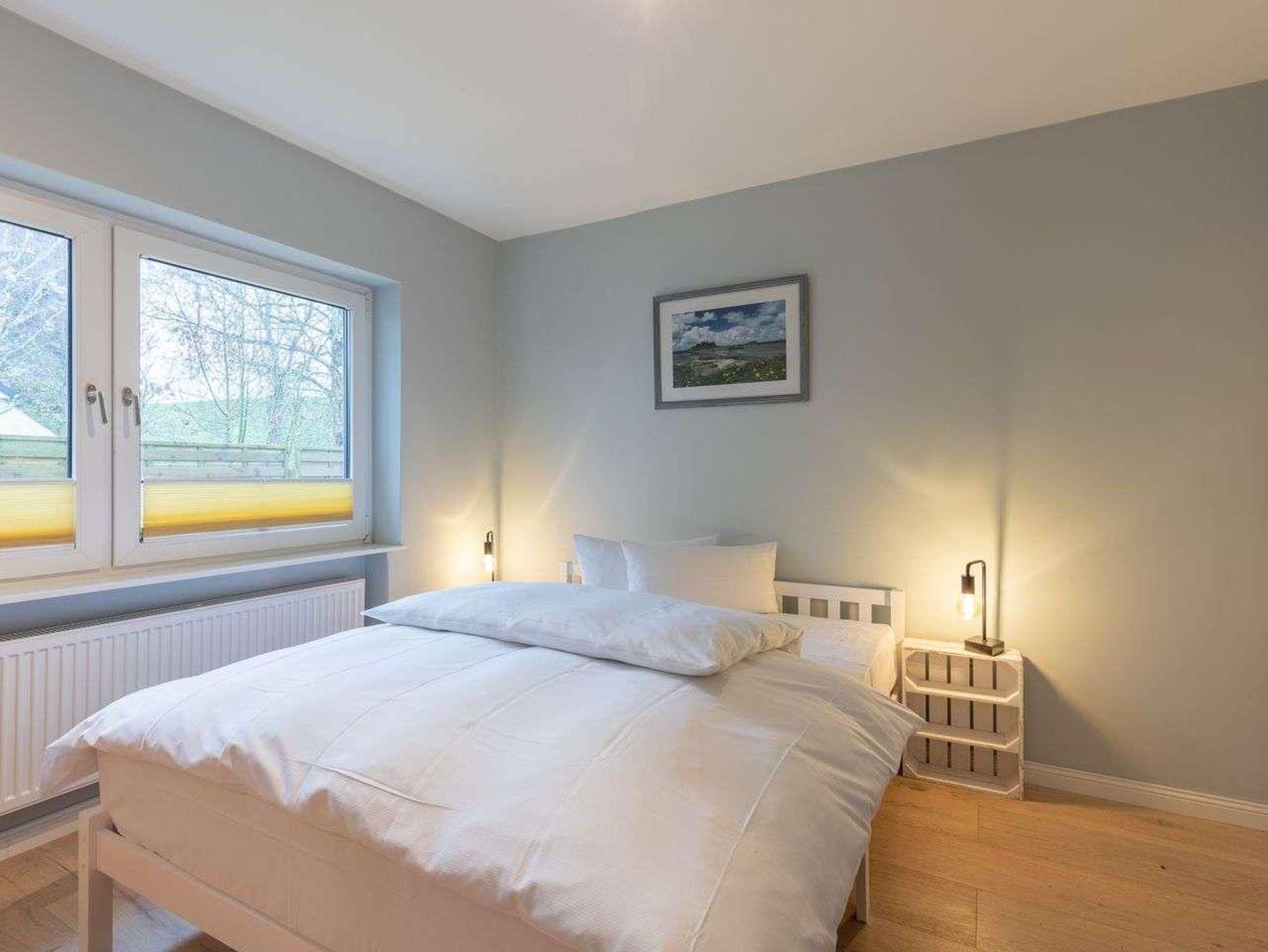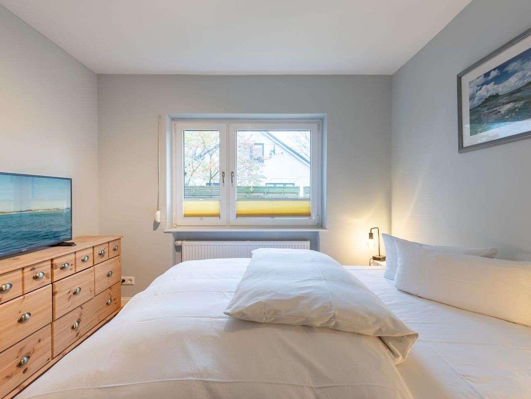 Das Ferienhaus verfügt über insgesamt vier Schlafzimmer: zwei Schlafzimmer im Erdgeschoss, eines davon mit einem Doppelbett (160 × 200) und eigenem TV. Von diesem Zimmer aus gelangen Sie direkt in das zweite Schlafzimmer mit einem Einzelbett (90 × 200) und einem zusätzlichen ausziehbaren Bettgestell (90 × 200).