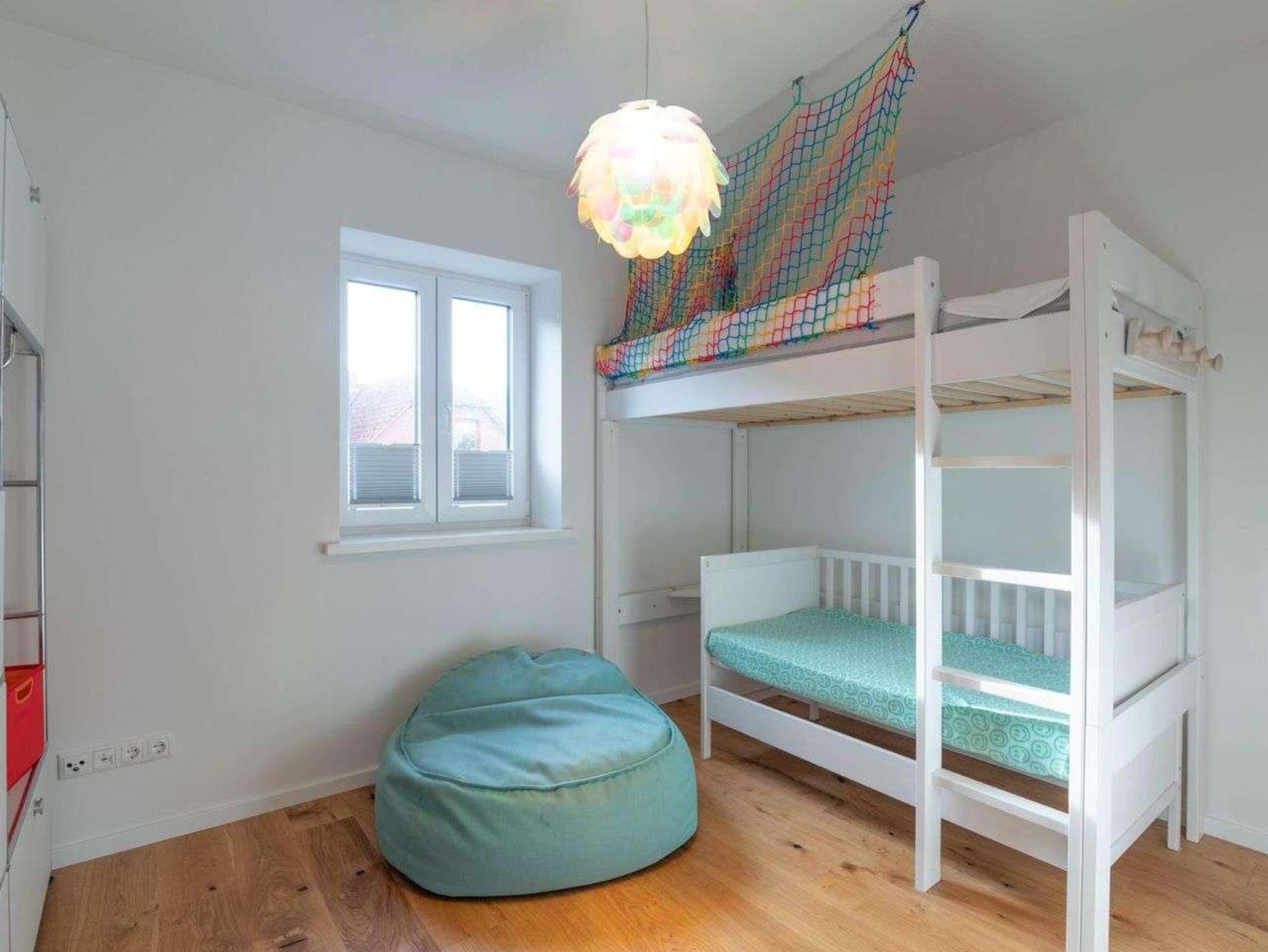 Über eine geschlossene Holztreppe erreichen Sie das 1. Obergeschoss mit drei Schlafzimmern: Das Elternschlafzimmer ist mit einem Doppelbett (180 x 200) ausgestattet, ein kleineres Schlafzimmer mit einem Bett (140 x 200) und das Kinderzimmer mit einem Hochbett. Alle Fenster in den Schlafräumen lassen sich mit Plissees abdunkeln.