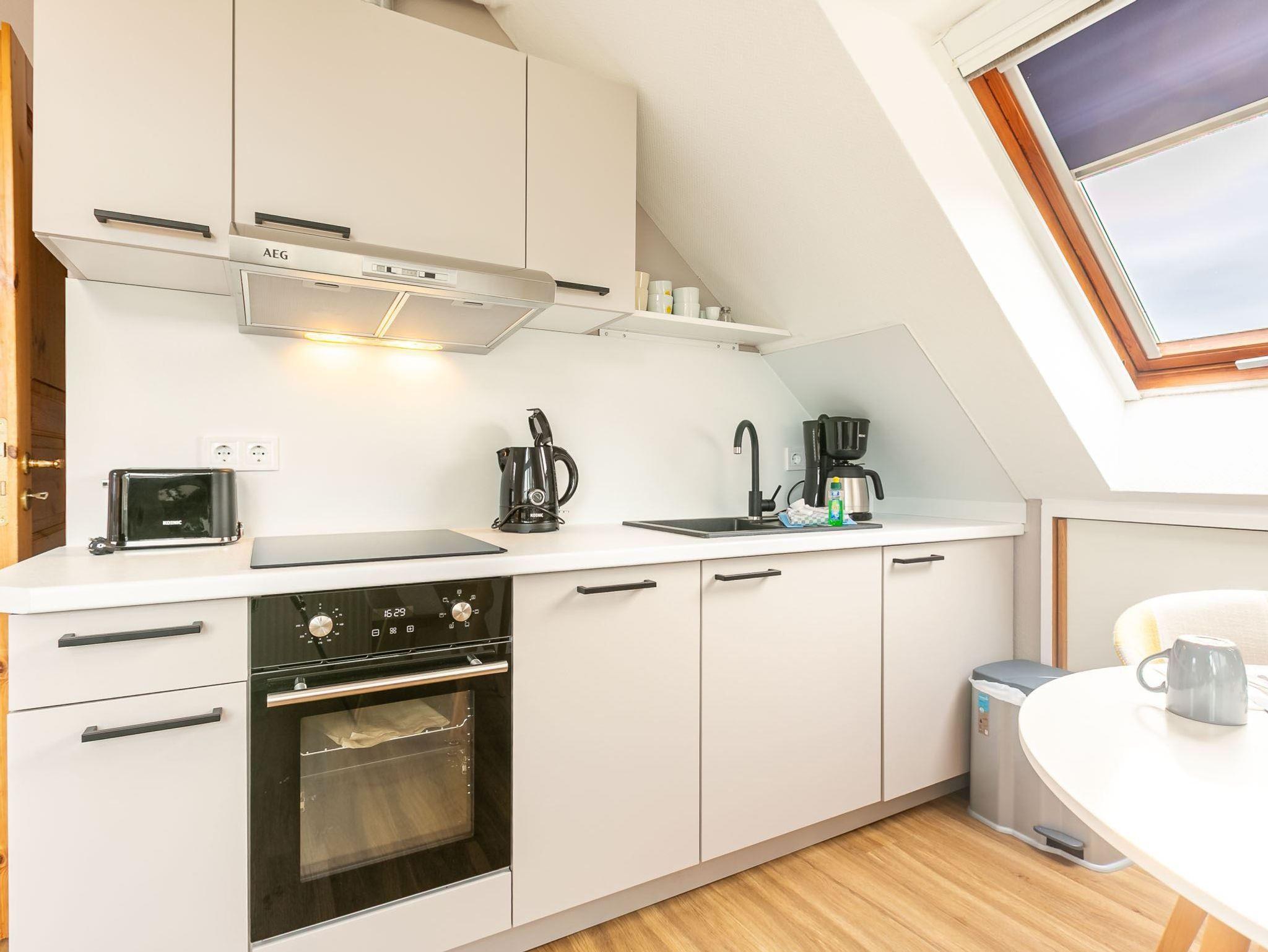 Wohnzimmer mit (ausziehbarem Schlaf-) Sofa (140x200cm), TV (Sat) und Esstisch mit zwei Stühlen. Offene Küche mit Backofen, Herd mit 2 Kochstellen, Geschirrspüler und Kühlschrank mit Gefrierfach.