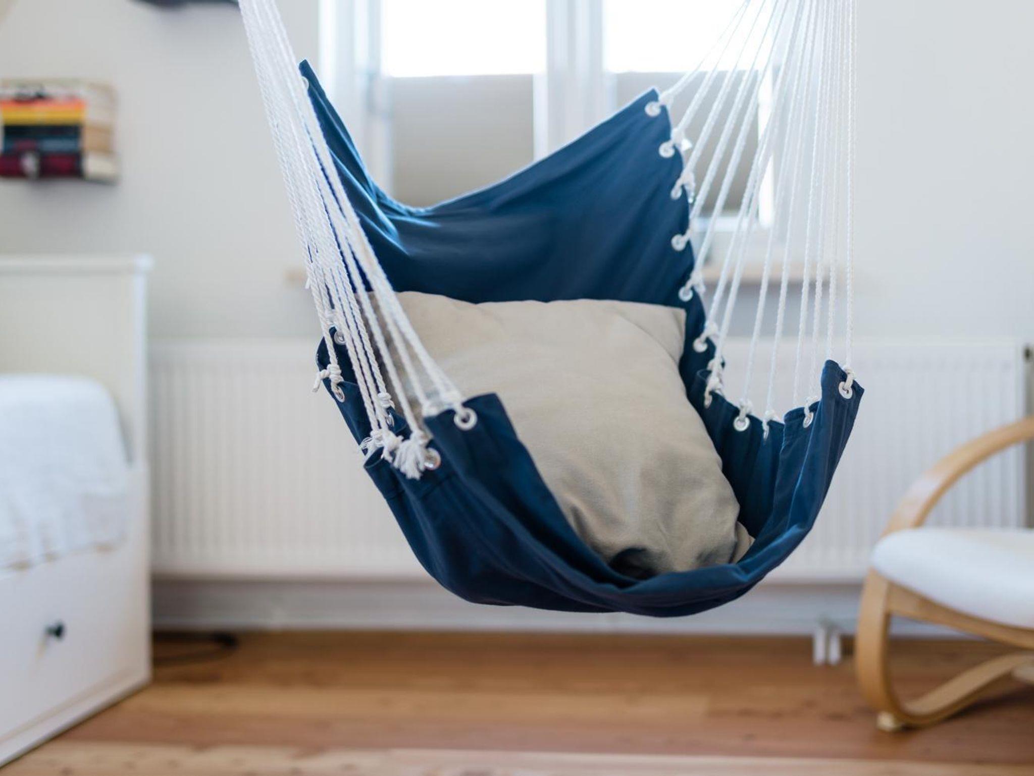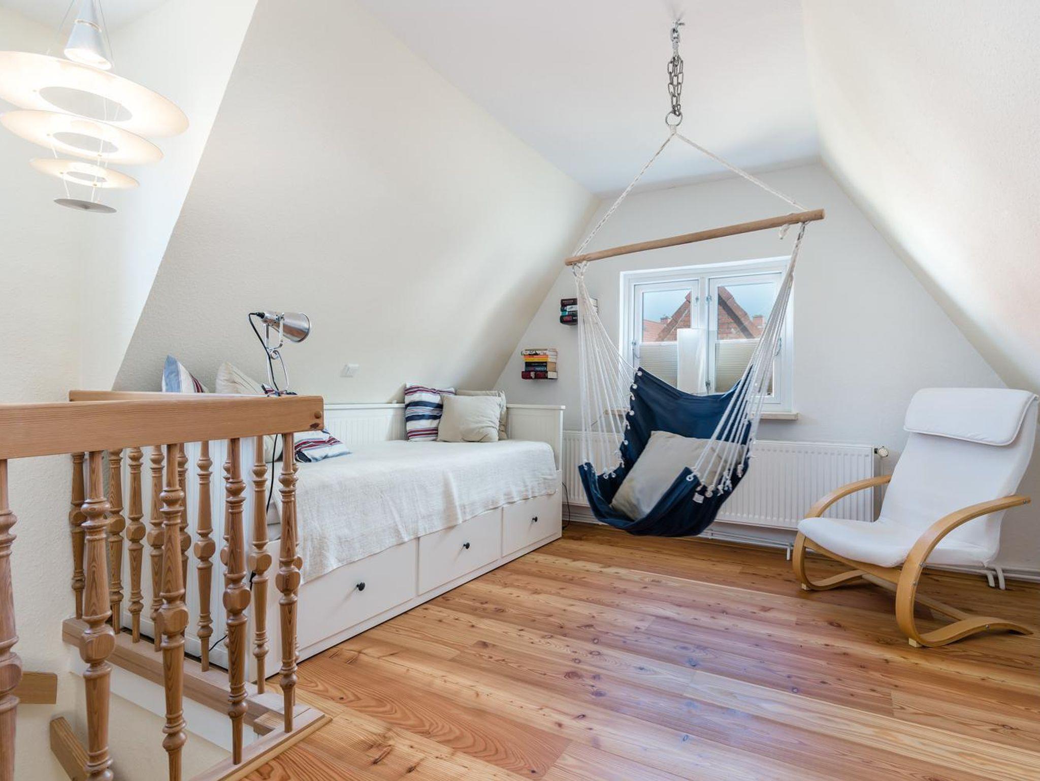 Über die Wendeltreppe gelangen Sie in das Obergeschoss. Dort befindet sich das geräumige Schlafzimmer sowie ein Wohlfühlbereich mit Hängesessel und Daybed. Dies kann zu einem Doppelbett umgewandelt werden. Hier können Sie gemütlich Lesen und Relaxen. Die bezogenen Betten warten auf Sie ! Bei der Renovierung und Einrichtung haben wir darauf geachtet, dass das Ferienhaus Smilehul, trotz seiner Größe geräumig ist. Sie haben außerdem genug Stauraum für Ihre Bekleidung und persönlichen Sachen.
