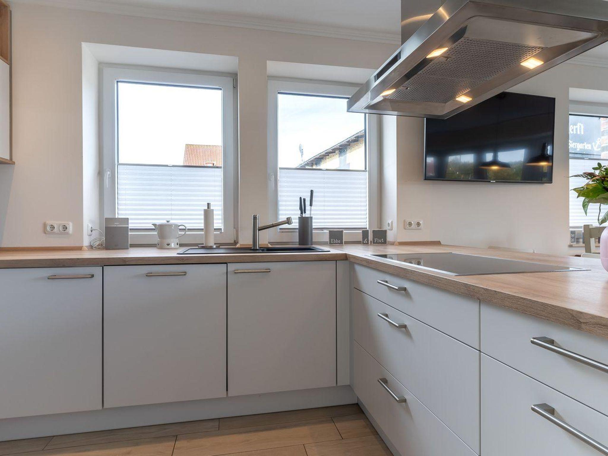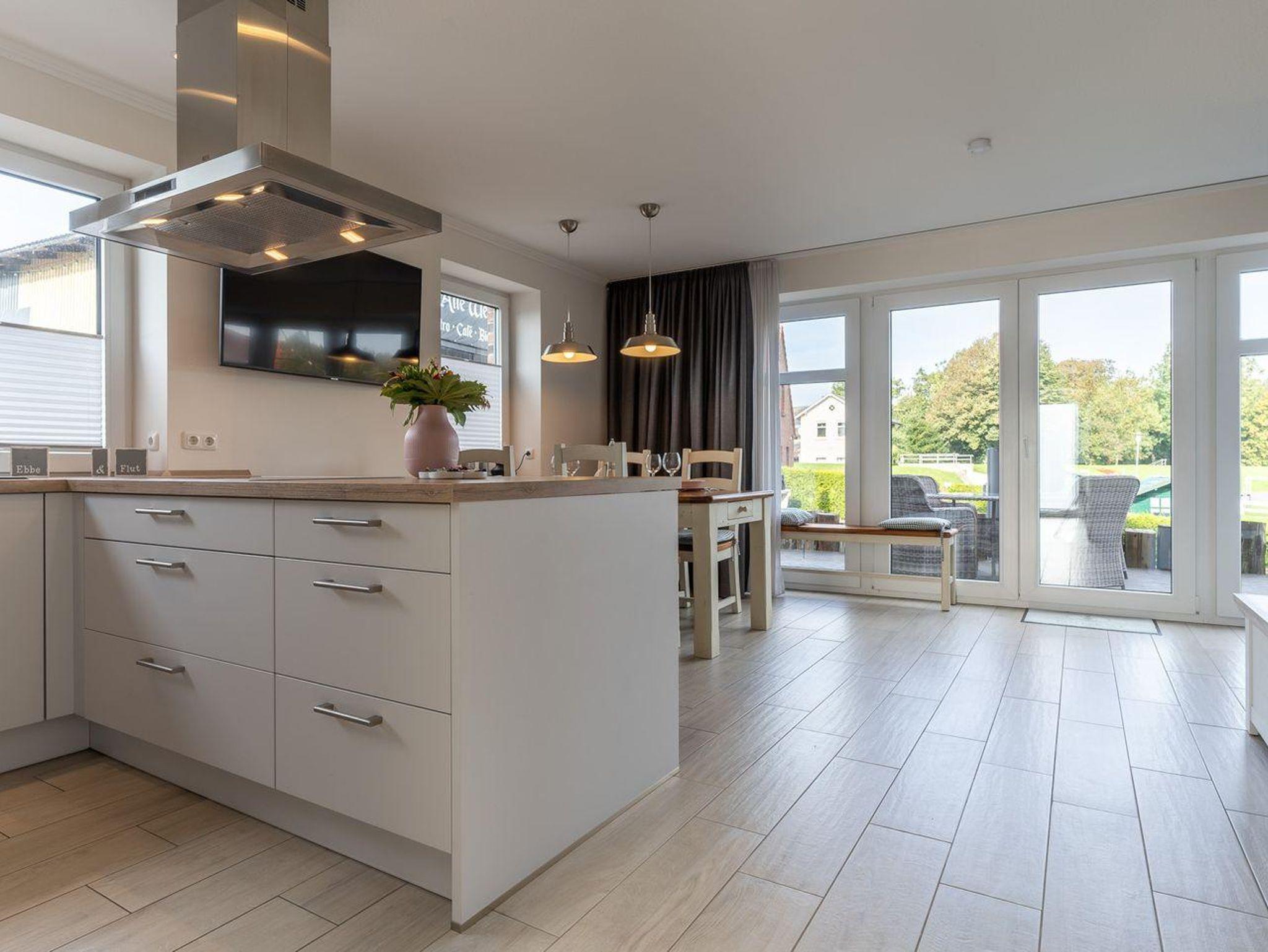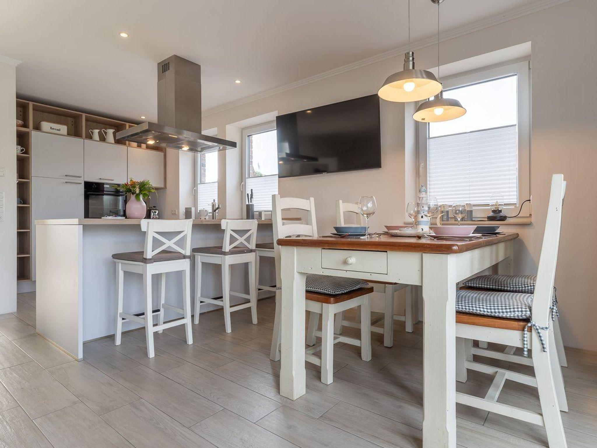 Die moderne Einrichtung des Ferienhauses umfasst alle Annehmlichkeiten, die Sie sich wünschen können. Eine eigene Sauna erwartet Sie, um Körper und Geist zu verwöhnen, während der Ofen an kühleren Abenden eine behagliche Atmosphäre schafft. Die gemütlichen Schlafzimmer bieten nicht nur erholsame Nächte, sondern auch beeindruckende Ausblicke auf den Hafen und die Eider. Die großzügige und moderne Wohnküche lädt zum gemeinsamen Kochen und Genießen ein.