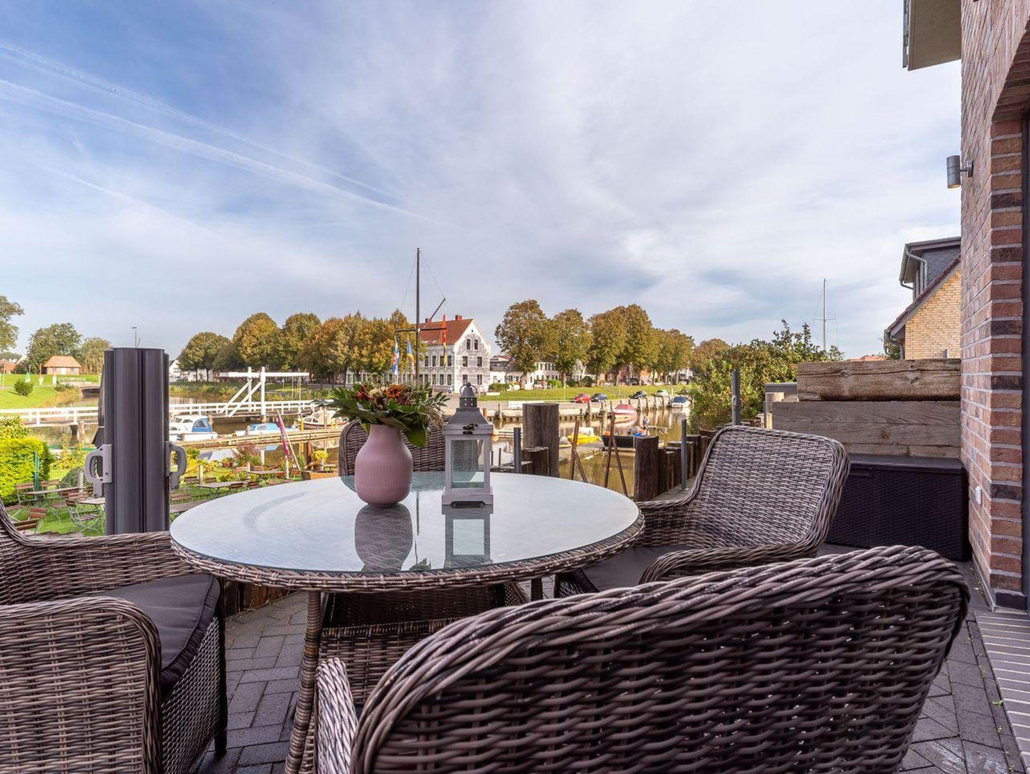 Die Terrasse, ausgestattet mit komfortablen Sitzmöbeln und einem großzügigen Gasgrill, ermöglicht entspannte Stunden im Freien. Der Blick auf den Hafen wird zu einem ständigen Begleiter, sei es von der Terrasse aus oder vom Balkon und der Loggia im Obergeschoss. Hier können Sie den vorbeiziehenden Schiffsverkehr beobachten und die maritime Atmosphäre in vollen Zügen genießen.