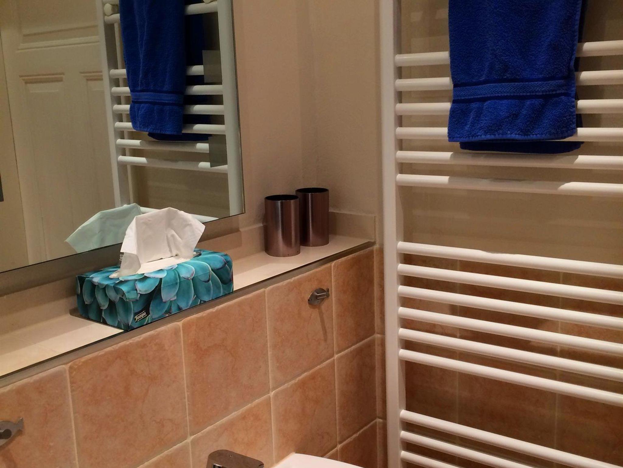 Das neu renovierte Bad ist mit einer ebenerdigen Natursteindusche und Fußbodenerwärmung ausgestattet. In der Dusche befindet sich eine Sitzbank, die auch als Ablage für Ihre Duschaccessoires dient. Des Weiteren finden Sie im Badezimmer einen beleuchteten Spiegel und einen Handtuchtrockner. Der zweitürige Spiegelschrank hält frische Handtücher und einen Fön für Sie bereit.
