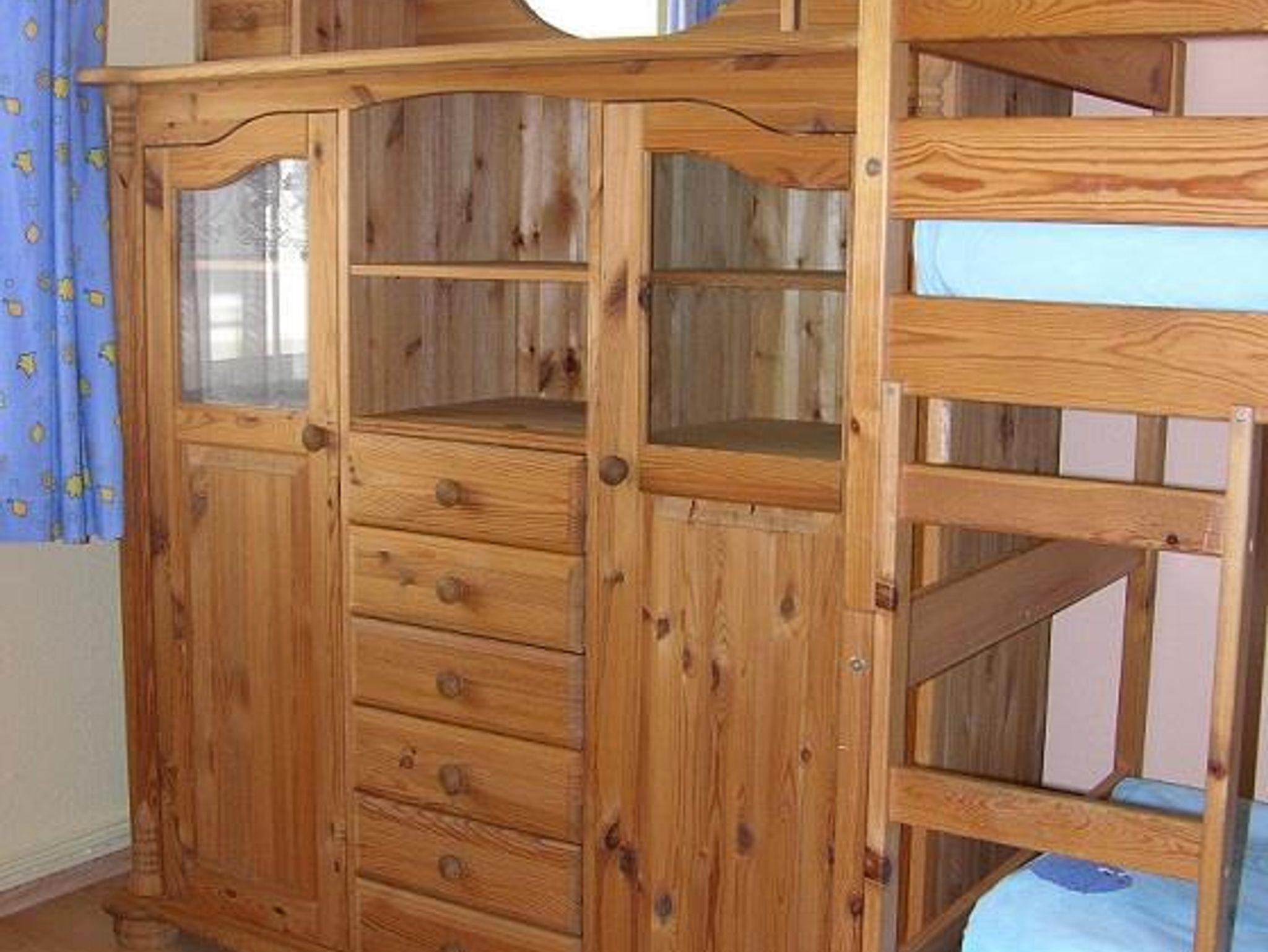 Durch das Schlafzimmer gelangen Sie in das Kinderzimmer mit einem Etagenbett (90/200cm). Die Schubladen und Fächer des Naturholzschrankes bieten viel Platz für Großes und Kleines.