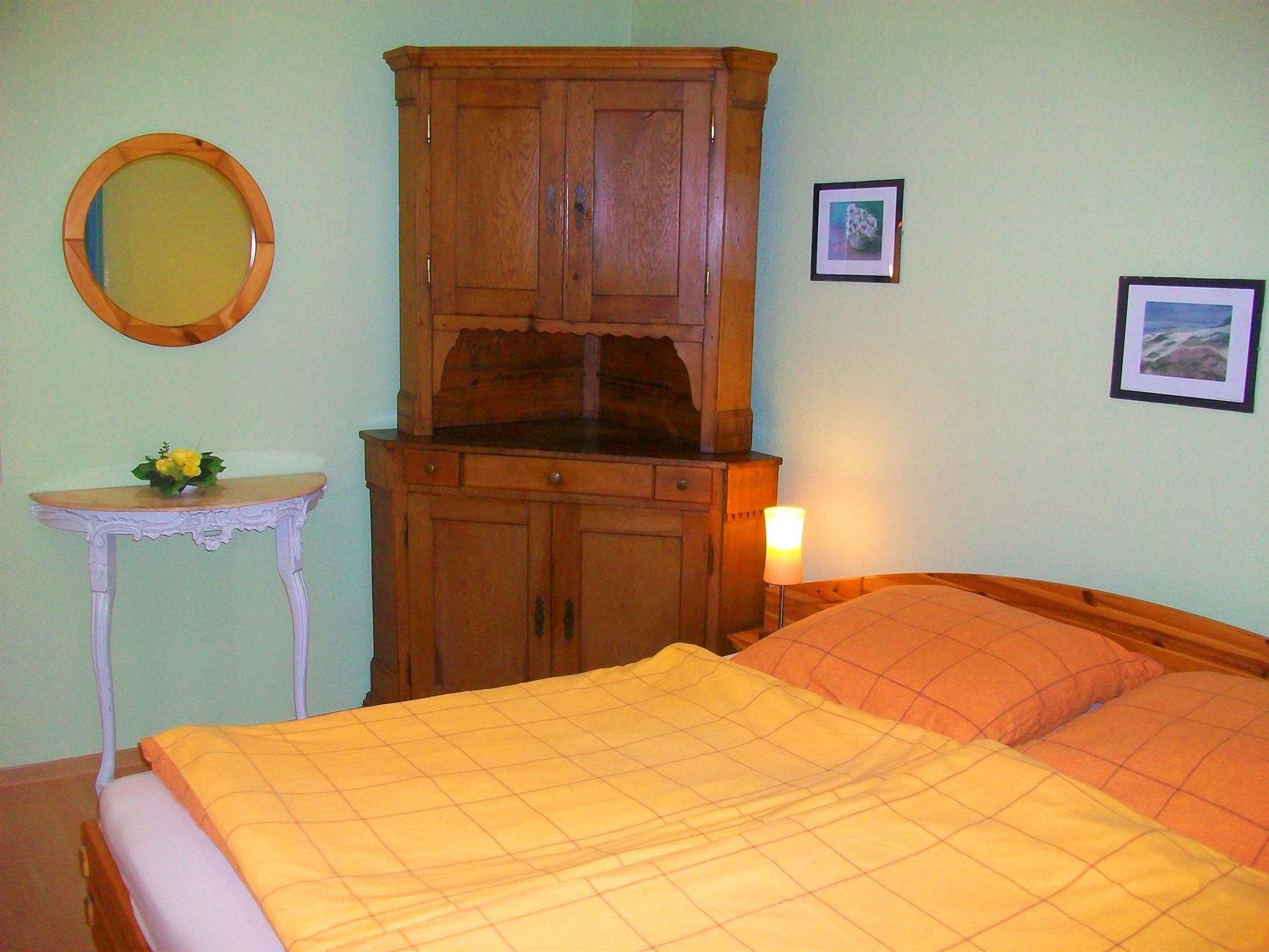 Im Schlafzimmer lädt Sie das extrahohe Doppelbett mit höhenverstellbaren Lattenrosten zu einem erholsamen Schlaf ein. Die Kommode und der geräumige Kleiderschrank aus massivem Kiefernholz nehmen gerne Ihre Urlaubsgarderobe auf. Ein antiker Eckschrank und ein Konsolentisch erinnern an den historischen Ursprung des Hauses.
