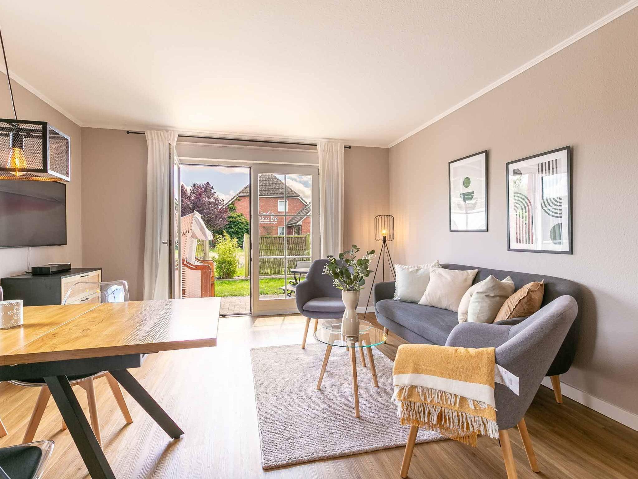 Wohnzimmer mit Sofa, zwei Sesseln, TV (Sat) und Esstisch mit vier Stühlen. Direkter Zugang zur möblierten Terrasse nach Süden mit Strandkorb und Blick auf den Deich. Offene Küche mit Backofen, Geschirrspüler, Kühlschrank (ohne Gefrierfach) und DeLonghi Nespresso Kapsel-Kaffeemaschine.