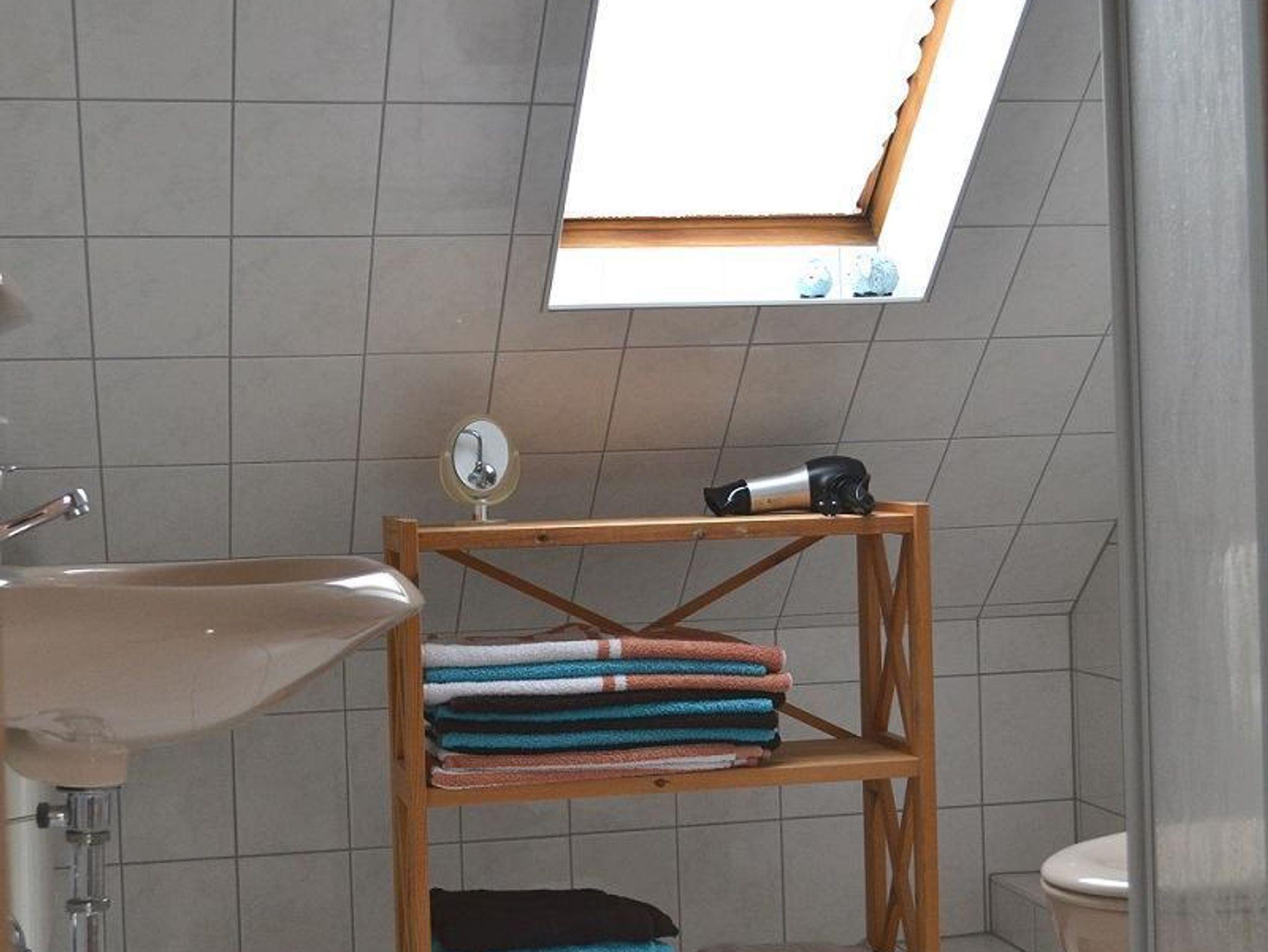 Im Obergeschoss erwartet Sie ein ansprechend eingerichtetes Wohnzimmer mit einer Schlafgelegenheit, Fernseher sowie Stereoanlage und CD-Player. Hier finden Sie auch Kartenmaterial und informative Lektüren über Tönning und Umgebung. Des Weiteren befindet sich im Obergeschoss ein Schlafzimmer mit Doppelbett sowie ein Duschbad mit WC und Fußbodenerwärmung. Ein WLAN-Anschluss ermöglicht Ihnen den Zugang zum Internet.