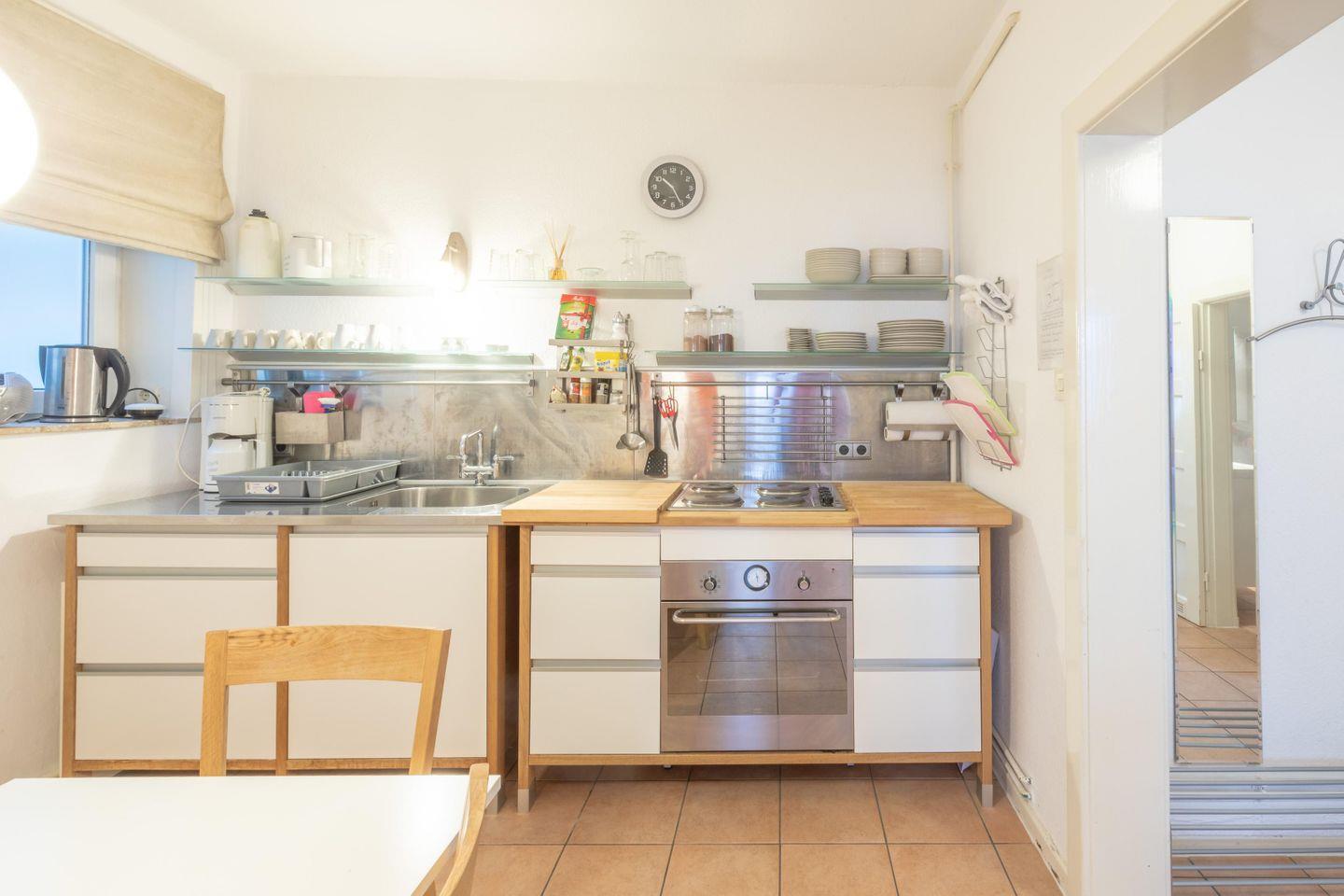 Die Wohnung ist mit allem eingerichtet, was Sie für einen schönen Aufenthalt an der Nordsee benötigen: ein Schlafzimmer mit einem Doppelbett (160 x 200), eine gut ausgestattete Einbauküche mit 4-Platten-Kochfeld, Backofen, Mikrowelle, Kaffeemaschine (Filtergröße 4). Das Wohnzimmer verfügt über ein bequemes Schlafsofa, einen Flachbild-TV und einen DVD-Player, CD-Player mit Radio. Das Badezimmer ist mit einer Badewanne mit Duschvorrichtung, WC, Waschbecken und einer Waschmaschine eingerichtet.