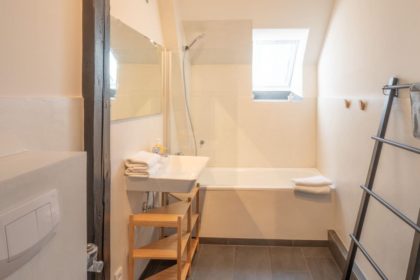 Das Badezimmer ist mit einer Badewanne mit Duschvorrichtung, WC und Waschbecken eingerichtet.