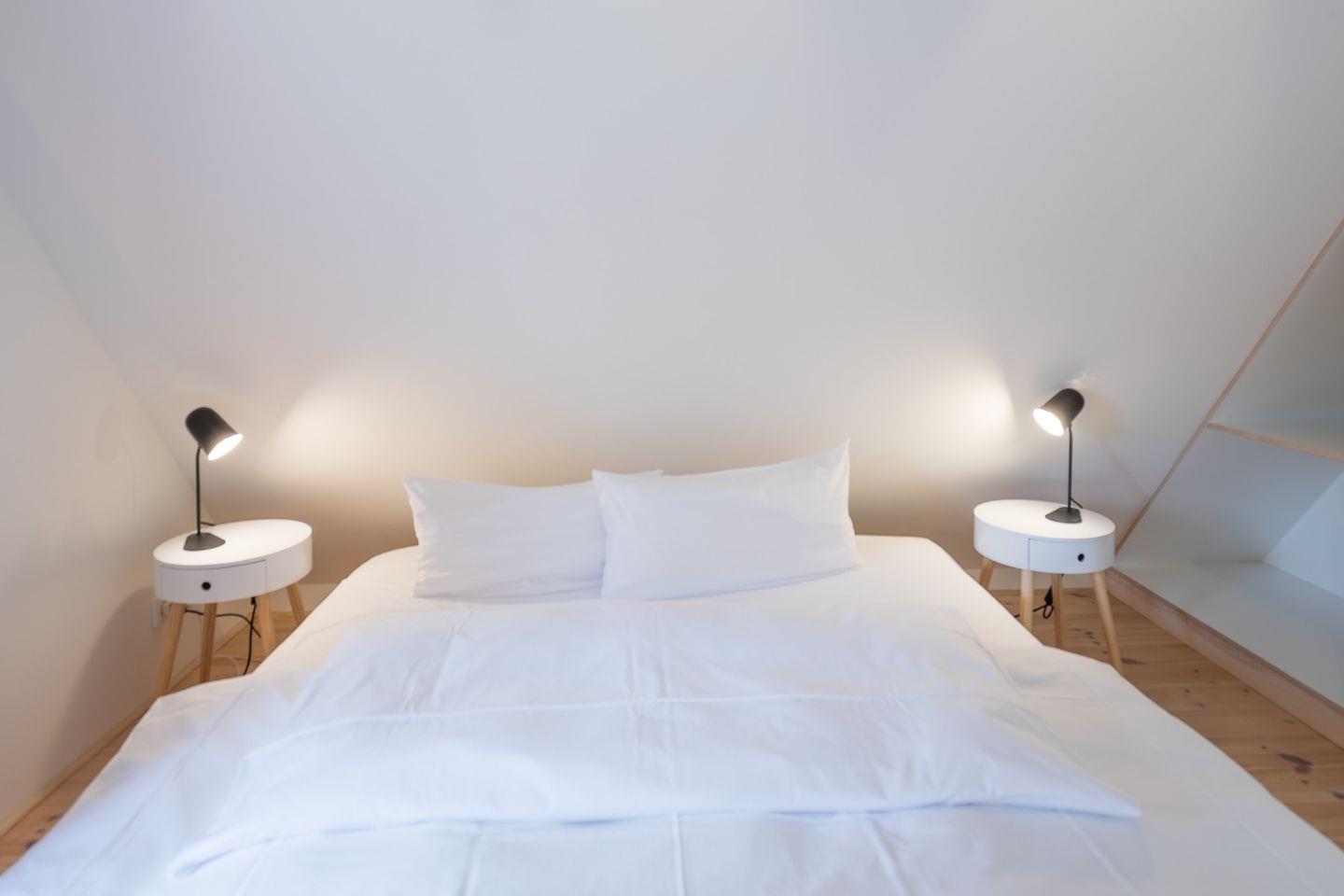 Über eine offene Holztreppe erreichen Sie den Schlafbereich: Das Ferienhaus verfügt über zwei Schlafzimmer und einen weiteren Schlafbereich im Dachgeschoss (über eine Leiter erreichbar) : Alle Schlafzimmer sind mit bequemen Doppelbetten (je 180 × 200) ausgestattet. Insbesondere das große Schlafzimmer hat einen offenen Charakter und lässt sich – wie auch das Dachgeschosszimmer, nicht komplett abdunkeln.