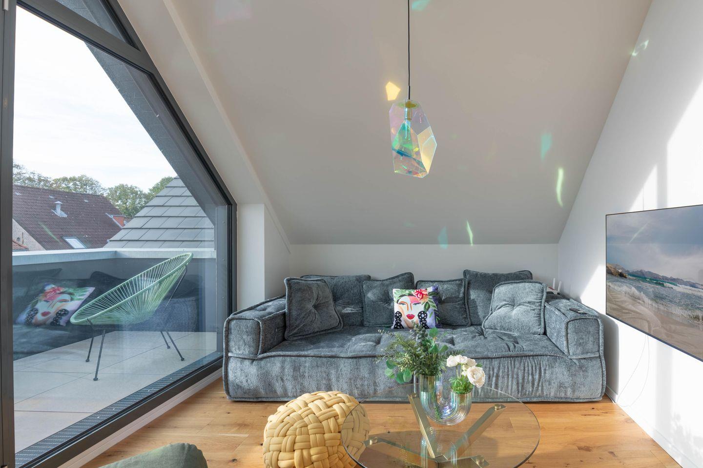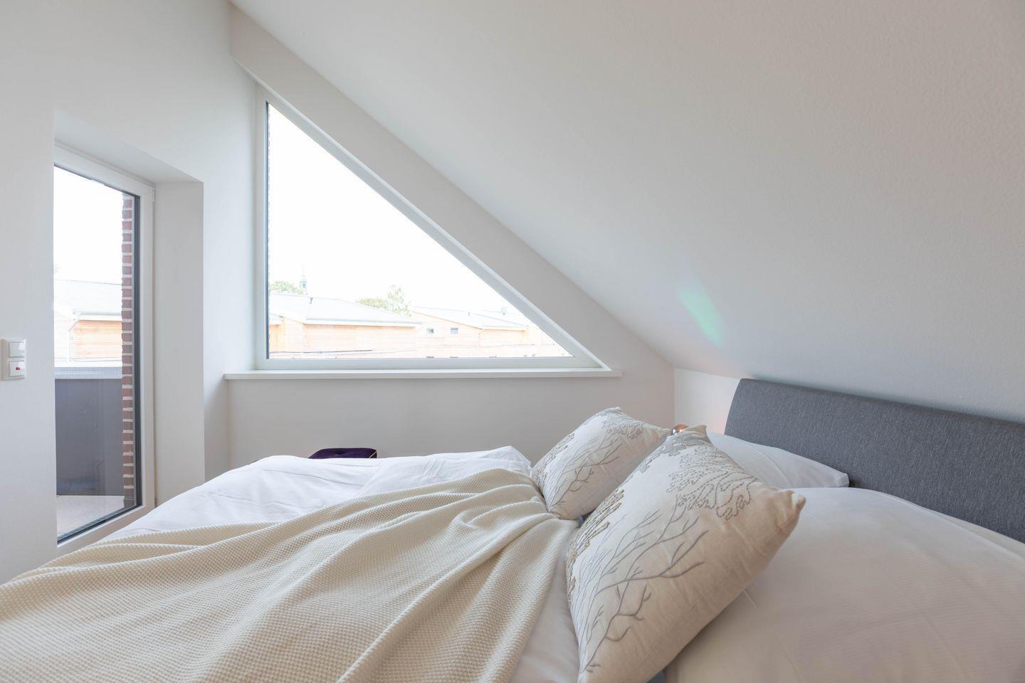 Über eine weitere Treppe erreichen Sie den großzügigen, hellen Wohnbereich mit TV, einer gemütlichen Sofaecke und einem Balkon. Das Masterschlafzimmer verfügt über ein weiteres Doppelbett (180 x 200), einen Balkon und ein Duschbad.