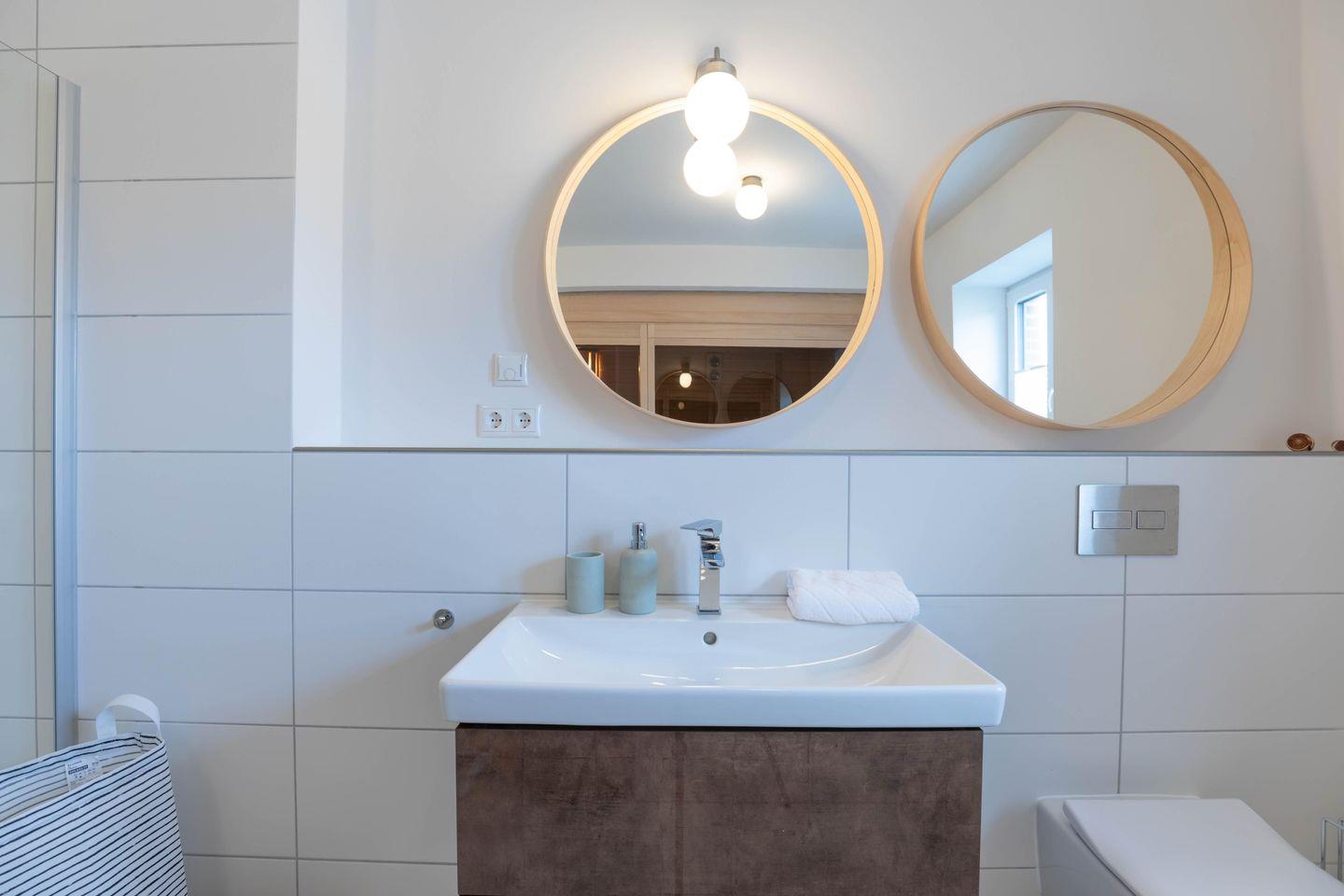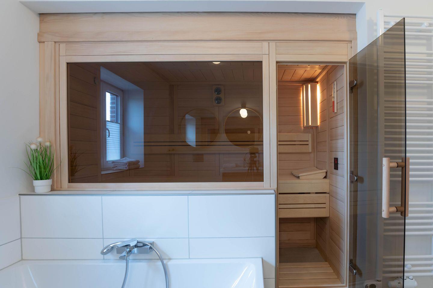 Ein Highlight ist das großzügige Badezimmer mit ebenerdiger Dusche, Badewanne, WC und großer Sauna.
