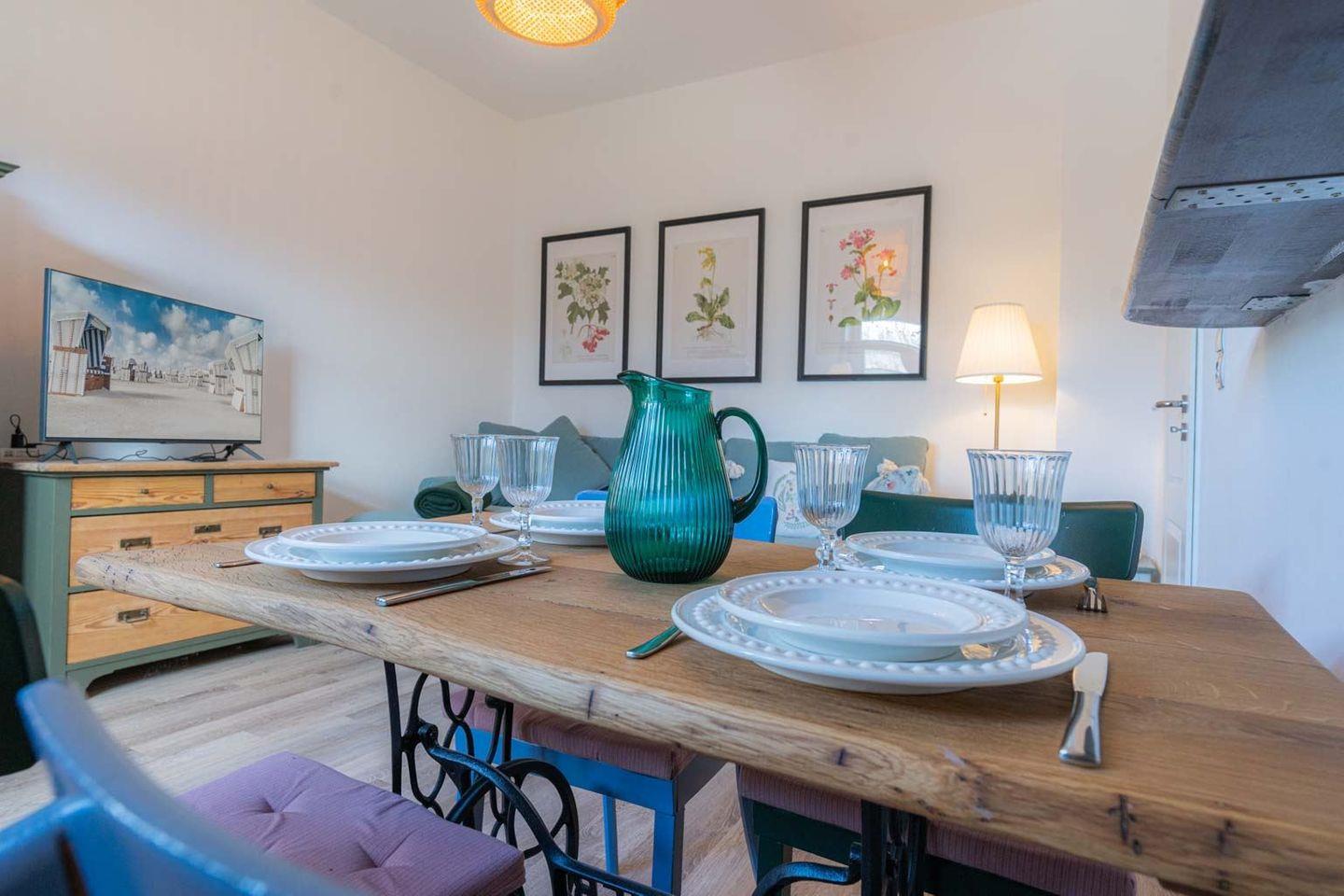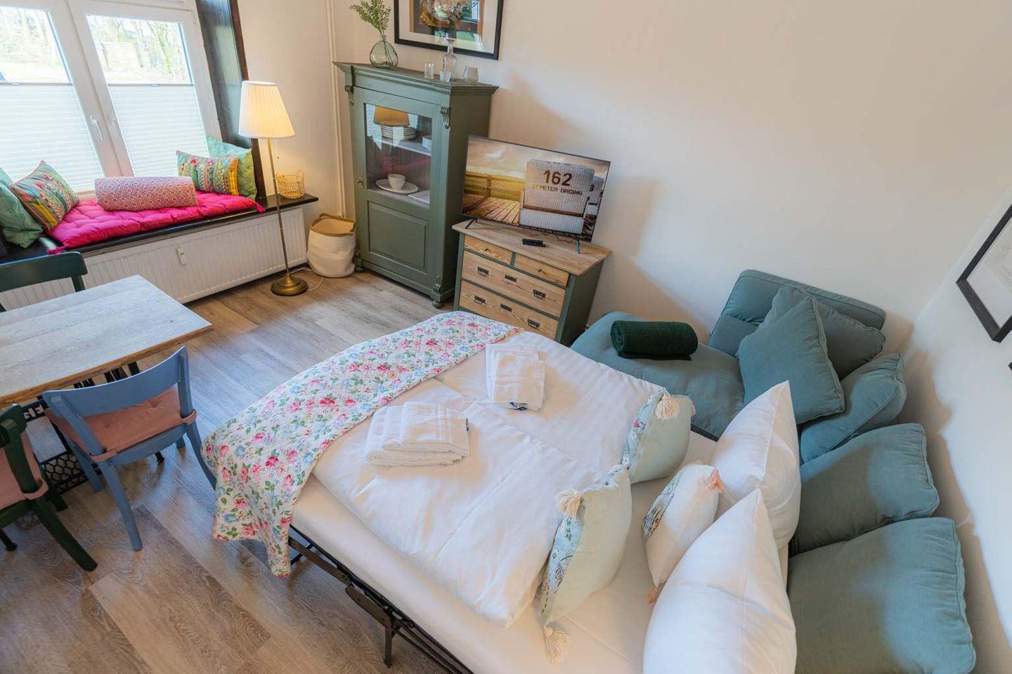 Wohnzimmer mit Schlafsofa (140 x 200 cm), Kommode, Essbereich für 4 Personen, Smart-TV (Magenta),