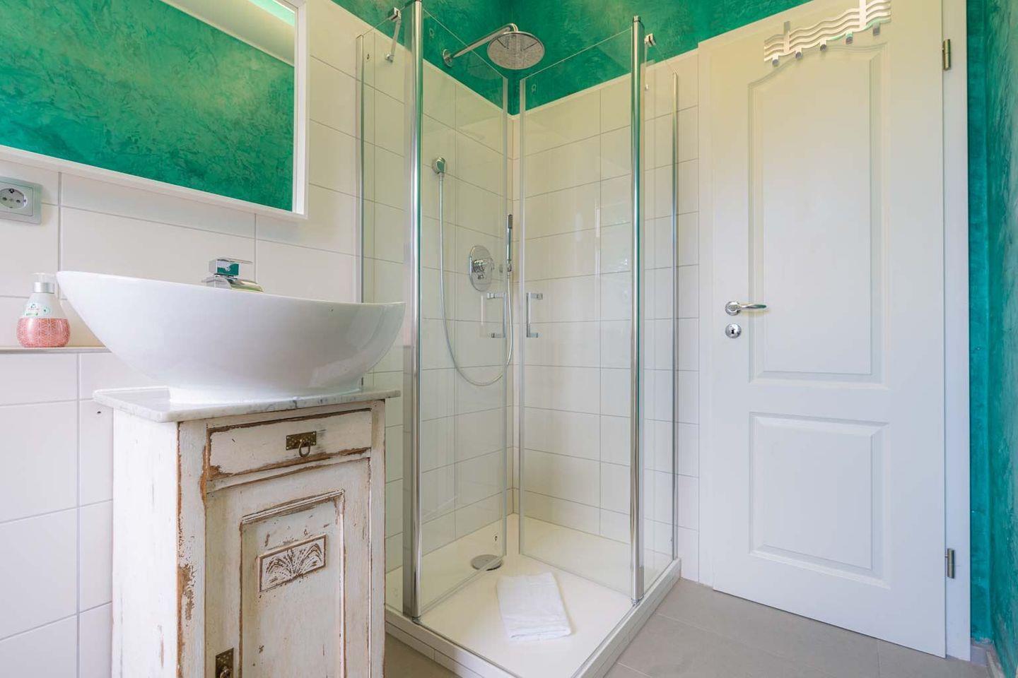 Helles Duschbad mit Tageslicht, WC, Waschbecken, Dusche mit niedriger Duschtasse, Regendusche und Handbrause