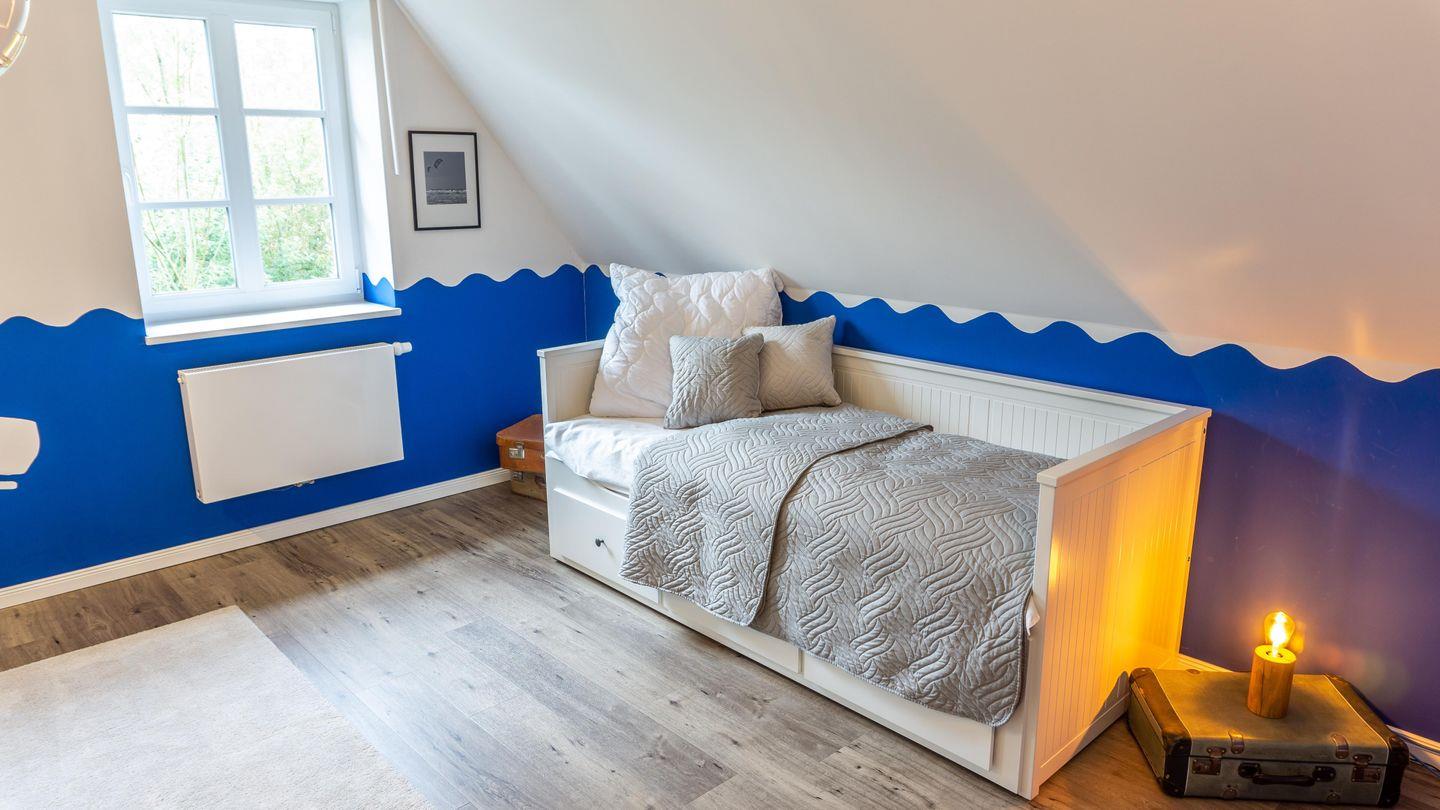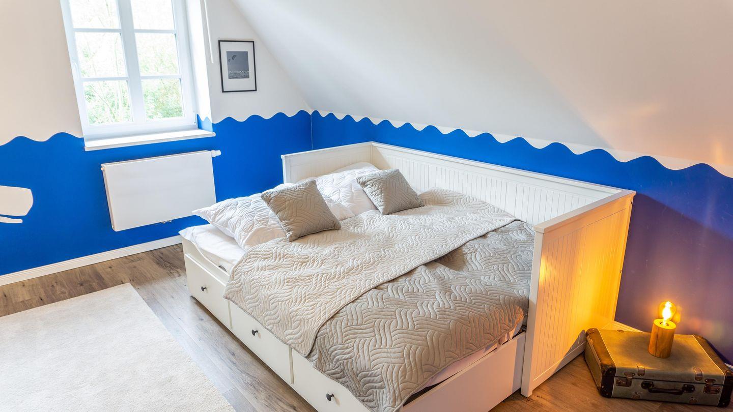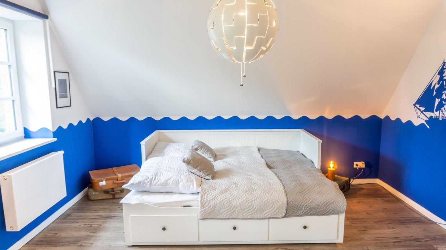 Zur Nachtruhe laden zwei behagliche Schlafzimmer (160 x 200 cm), mit ein Doppelbett und ein Hemnes-Bett (Kojenbett- ausziehbar zum Doppelbett auf gleicher Höhe 160 cm breit), ein.