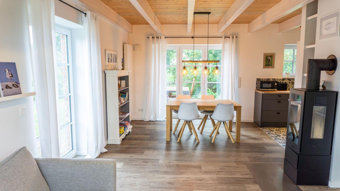 Im Herzen von Eiderstedt gelegen, ist unser Ferienhaus mit W-Lan der ideale Rückzugsort mit einem gemütlichen Wohnbereich, ausgestattet mit einem Kamin, der warme Gemütlichkeit verspricht. Die moderne, offene Küche mit Induktionsherd lädt zum gemeinsamen Kochen ein, während der angrenzende Essbereich zum Verweilen einlädt. Ein hochwertiges Vollbad mit Dusche und Badewanne, sowie ein zusätzliches Duschbad sorgen für Ihr Wohlbefinden. Eine Waschmaschine ist ebenfalls vorhanden.