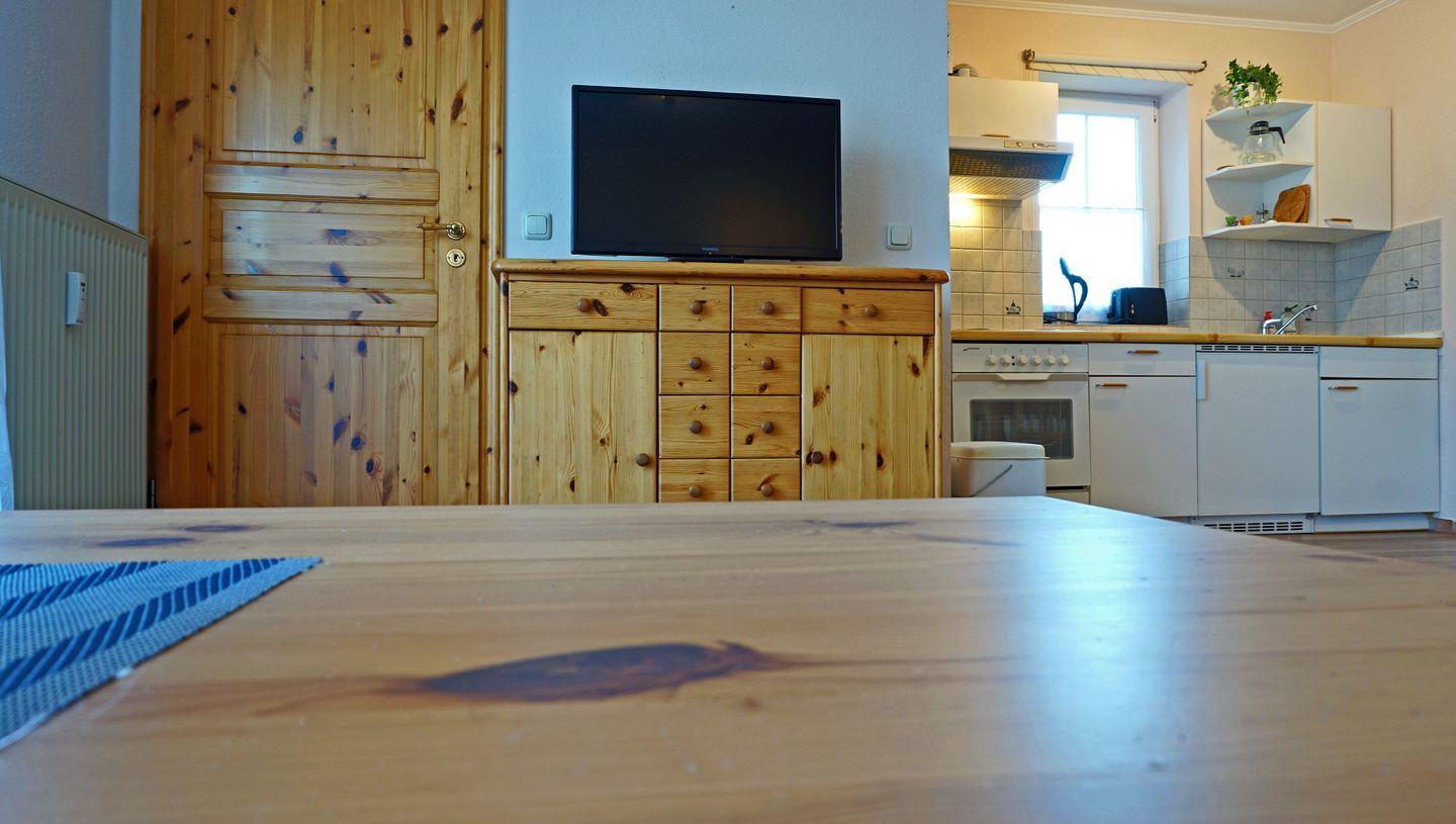 Der offene Wohnbereich mit Schlafsofa ist harmonisch in die Küche integriert und lädt mit einem gemütlichen Sofa, einem Sessel und einem TV zum Entspannen ein. Am Esstisch können Sie gemeinsam Ihre Mahlzeiten genießen. Die kompakte Küche ist mit allem ausgestattet, was Sie für die Zubereitung Ihrer Lieblingsspeisen benötigen. Für die Morgenstunden steht eine Kaffeefiltermaschine bereit. Ein Gefrierfach gibt es im Kühlschrank.