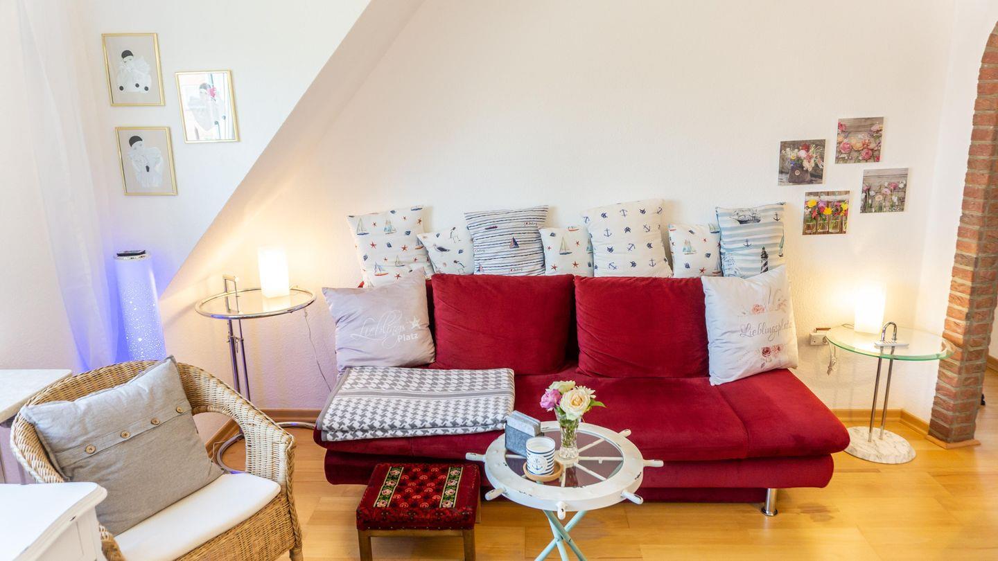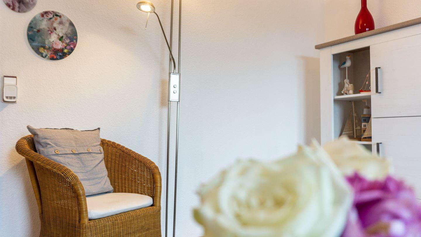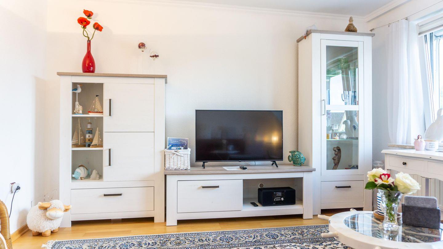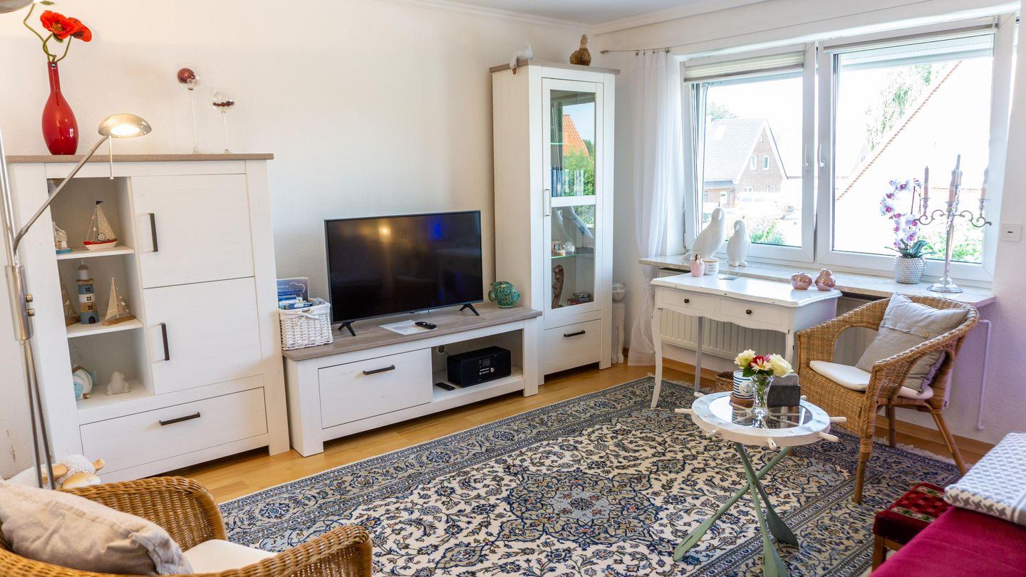 Insgesamt können 4 Gäste komfortabel untergebracht werden. Das Wohnzimmer ist gemütlich gestaltet und bietet eine Sofaecke, Sessel und moderne Unterhaltungselektronik wie einen Fernseher und ein Radio.