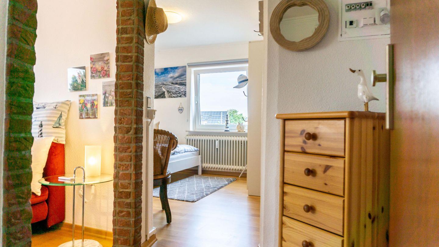 Die Wohnung befindet sich im ersten Stock und erstreckt sich über eine Ebene. Sie verfügt über ein separates Schlafzimmer, das mit einem bequemen Doppel-Bett (200x180cm) für erholsamen Schlaf sorgt. Zusätzlich stehen weitere Schlafmöglichkeit zur Verfügung im Wohnzimmer auf einem Schlafsofa (200x160cm) für 2. Bettwäsche wird gestellt.