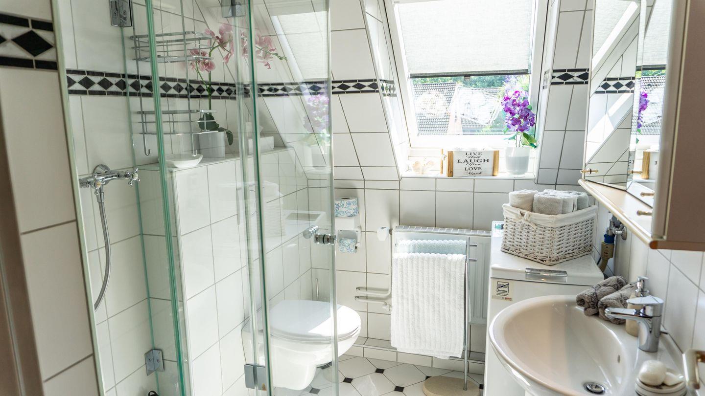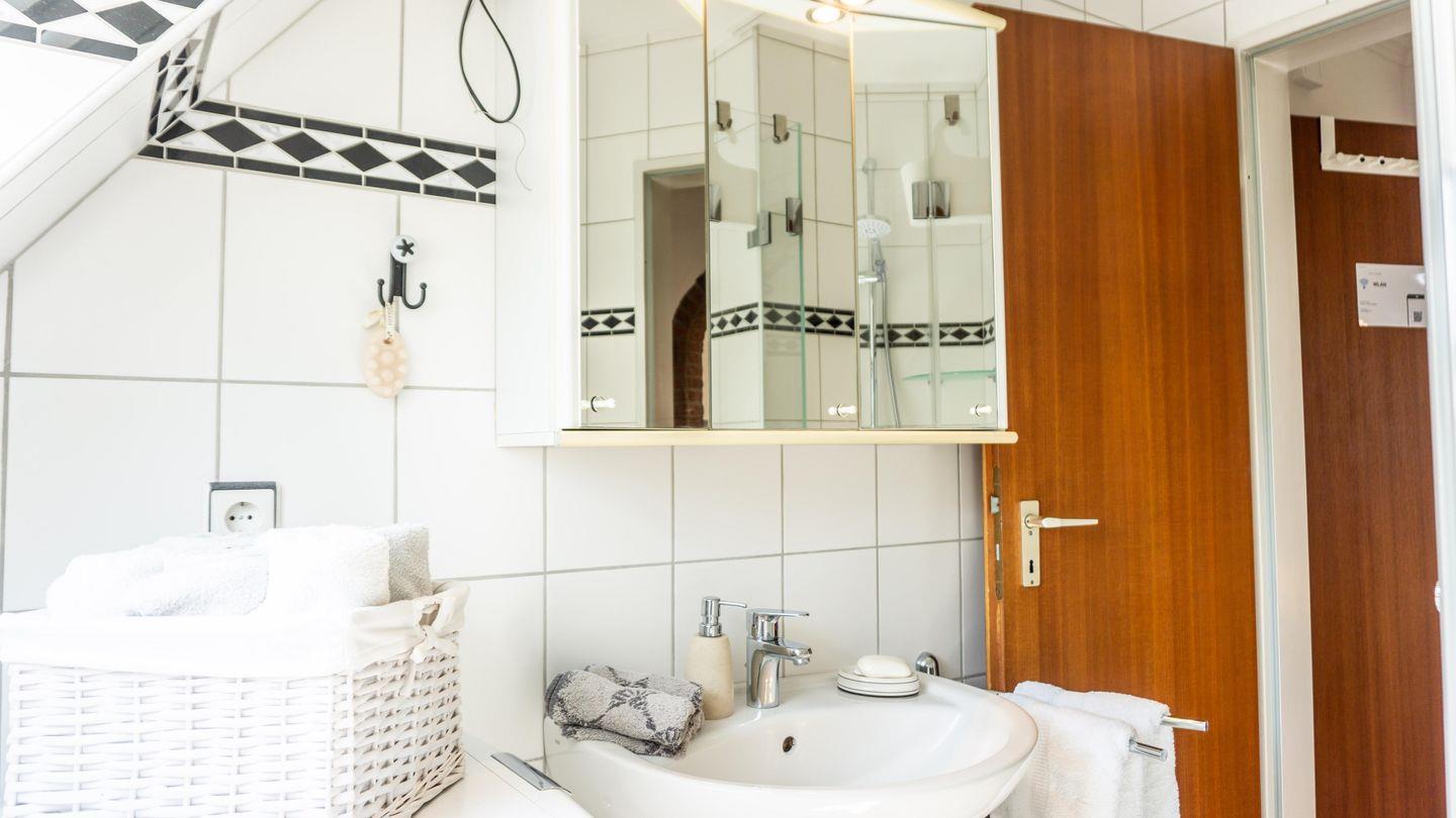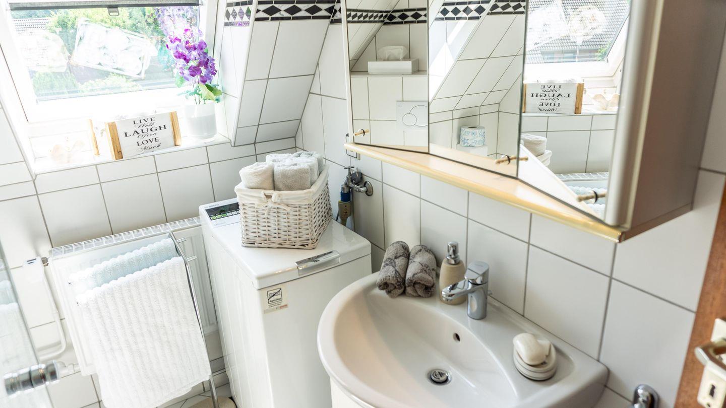Das Badezimmer ist mit einer Dusche, einem WC, Waschbecken, Kosmetikspiegel, Haartrockner und einem Fenster ausgestattet. Sämtliche Badutensilien wie Handtücher, Badetücher, Bademantel sowie Seife werden bereitgestellt. Für längere Aufenthalte stehen eine Waschmaschine, Wäscheständer, Bügelbrett, Bügeleisen und Staubsauger zur Verfügung.