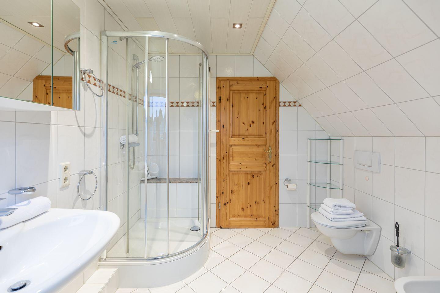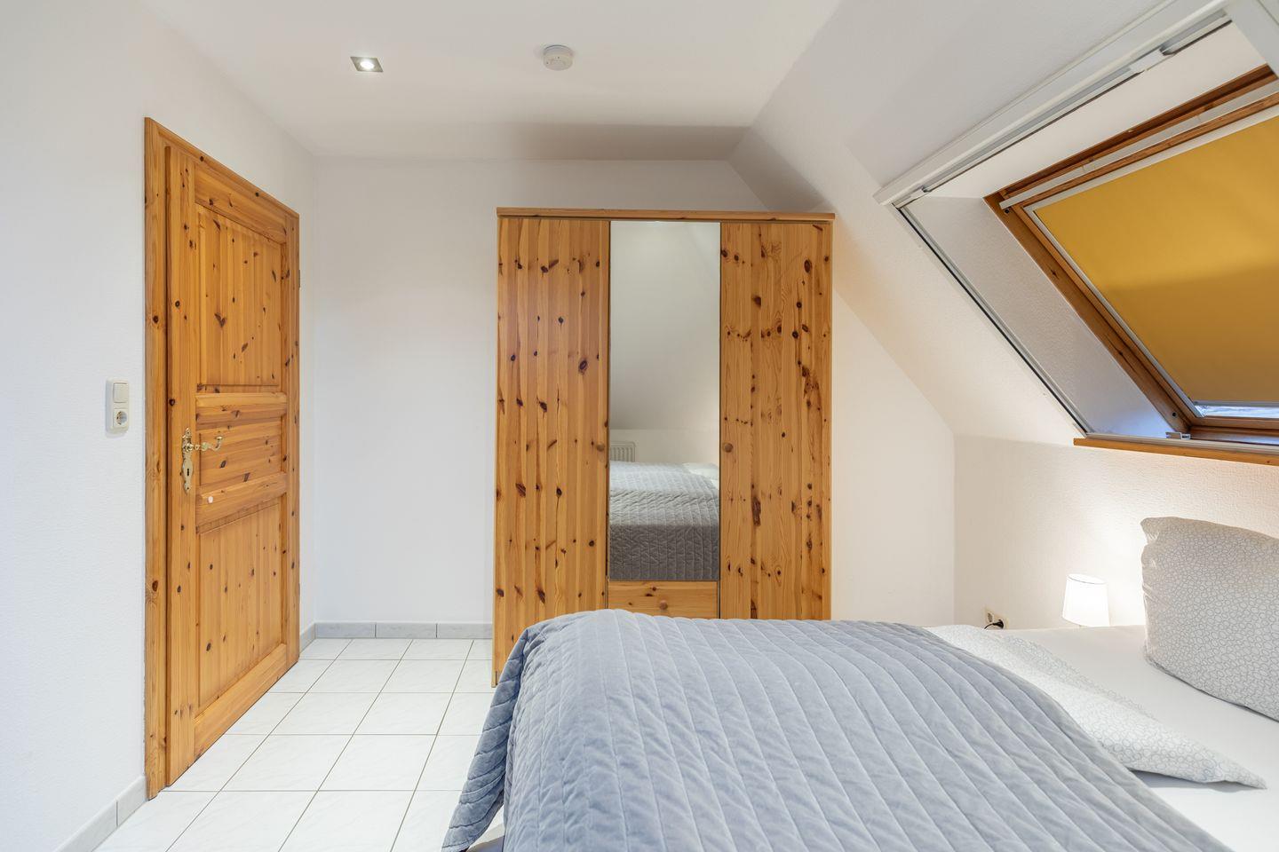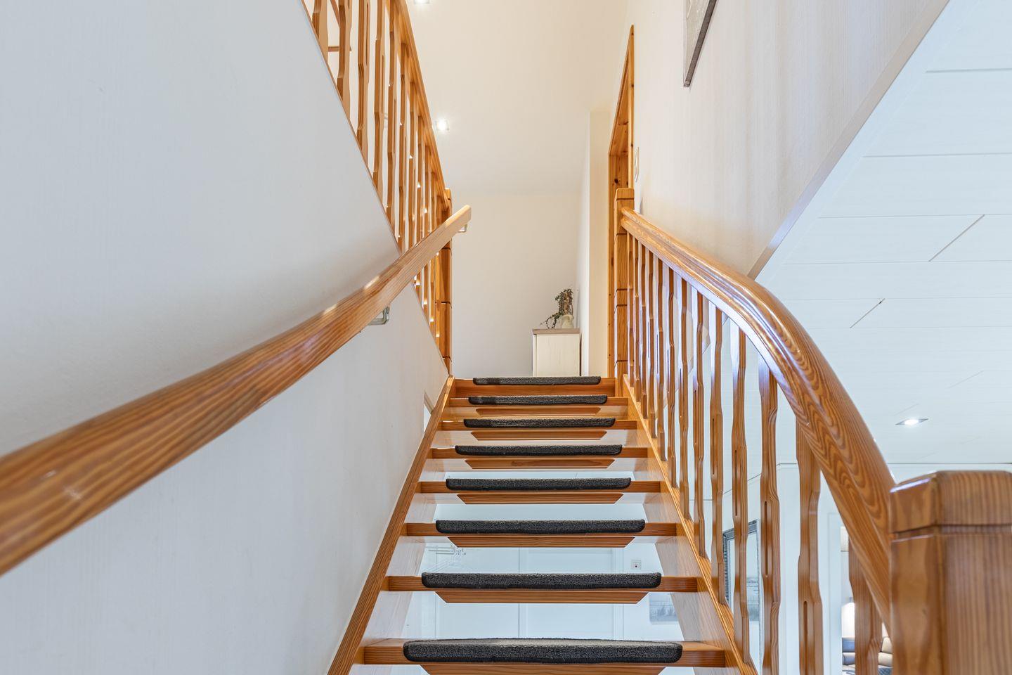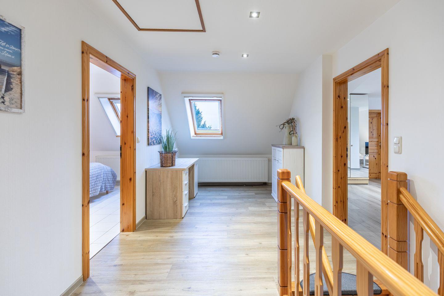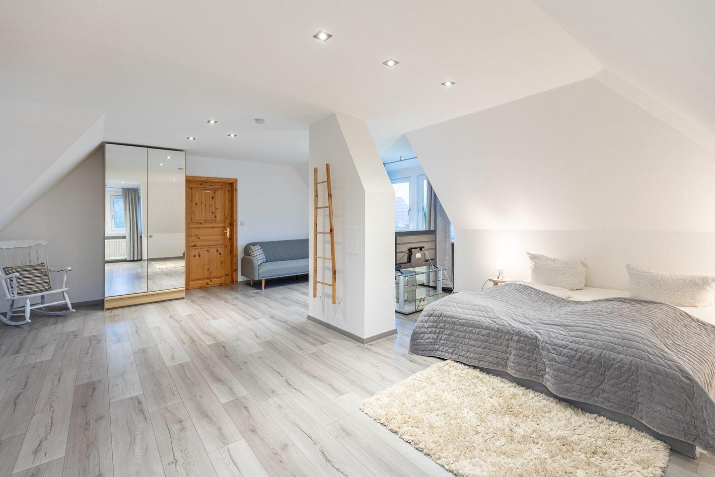 Über die offene Holztreppe gelangen Sie ins Dachgeschoss, wo Sie weitere Schlafräume, ein zweites Badezimmer sowie ein großer Wohn- und Schlafbereich mit zusätzlicher TV-Ecke erwarten.