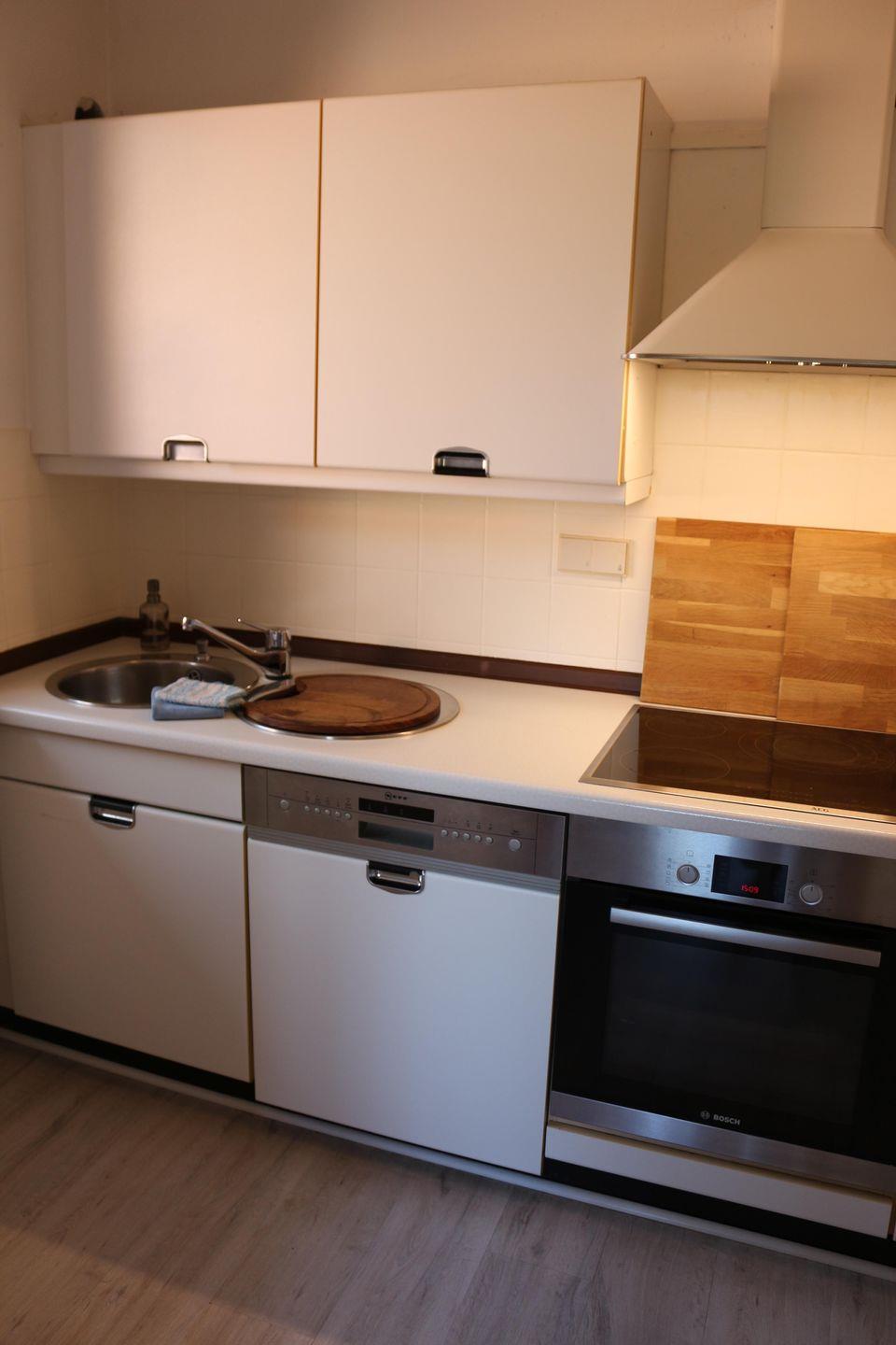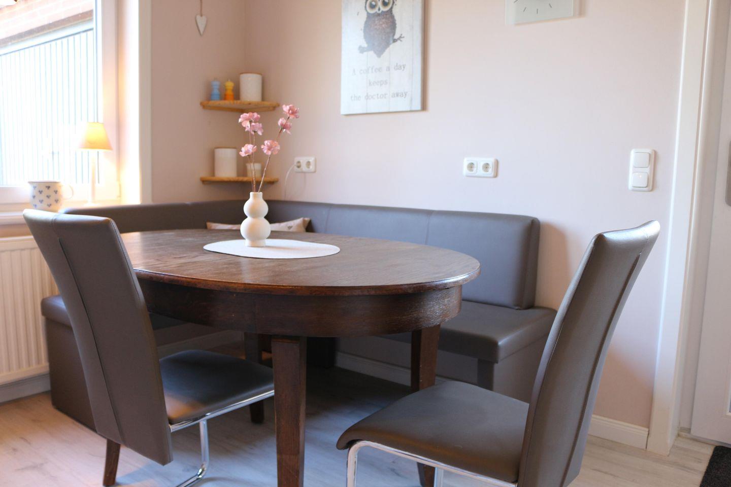 Die Küche ist voll ausgestattet und auf Selbstversorgung ausgelegt: Ceranherd, Backofen (Elektroanschluss), Mikrowelle, Kühlschrank mit Gefrierfach, Spülmaschine sowie Kaffeemaschine, Wasserkocher und Toaster. Küchenutensilien, ebenso eine Erstausstattung. Für längere Aufenthalte oder Familien praktisch: Waschmaschine (zur Eigennutzung), Bügelbrett, Bügeleisen und Wäscheständer.