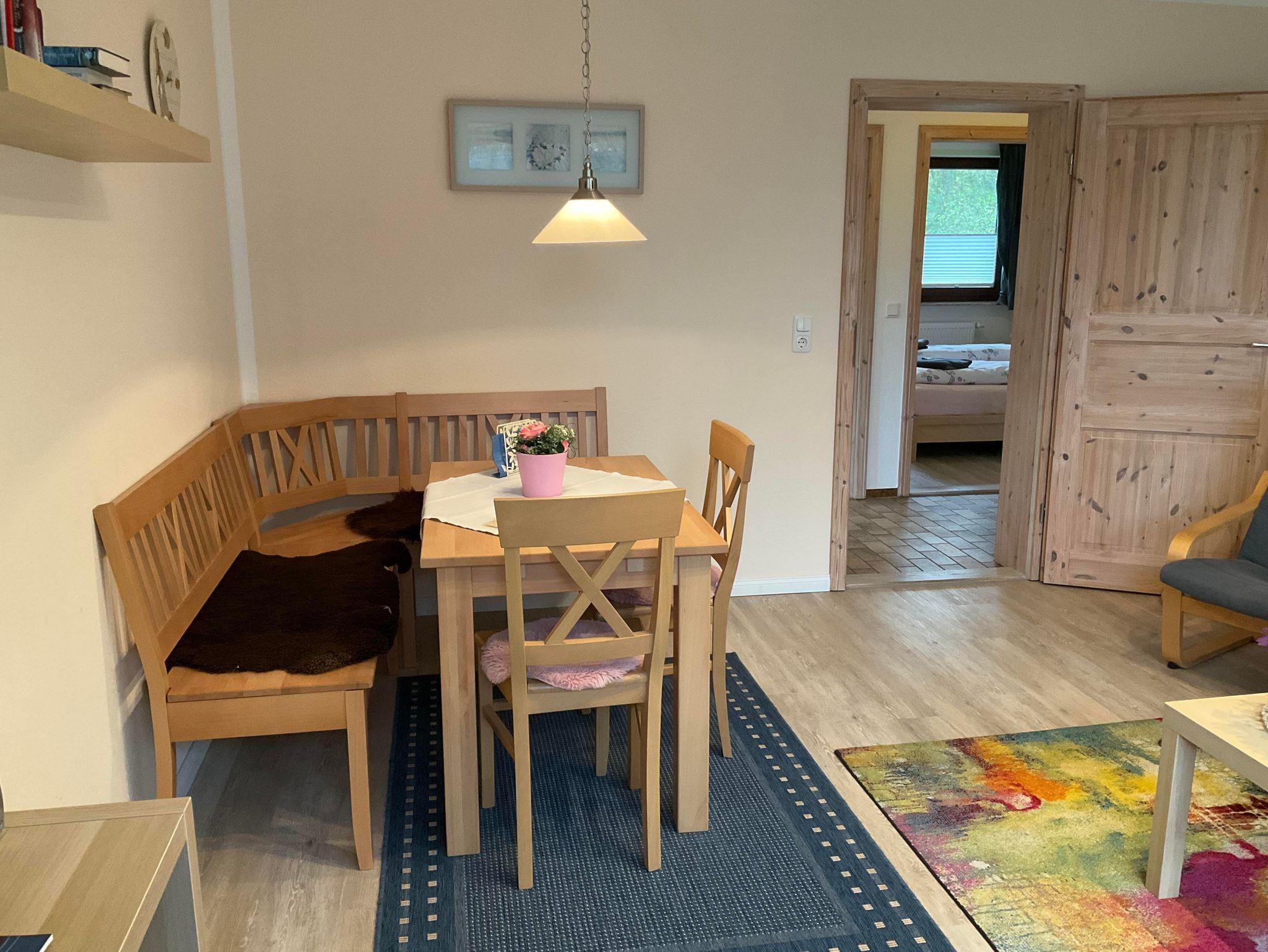 Diese Wohnung ist ca. 40 m² groß und hat einen Schlafraum für 2 Personen mit Doppelbett, Bettdecken 140 x 200 cm (die Betten sind 80 x 200 cm groß) und einen Wohn-/Essraum mit einer bequemen Schlafcouch, Bad mit Dusche und WC, Zugang zur Terrasse über den Wohnraum. Die Küche ist ausgestattet mit Cerankochfeld, Backofen, Mixer, Toaster, Kaffeemaschine, Wasserkocher, Eierkocher, Kühlschrank mit Gefrierfach, Fernseher, kleine Musikanlage.