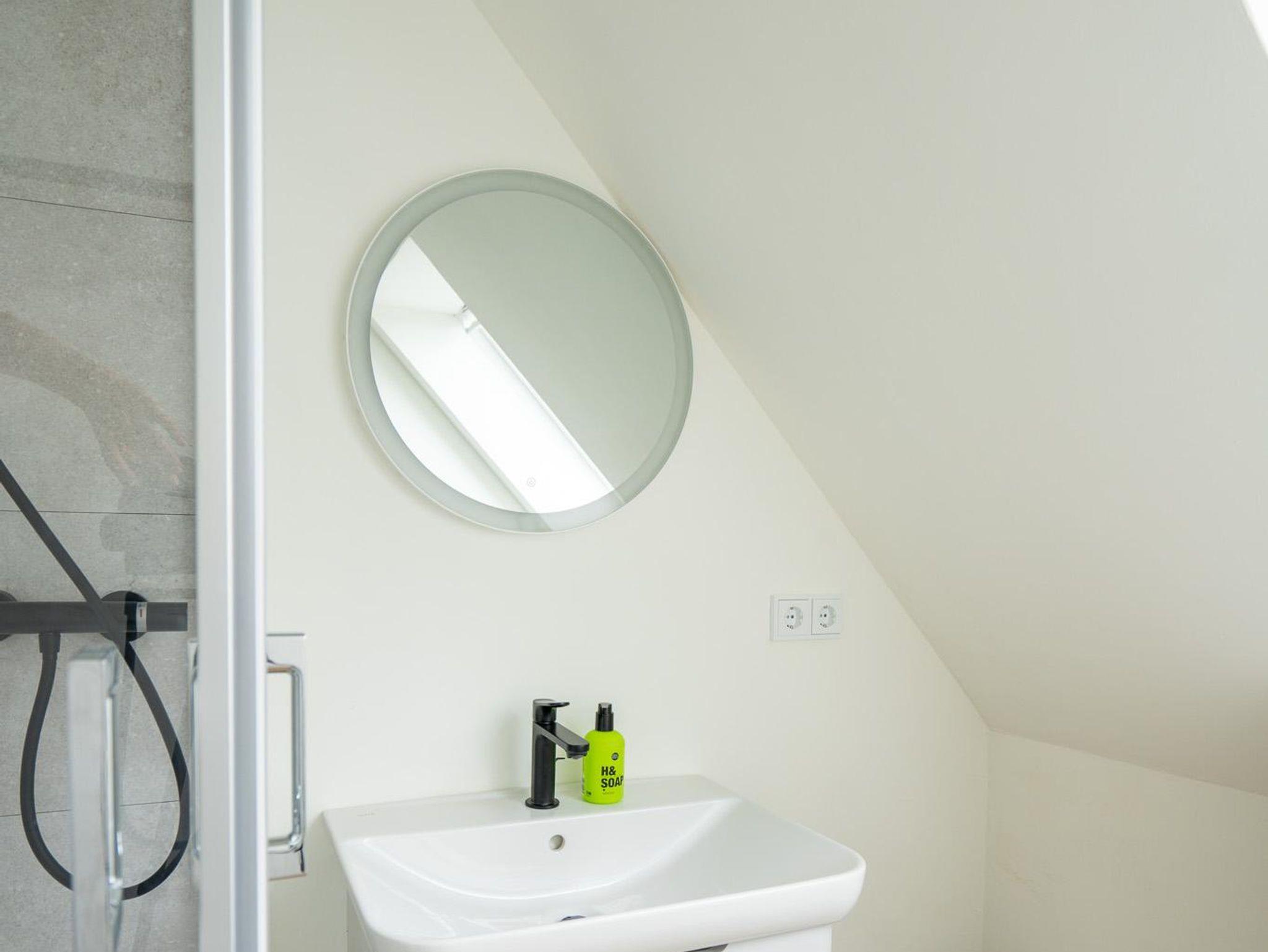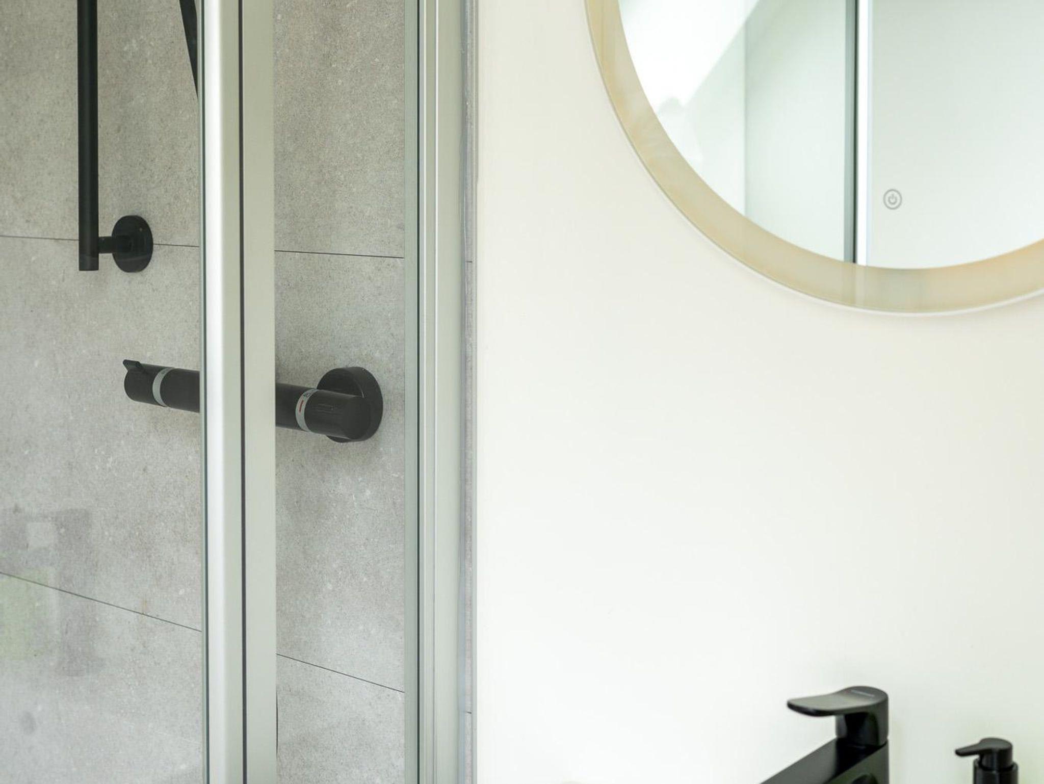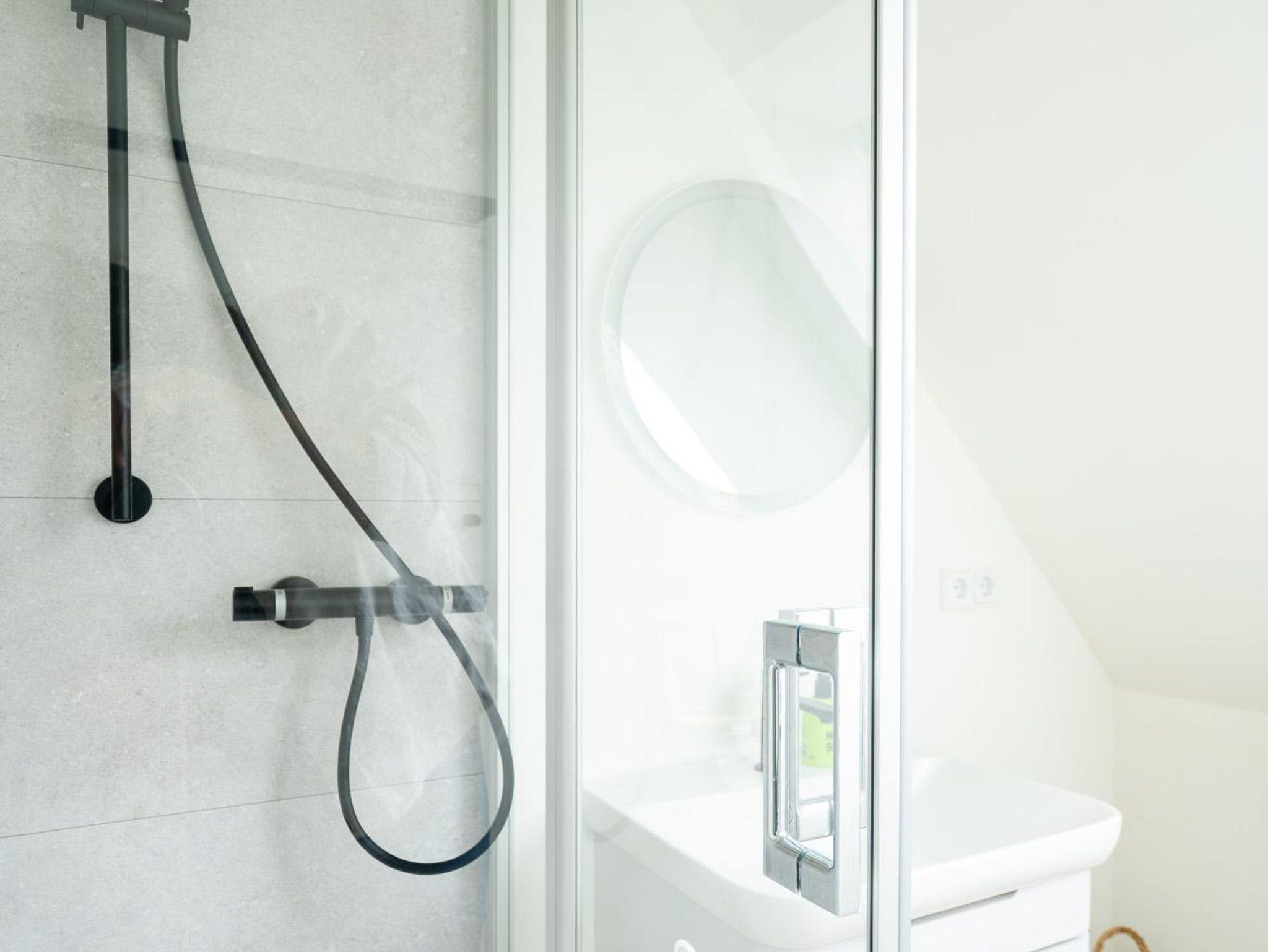 Badezimmer:Bad: Dusche mit tiefer Duschwanne in der die kleine Kinder baden können. Waschbecken und WC, Ablagefläche und Fön.