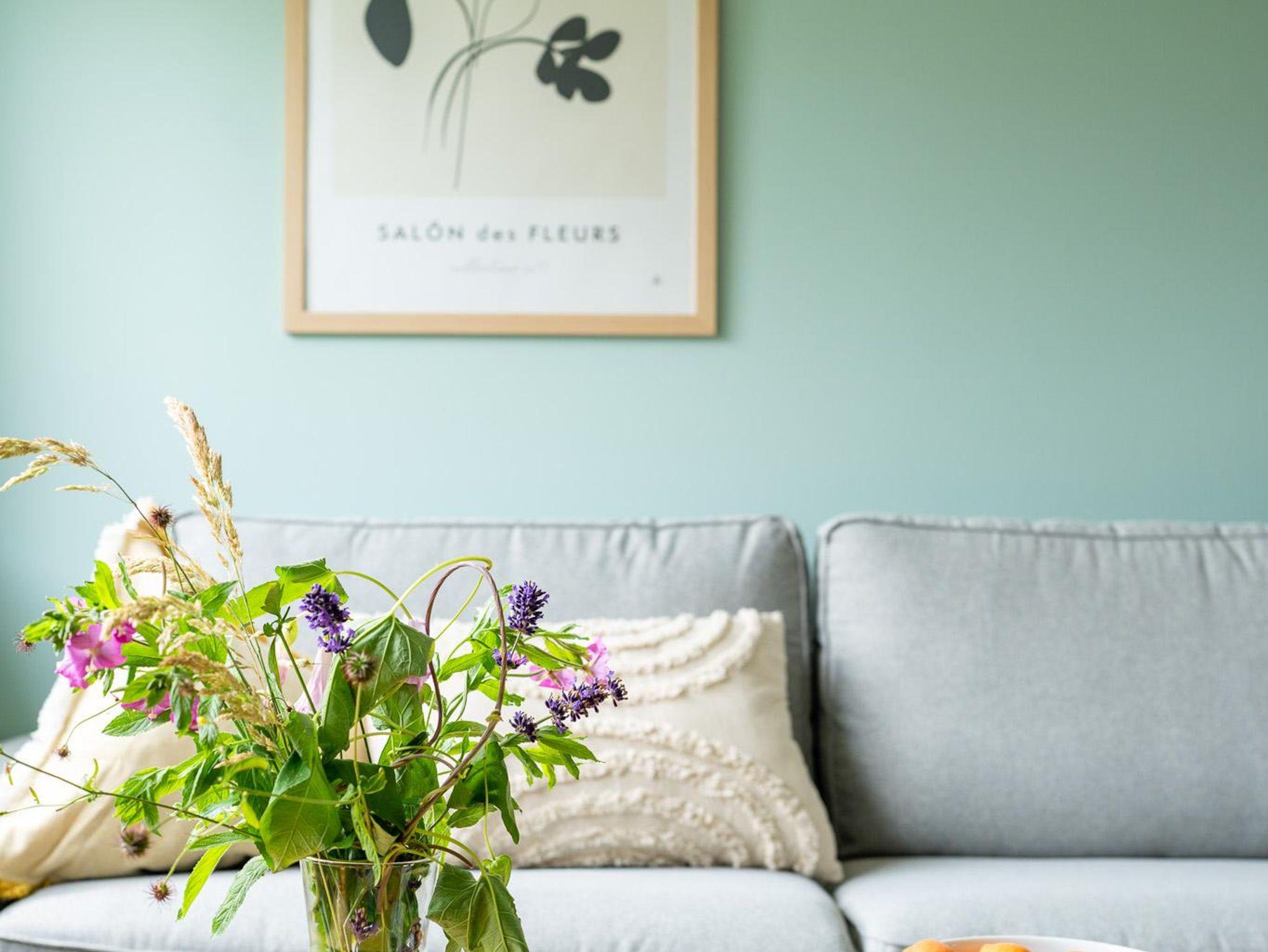 Wohnbereich:Komfortables Ambiente: Gemütliche Sitzgarnitur mit Couchtisch und Stehlampe.