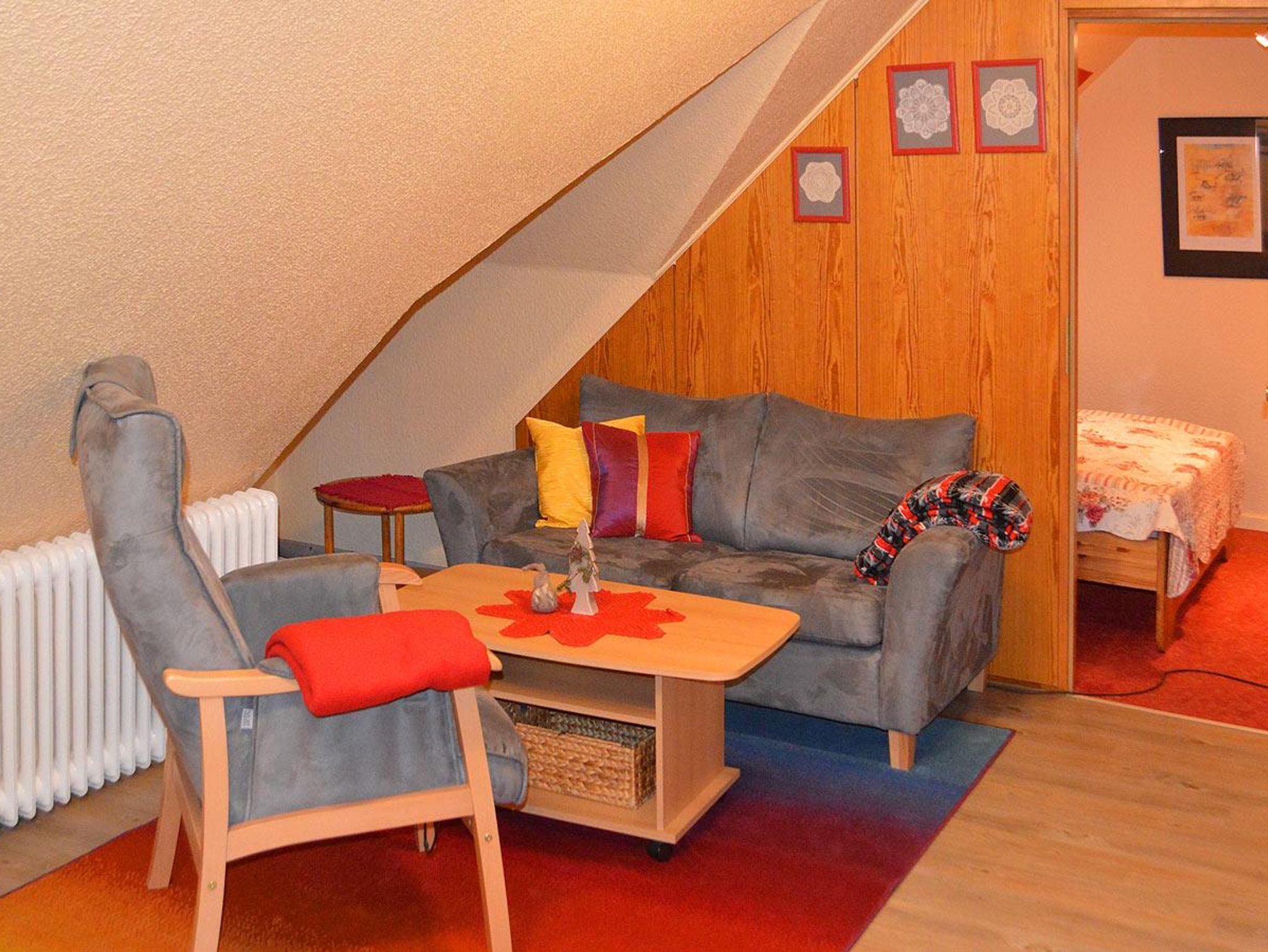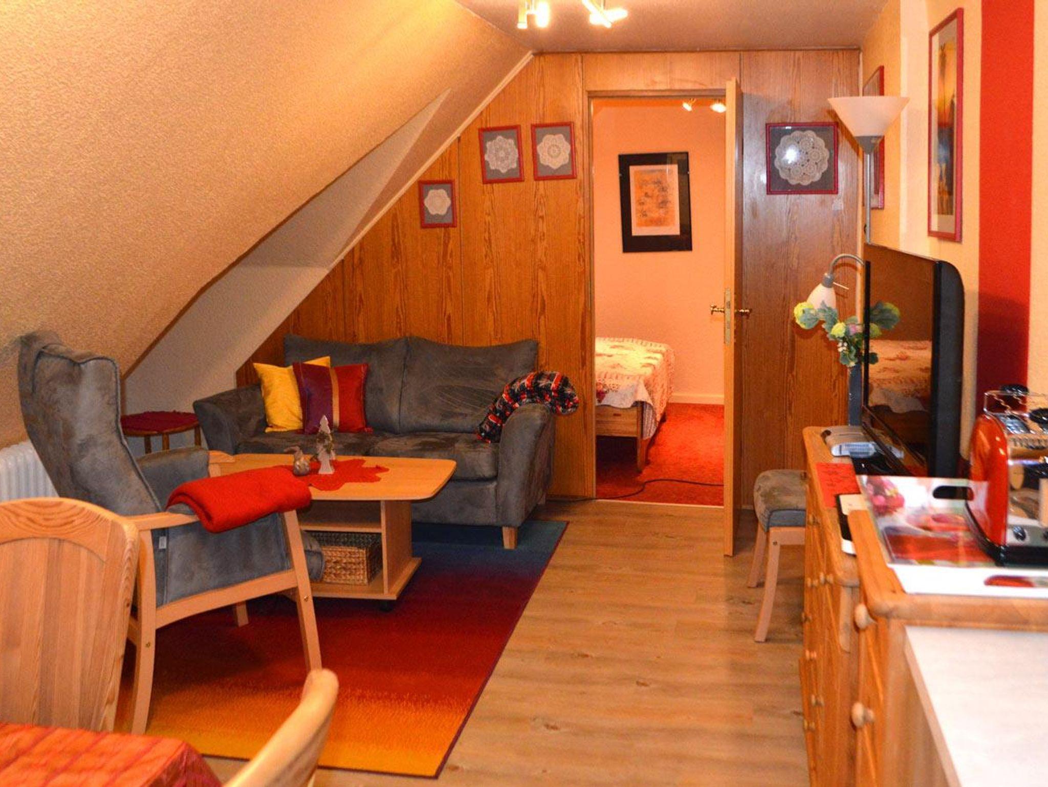 Die behagliche Ferienwohnung hat einen Wohn/Essraum, eine kleine Küche, 1 Elternschlafzimmer mit Doppelbett, Dusche/WC. 1 Kinderzimmer mit 2 Betten. Farb-TV und Stereoanlage vorhanden. Auf Wunsch auch Bettzeug für Allergiker Waschmaschine und Trockner für alle Gäste im Haus (gegen Gebühr).