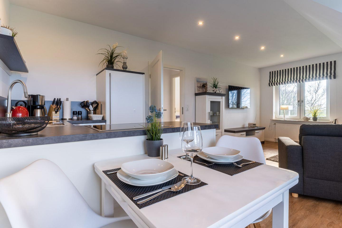 Die Wohnung ist geschmackvoll eingerichtet und bietet Platz für bis zu 2 Personen. Der offene Wohn-Essbereich ist mit einem gemütlichen Sofa, einem Esstisch und einer voll ausgestatteten Küche ausgestattet.