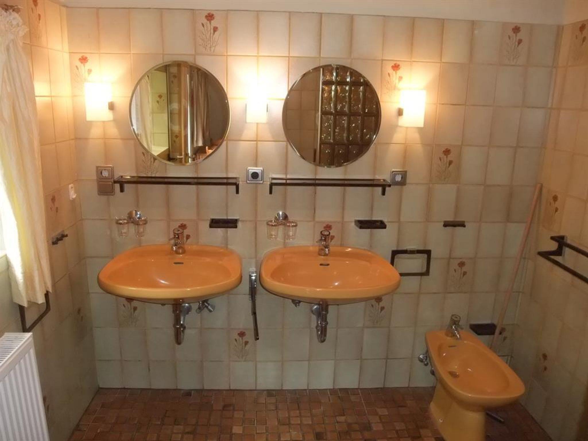 Bad mit Dusche, 2 Waschbecken, Bidet und WC.