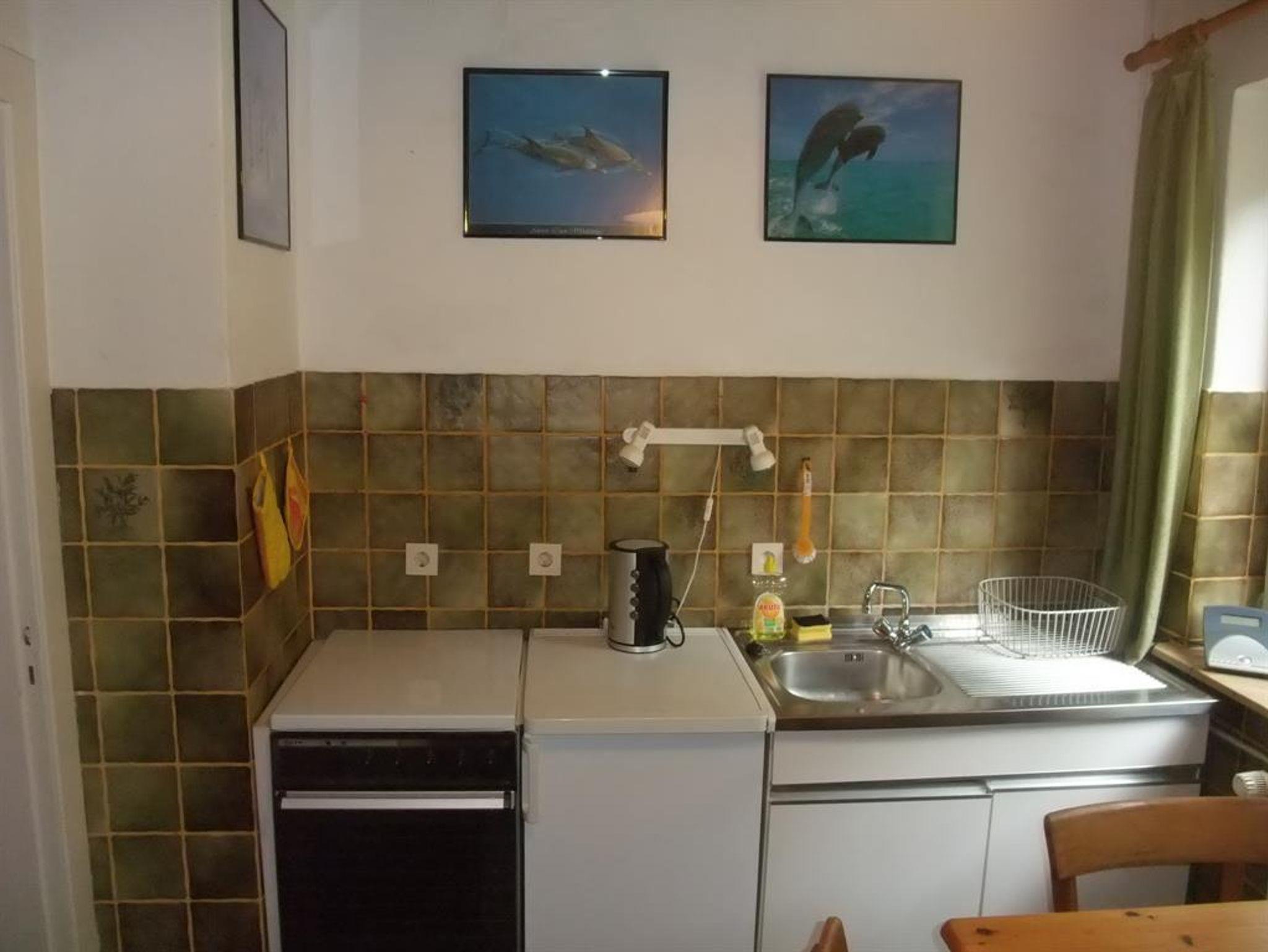 Küche mit Mikrowelle, Ceranherd, Toaster, Kaffeemaschine.