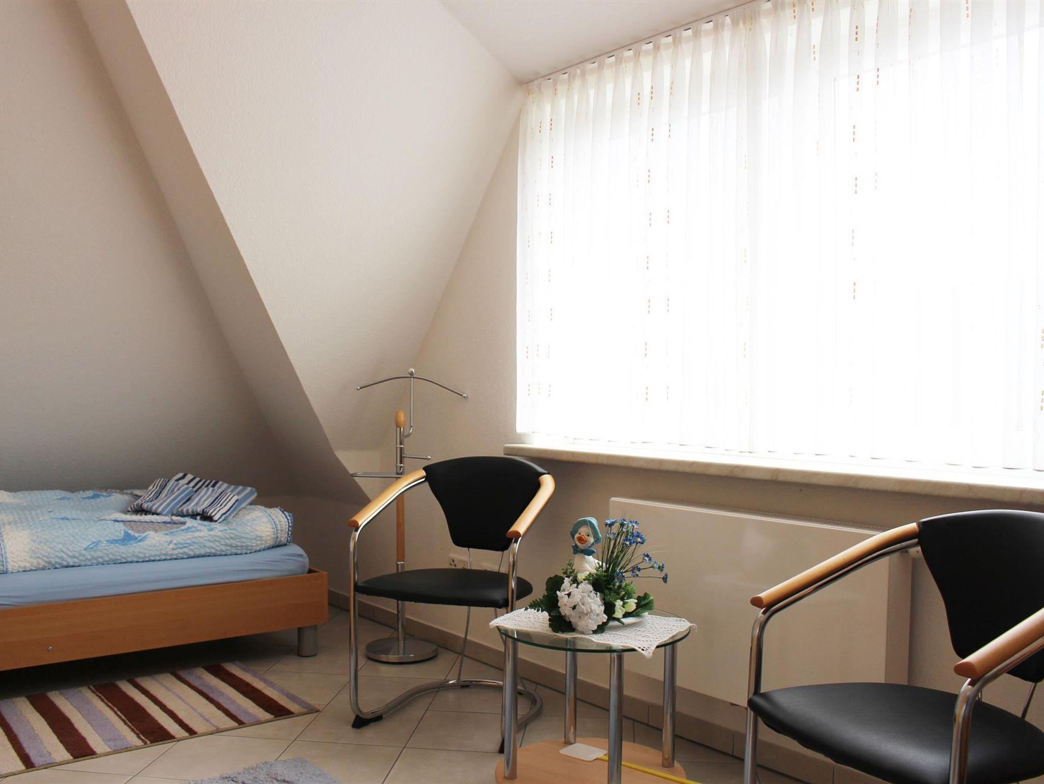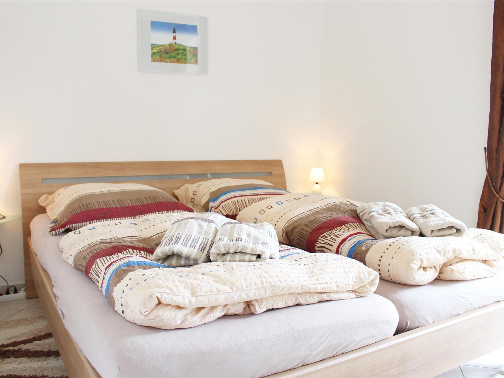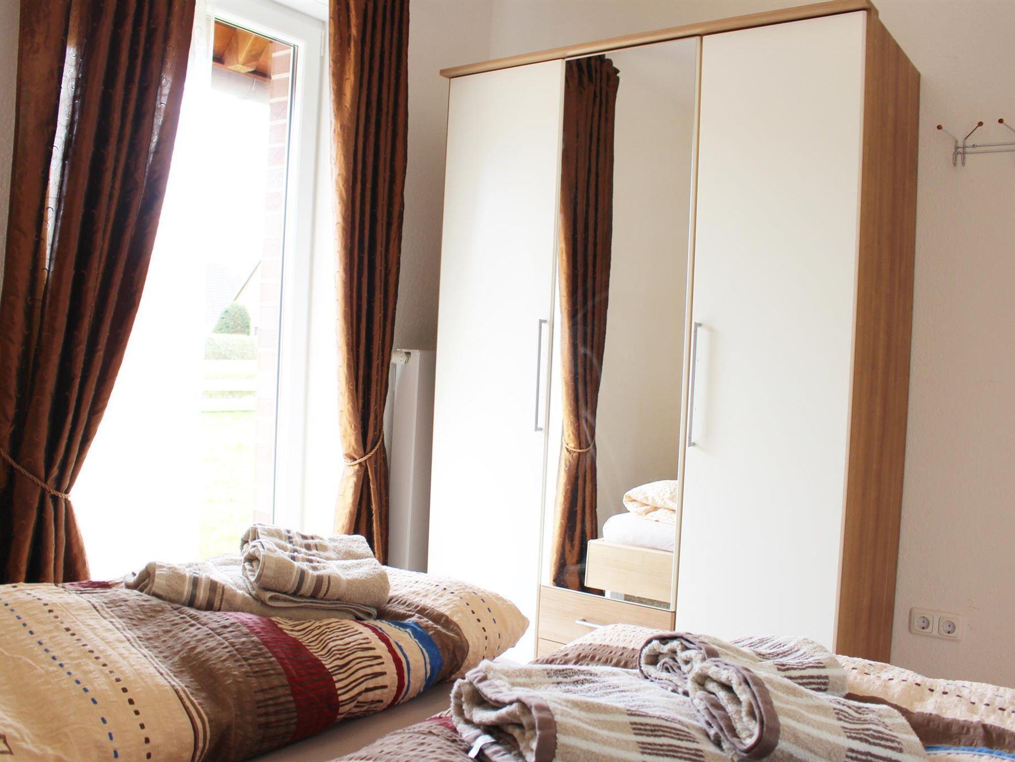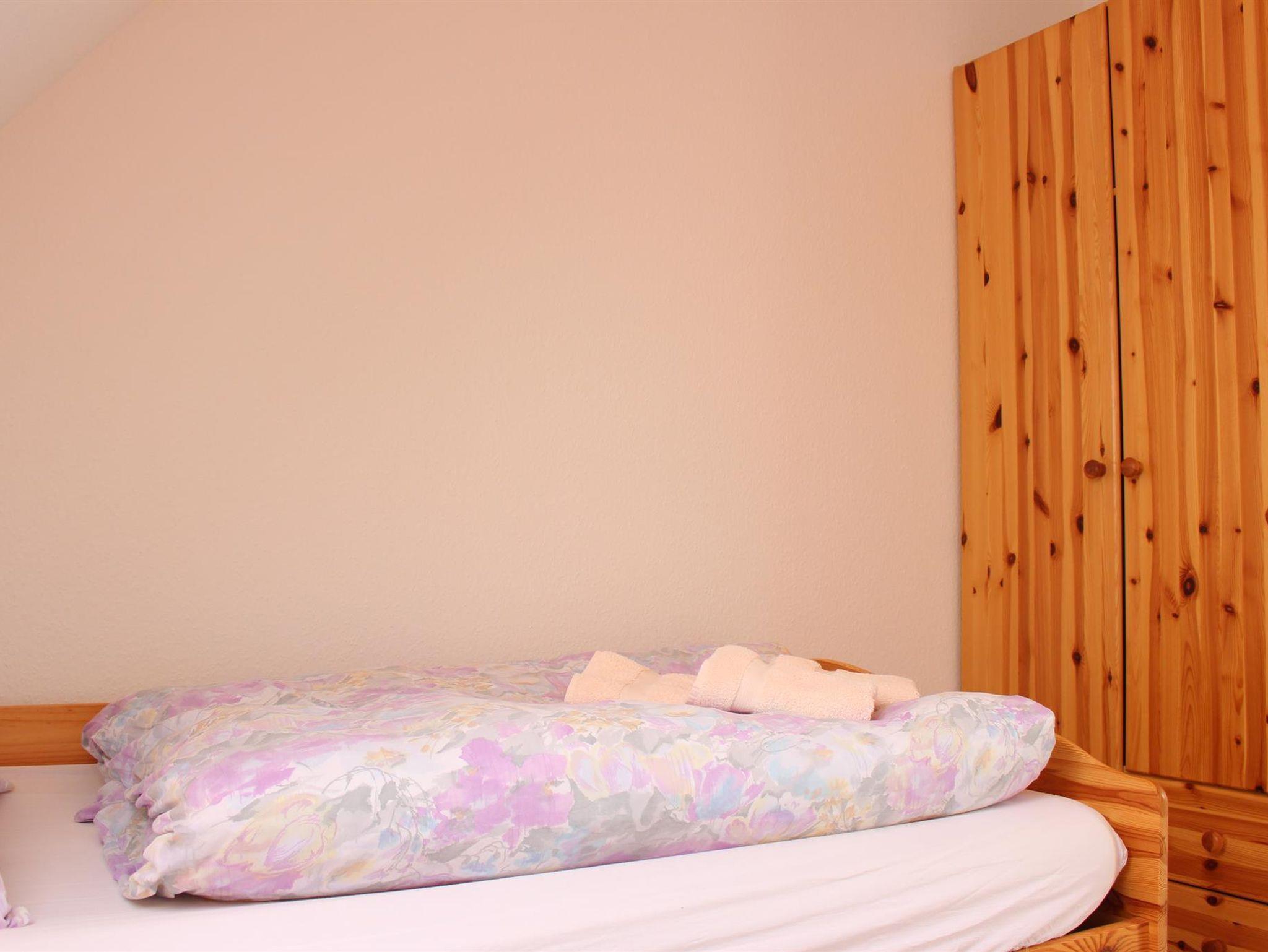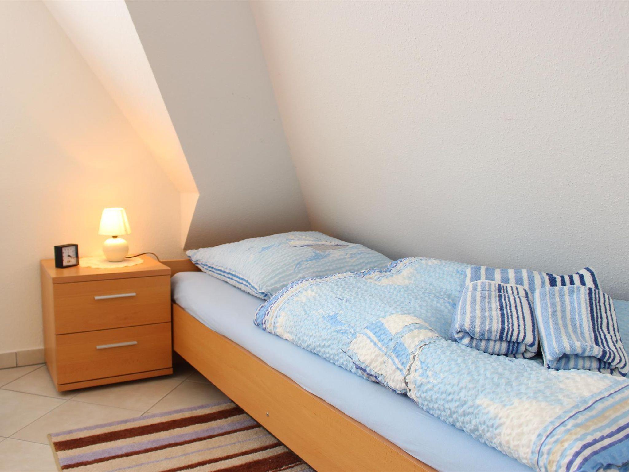 Im Erdgeschoss befinden sich das lichtdurchflutete Wohnzimmer mit offener moderner Küche und großem Esstisch von dort kann man auch auf die Terrasse. Im Erdgeschoss ist ebenso ein Flur mit Garderobe, ein Schlafzimmer mit Doppelbett und ein Duschbad. Die beiden Bäder, eines im EG das andere im OG, sind großzügig gestaltet und bieten genügend Platz für Ihre Utensilien.Alle Räume im Erdgeschoss sind gefließt und die Bäder verfügen über Fußbodenheizung.Über eineTreppe gelangt man in das Obergeschoss mit zwei großzügigen Schlafzimmern.Ein Doppelzimmer mit 2 Einzelbetten und ein Einzelzimmer
