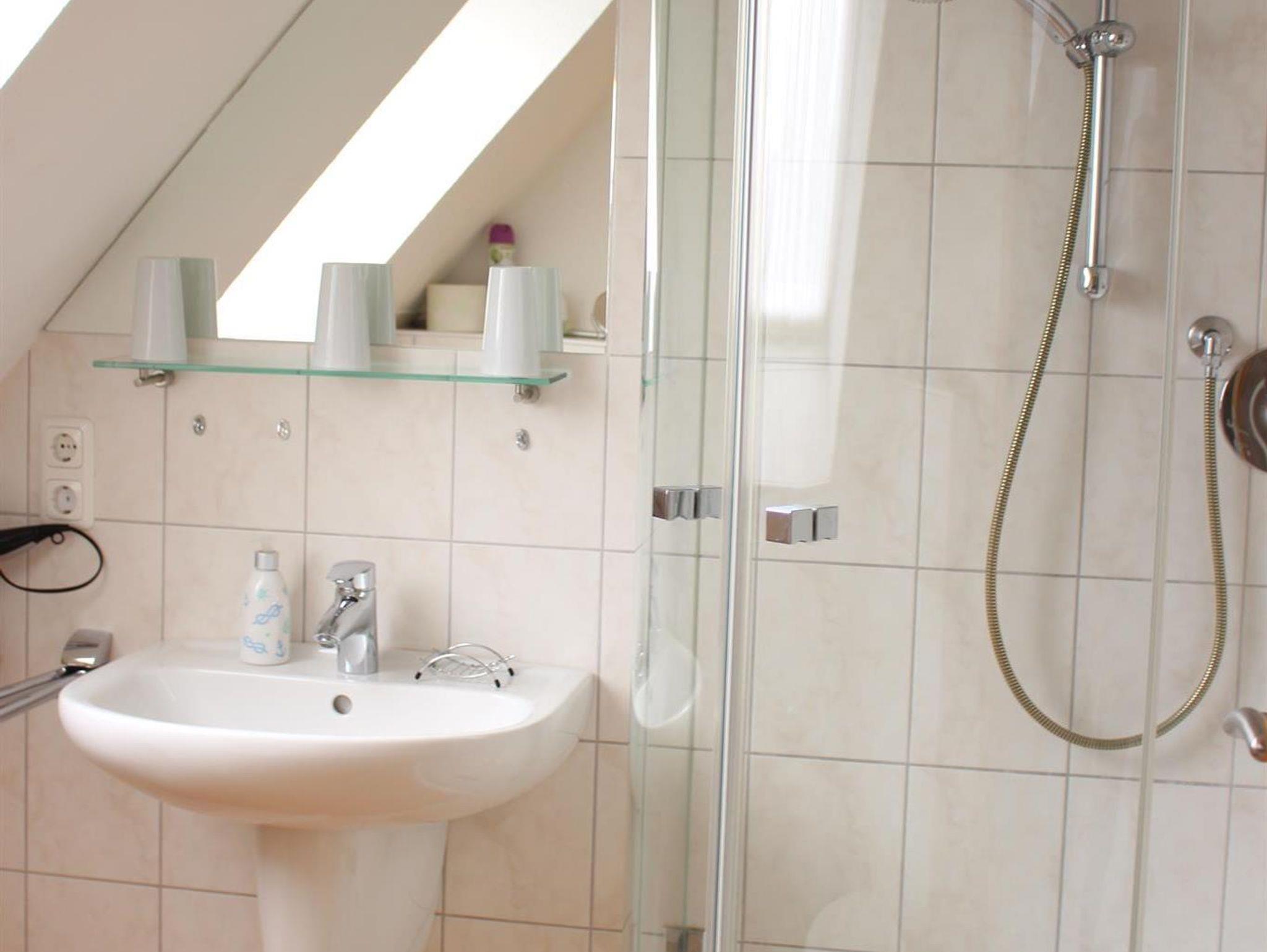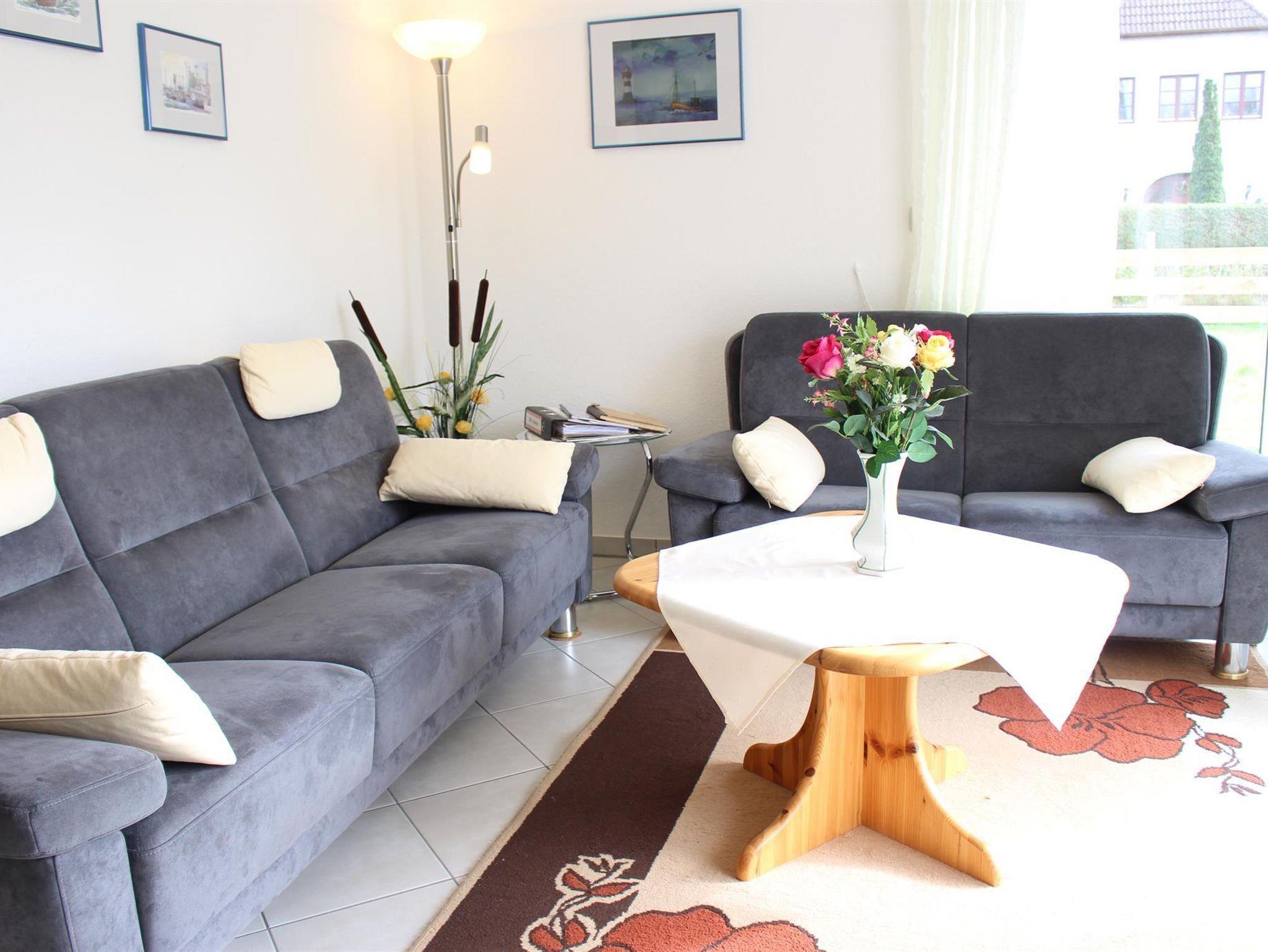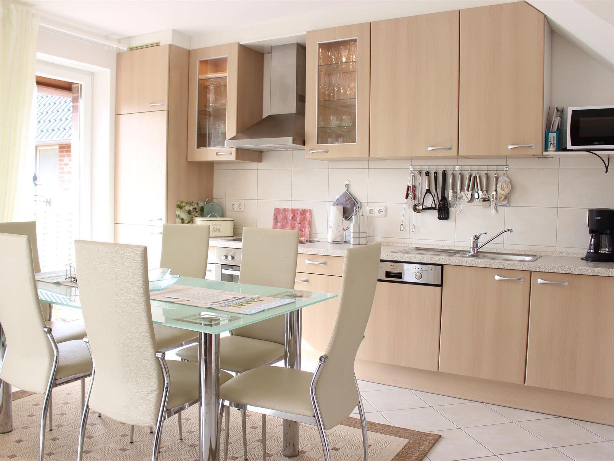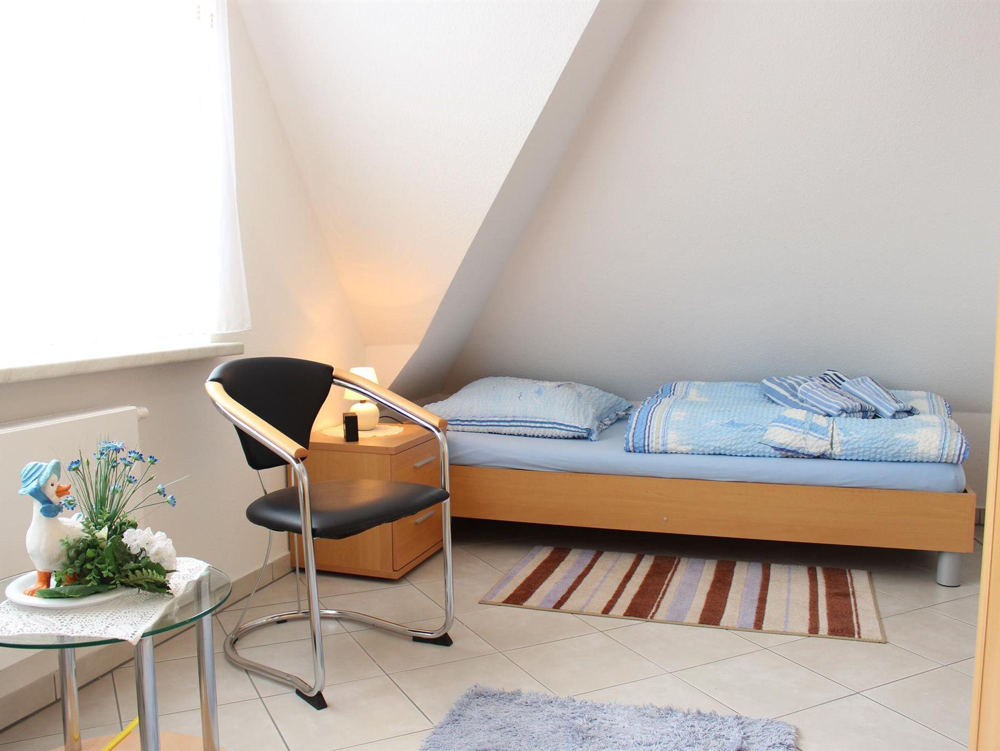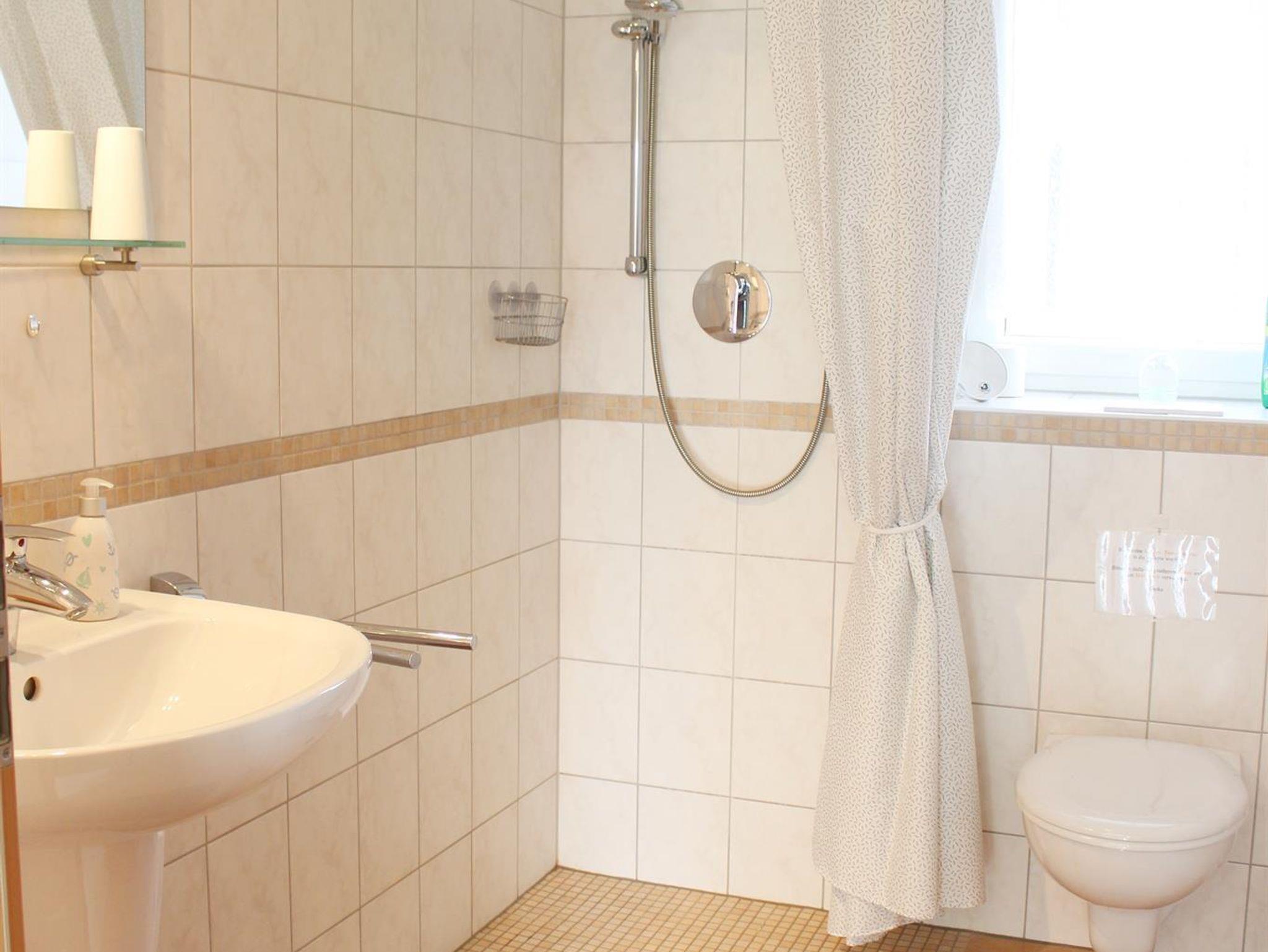 Im Erdgeschoss befinden sich das lichtdurchflutete Wohnzimmer mit offener moderner Küche und großem Esstisch von dort kann man auch auf die Terrasse. Im Erdgeschoss ist ebenso ein Flur mit Garderobe, ein Schlafzimmer mit Doppelbett und ein Duschbad. Die beiden Bäder, eines im EG das andere im OG, sind großzügig gestaltet und bieten genügend Platz für Ihre Utensilien.Alle Räume im Erdgeschoss sind gefließt und die Bäder verfügen über Fußbodenheizung.Über eineTreppe gelangt man in das Obergeschoss mit zwei großzügigen Schlafzimmern.Ein Doppelzimmer mit 2 Einzelbetten und ein Einzelzimmer