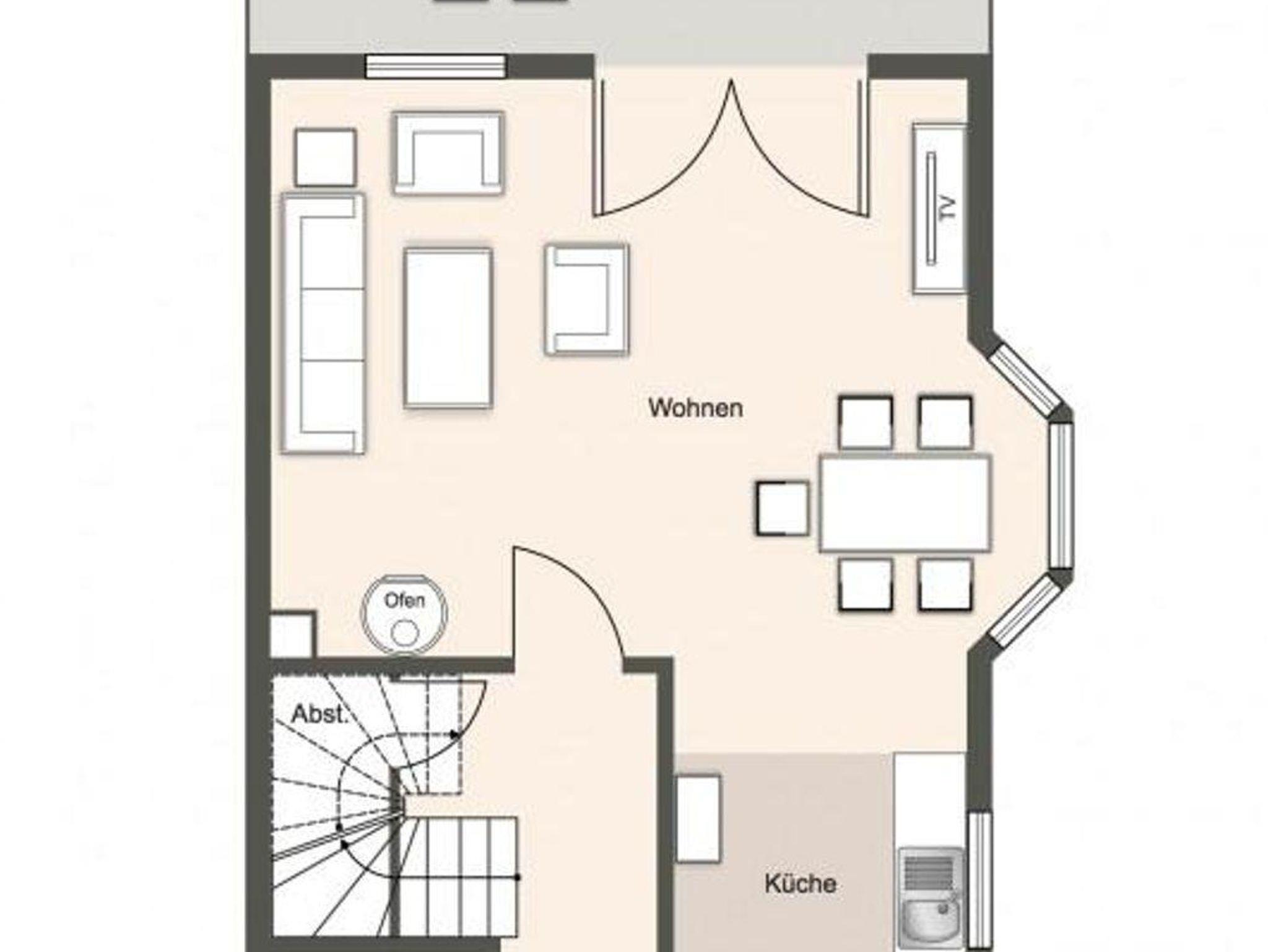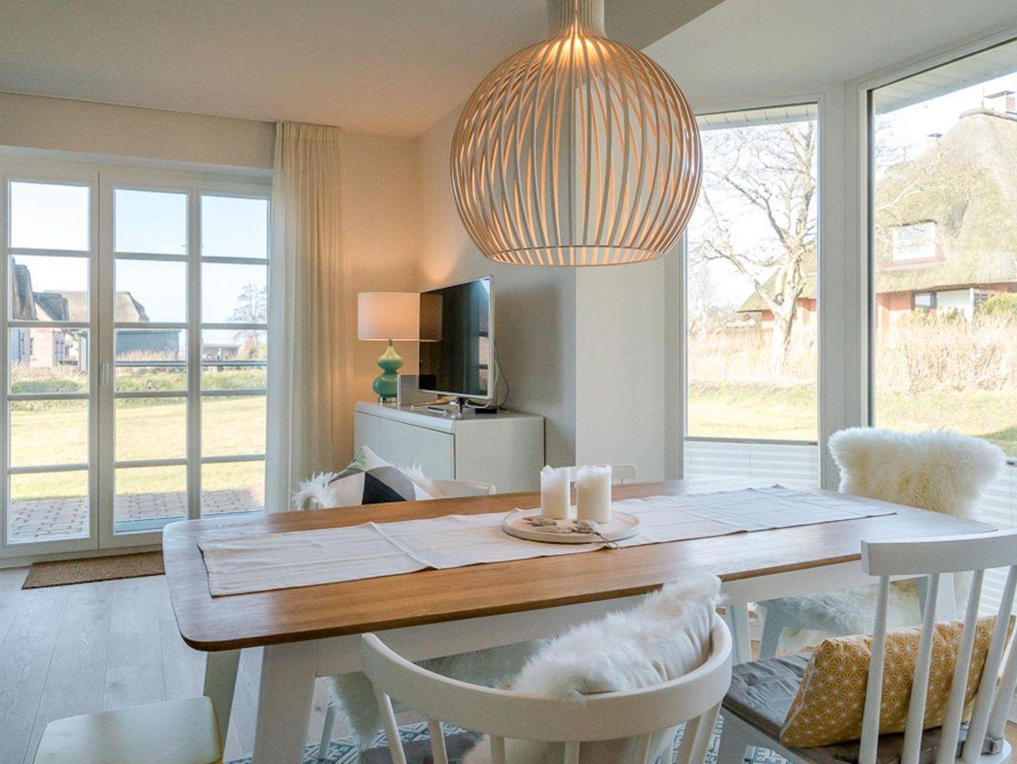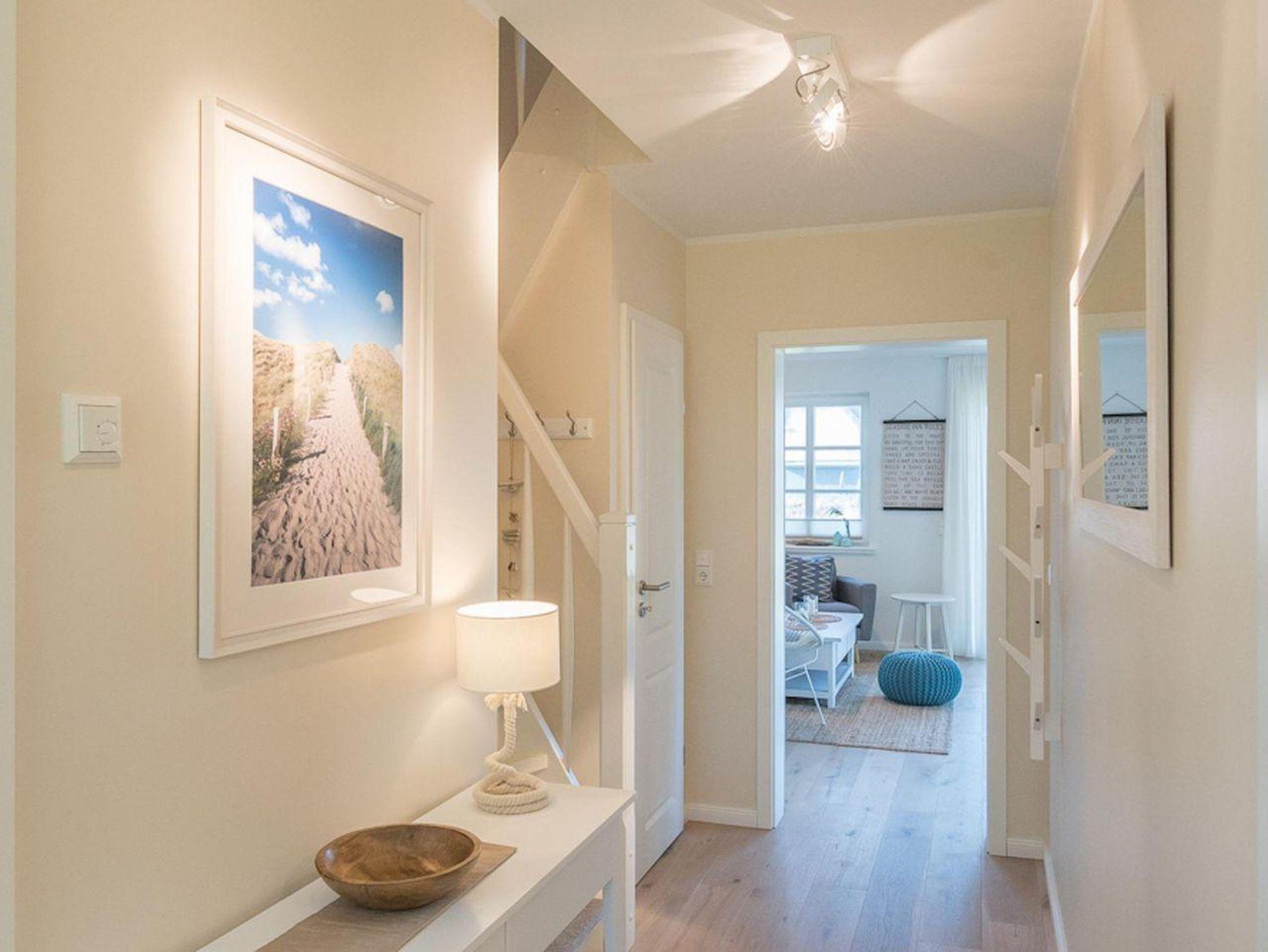 Im Erdgeschoss befindet sich der lichtdurchflutete Wohnraum mit TV, Apple TV, kleine Musikanlage mit Dockingstation für iPhone, Kaminofen, einer offenen Küche sowie einem stilvollen hellen Essbereich mit Blick auf die Düne. Die Wohnräume sind mit exklusiven Möbeln ausgestattet. Die Küche verfügt über hochwertige Elektrogeräte und lässt von der Nespressomaschine über ein Waffeleisen bis zur Salatschleuder keinen Wunsch offen. An den Wohnbereich schließen sich ein Flur mit eingebauter Garderobe, ein Hauswirtschaftsraum mit Waschmaschine und Trockner und ein Duschbad an. Das gesamte Erdgeschoss verfügt über ein hochwertiges weiß gekalktes Eichenparkett, welches über Fußbodenheizung beheizt werden kann.