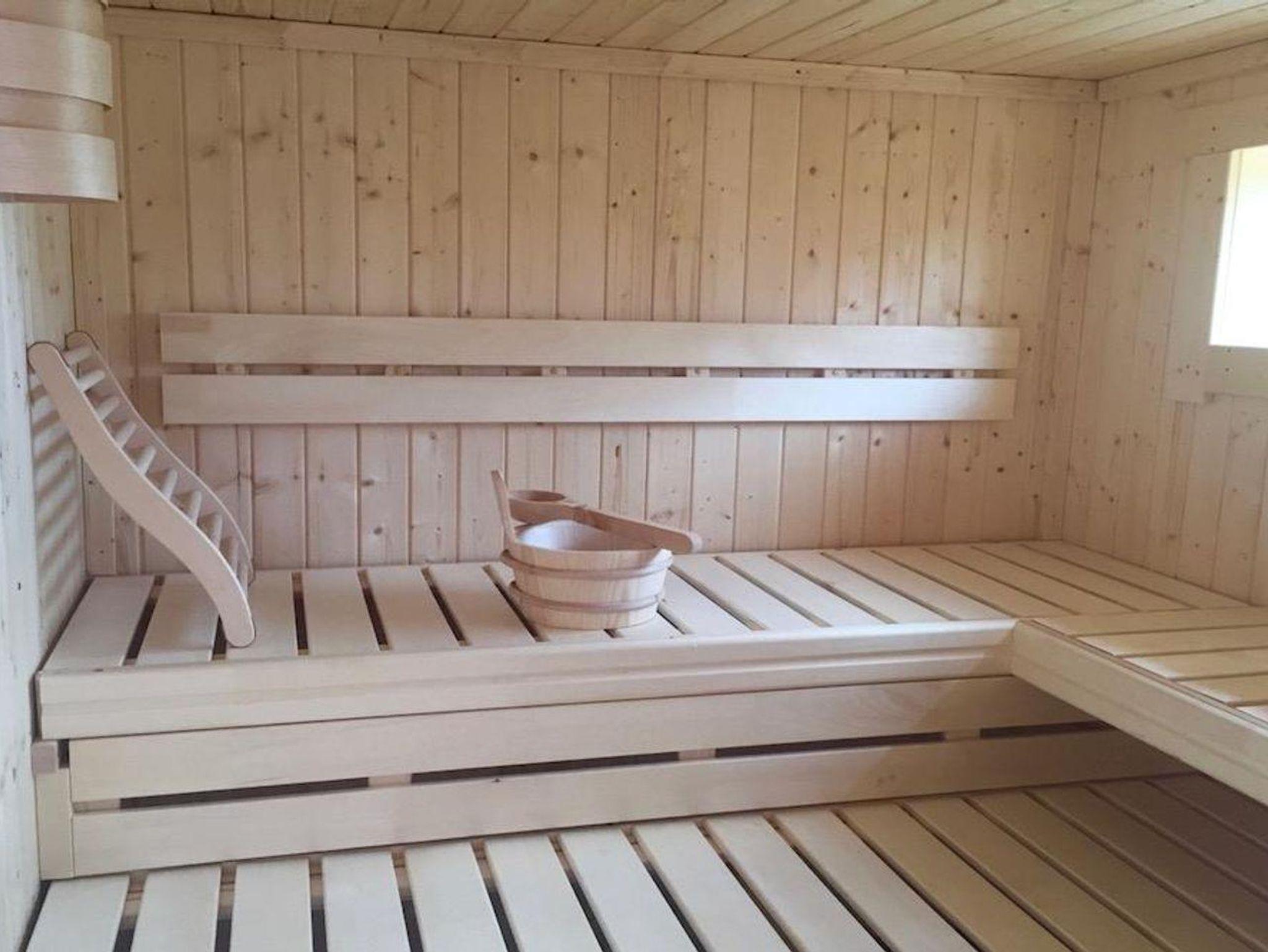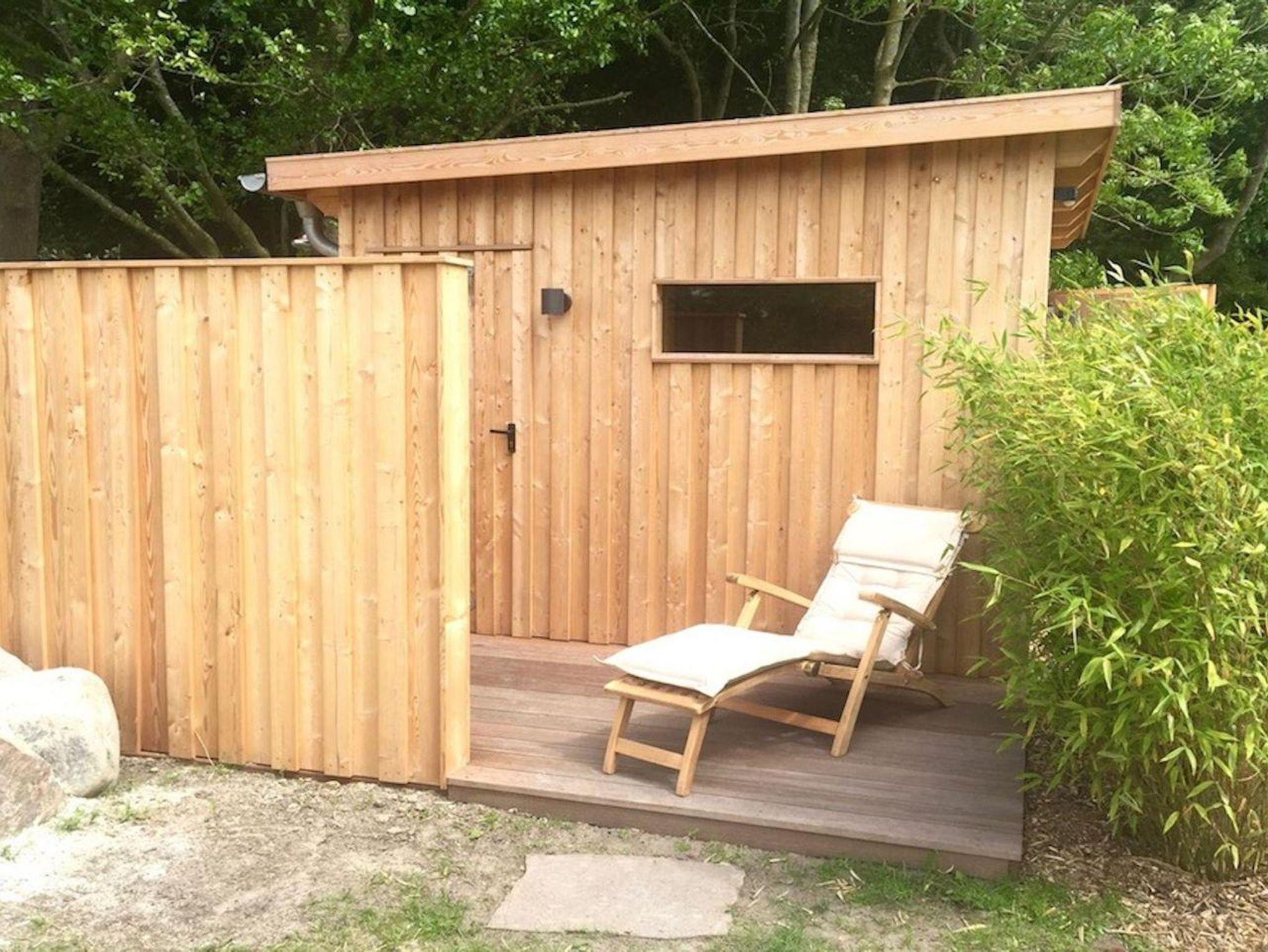 Für zusätzliche Entspannung sorgt eine Gartensauna mit Blick auf die Düne. Ein Abstellraum mit Stromanschluss kann für Fahrräder genutzt werden.