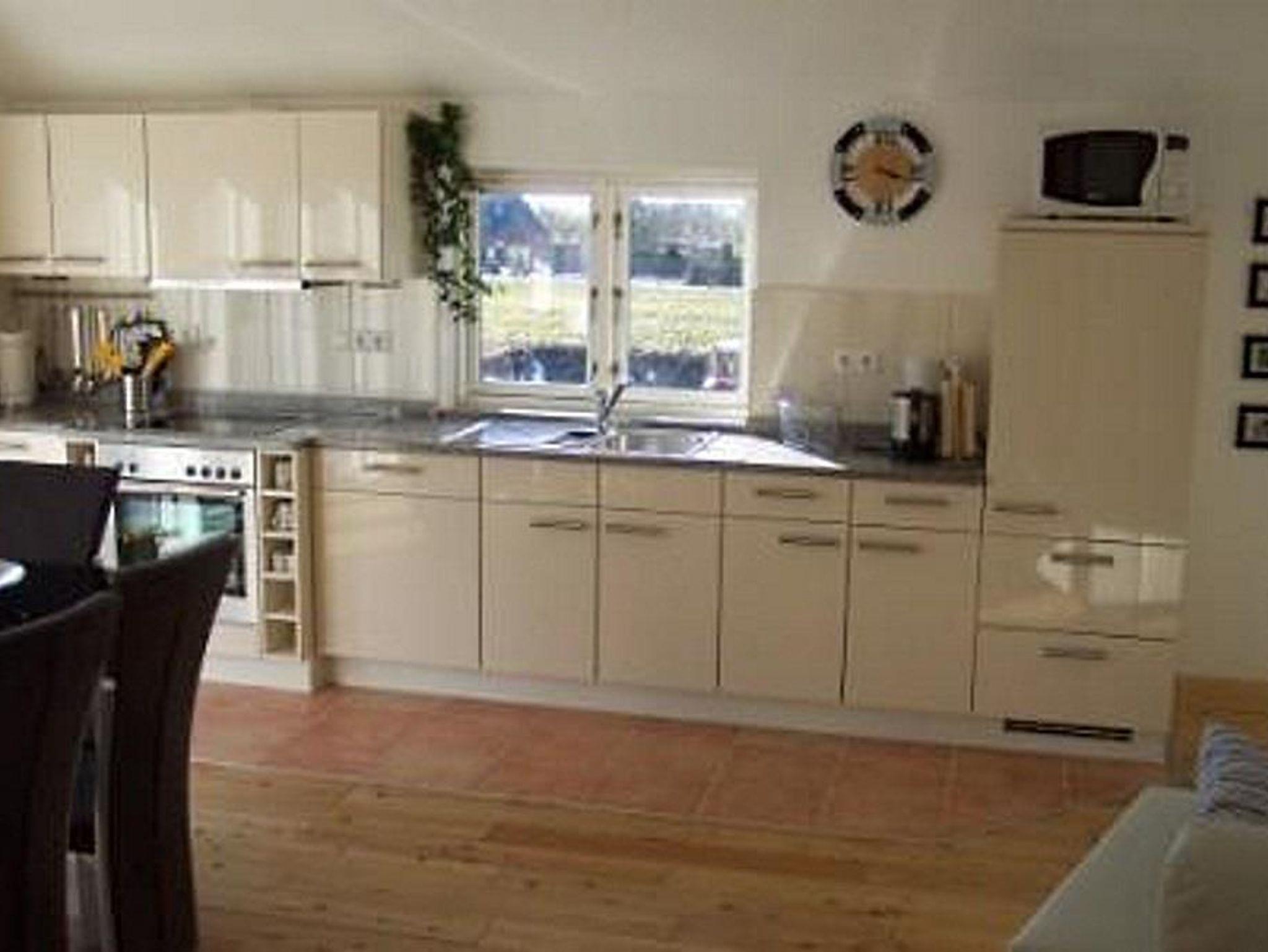 Die voll ausgestattete Küche beinhaltet Spülmaschine, Kochfeld mit Ceranplatte, Mikrowelle, Backofen, diverse Küchengeräte- und utensilien sowie eine große Arbeitsfläche aus Granit.