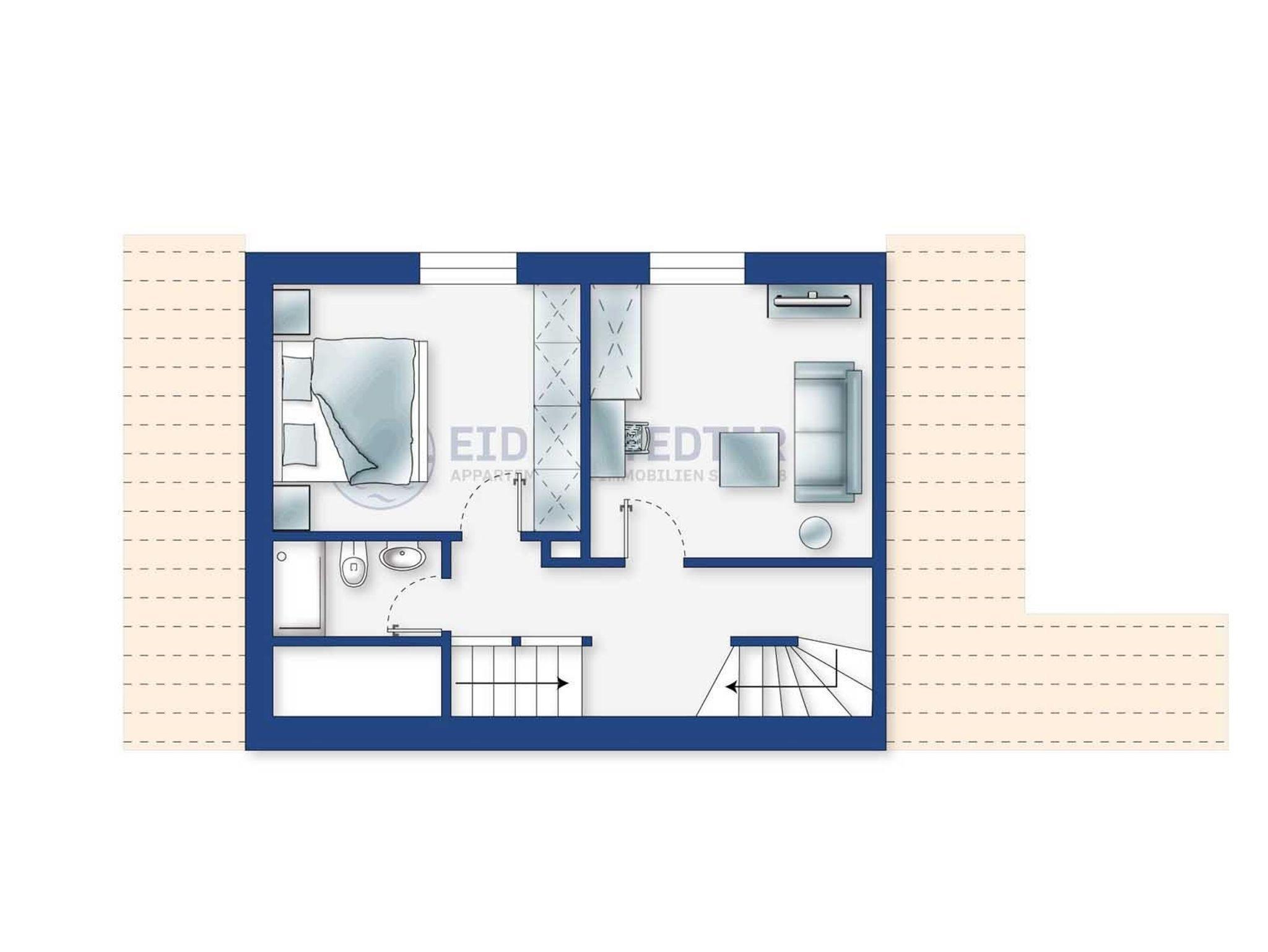 Wohnzimmer mit zwei Sofas, einem Sessel, SMART-TV (SAT), Kachelofen und Esstisch mit vier Stühlen. Offene Küche mit Induktionsherd, Backofen mit integrierter Mikrowelle, Geschirrspüler, Kühlschrank mit Gefrierfach, Internet-Radio, Krups Nespresso Kaffee-Kapselmaschine und einer kleinen Anrichte zum Wohnbereich. Direkter Zugang zur sonnigen Gartenterrasse (halboffener Wintergarten) nach Süden.