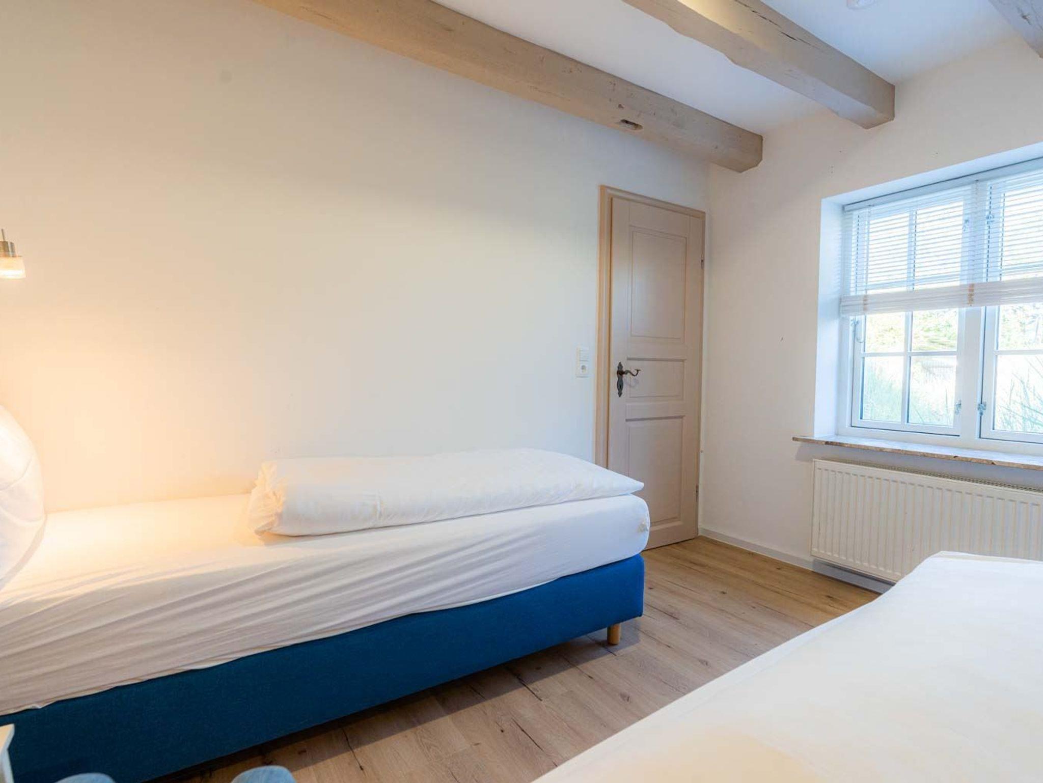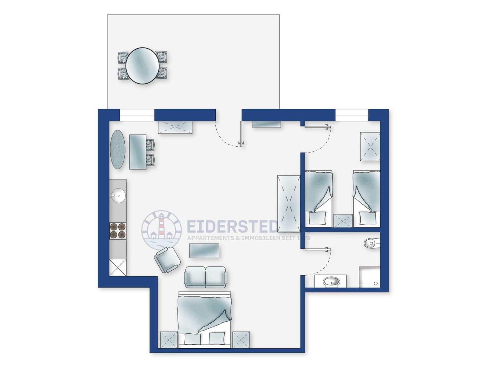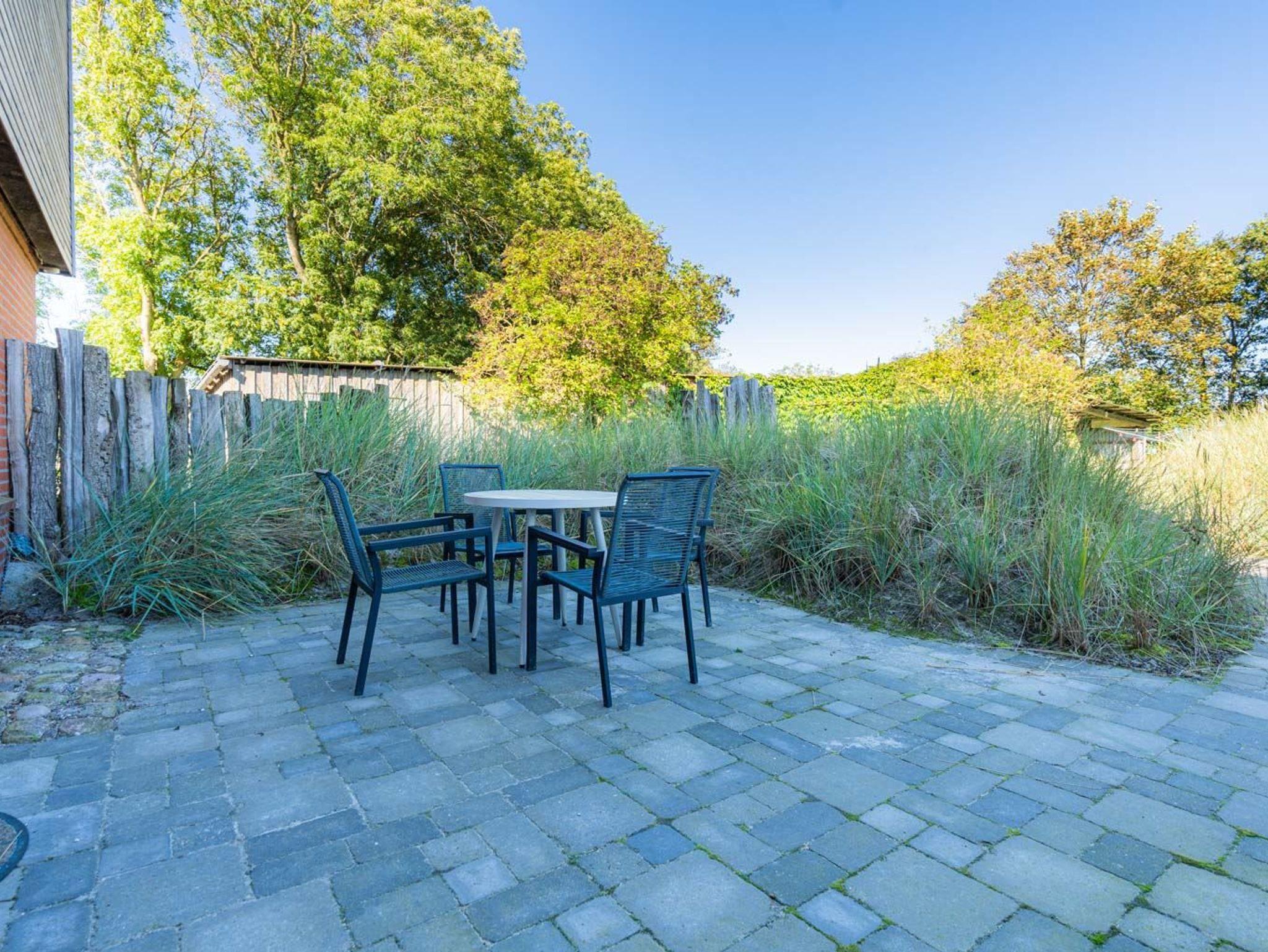 Wohn- und Schlafzimmer mit Sofa, Sessel, SMART-TV, Esstisch mit Sitzbank und 2 Stühlen, Doppelbett (160x200cm, Boxspring) und Kleiderschränken. Offene Küche mit Backofen, Geschirrspüler und Kühlschrank (Gefriermöglichkeit im Gemeinschaftsraum). Direkter Zugang zur möblierten Terrasse nach Norden mit Dünengras-Wall.