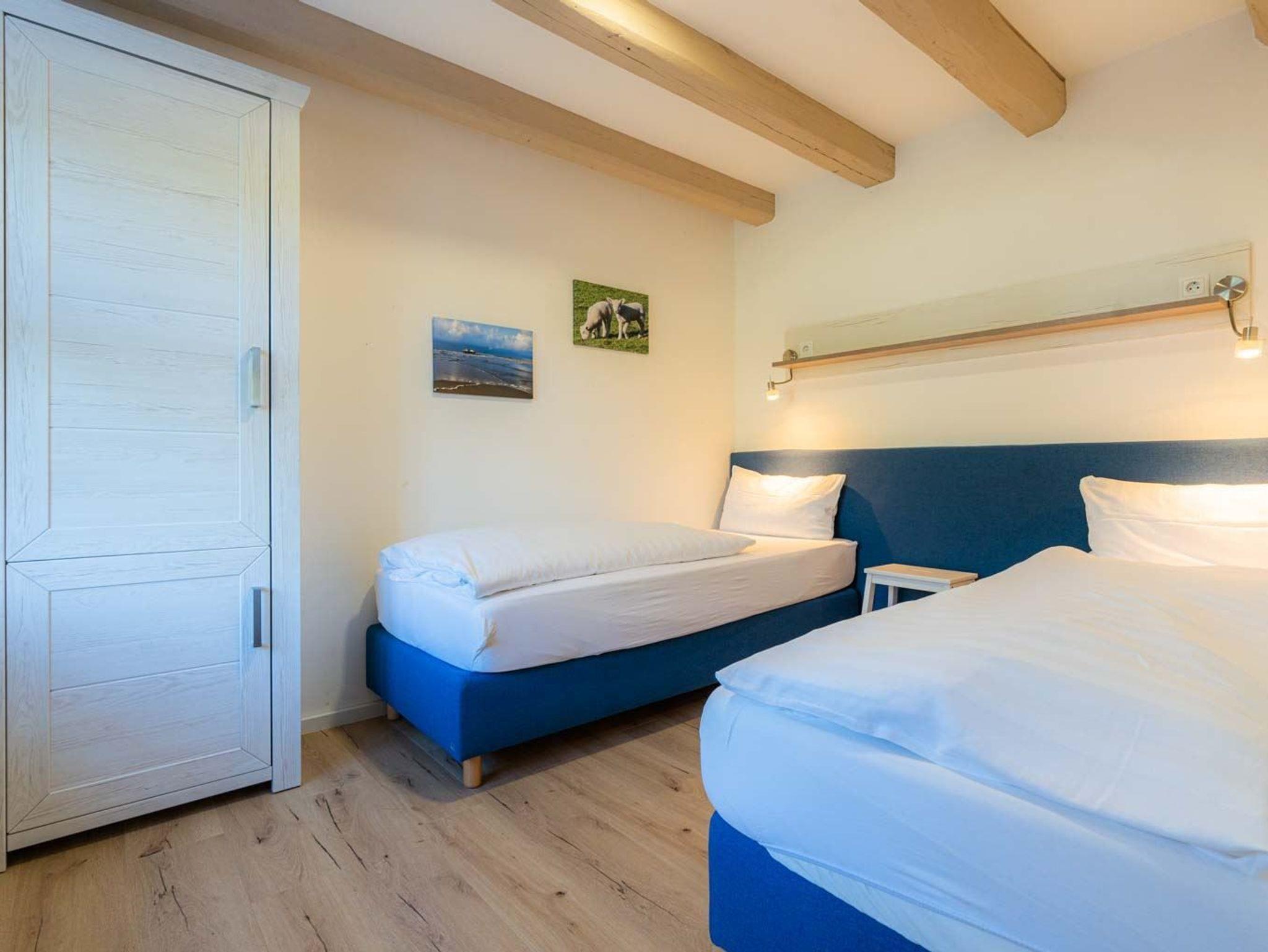 Schlafzimmer mit 2 Einzelbetten (je 80x200cm) und Kleiderschrank.