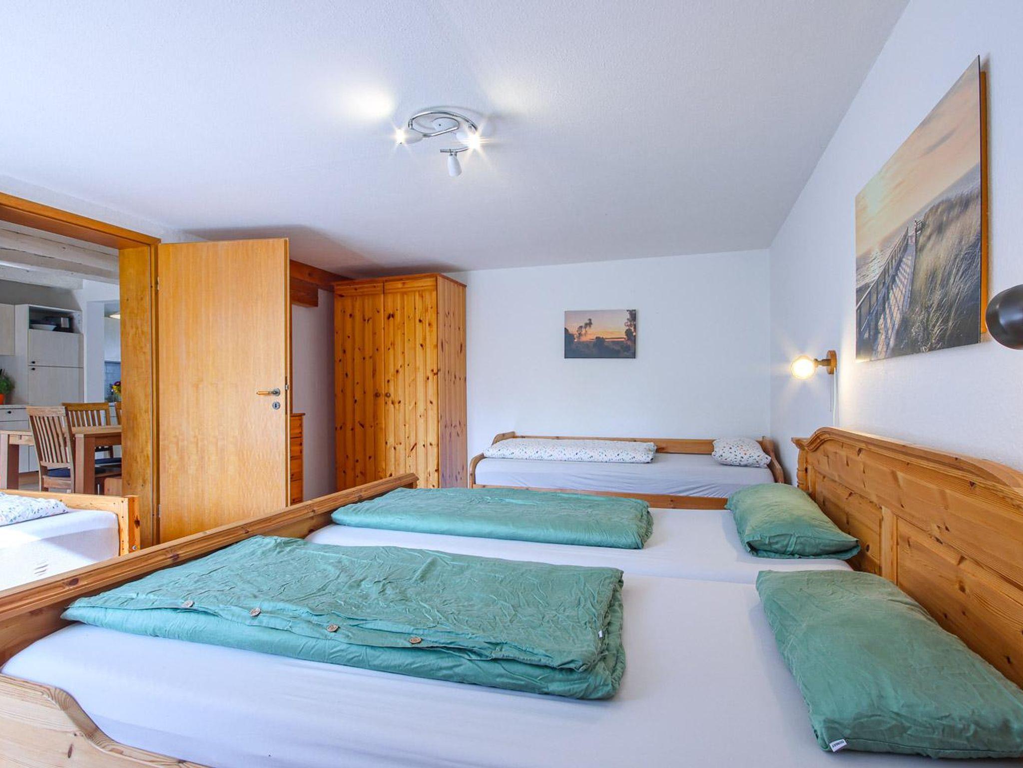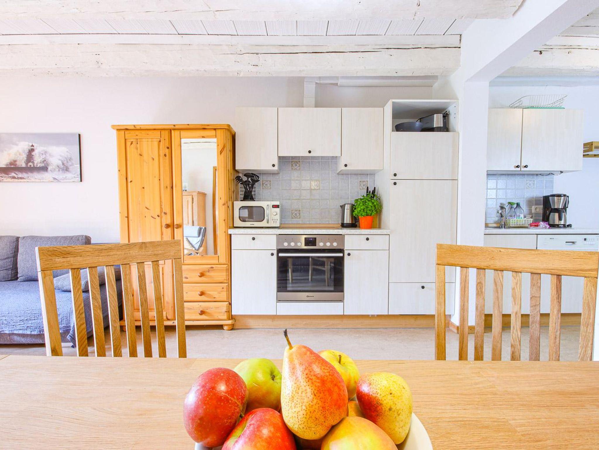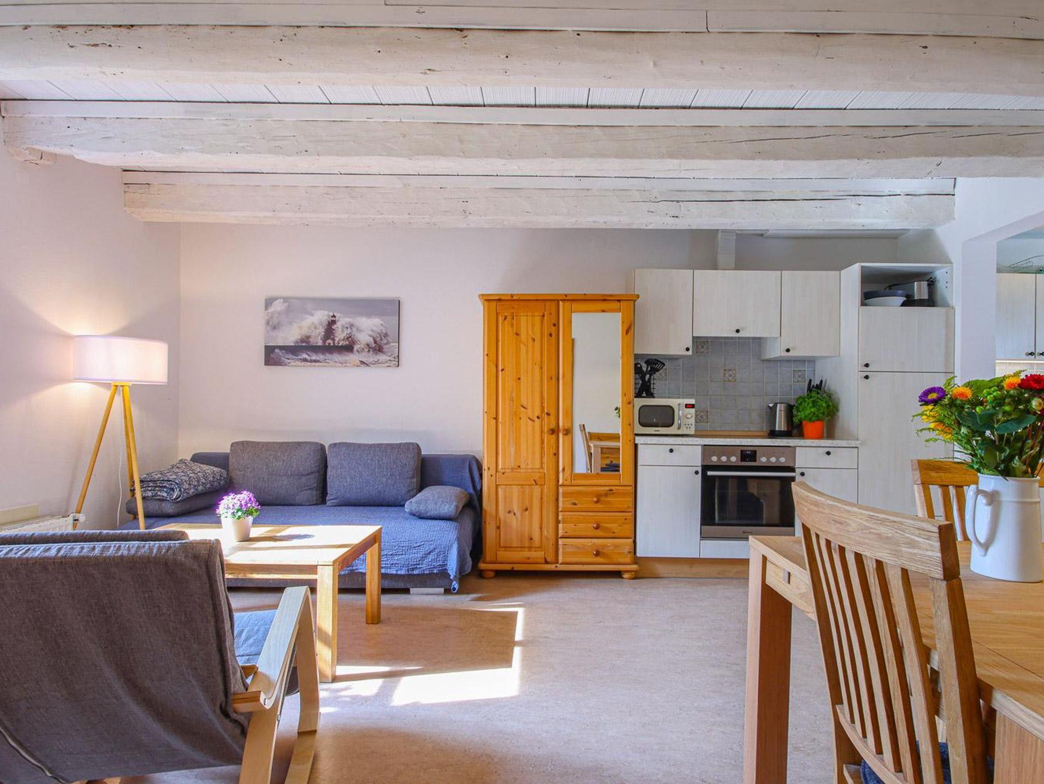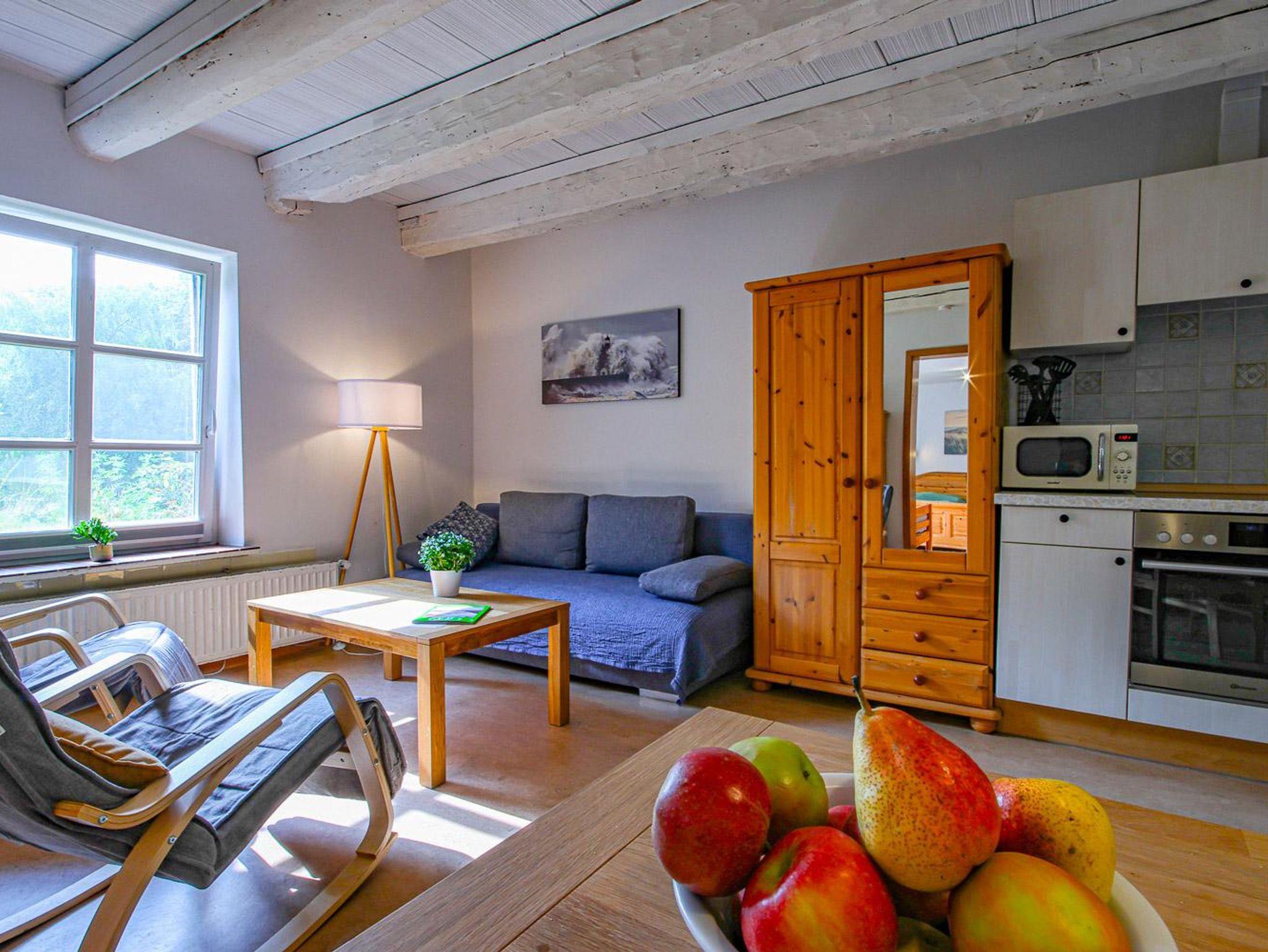 Wohnung im Erdgeschoss mit ca. 56 m² und Gartenblick. Geeignet für 4 Personen. Hunde sind willkommen. Die Nichtraucher-Ferienwohnung ist ausgestattet mit SAT-TV, W-LAN auf Wunsch, Küchenzeile mit 4-Platten-Herd und Backofen, Geschirrspüler, Kühlschrank mit Gefrierfach, Kaffeemaschine, Toaster und Wasserkocher. Badezimmer mit ebenerdiger Dusche, WC und Waschbecken. Im separaten Schlafraum befinden sich ein Doppel- und ein Einzelbett. Im Wohnraum kann die Couch zusätzlich als Schlafmöglichkeit verwendet werden. Kinderbett und Hochstuhl sind vorhanden.