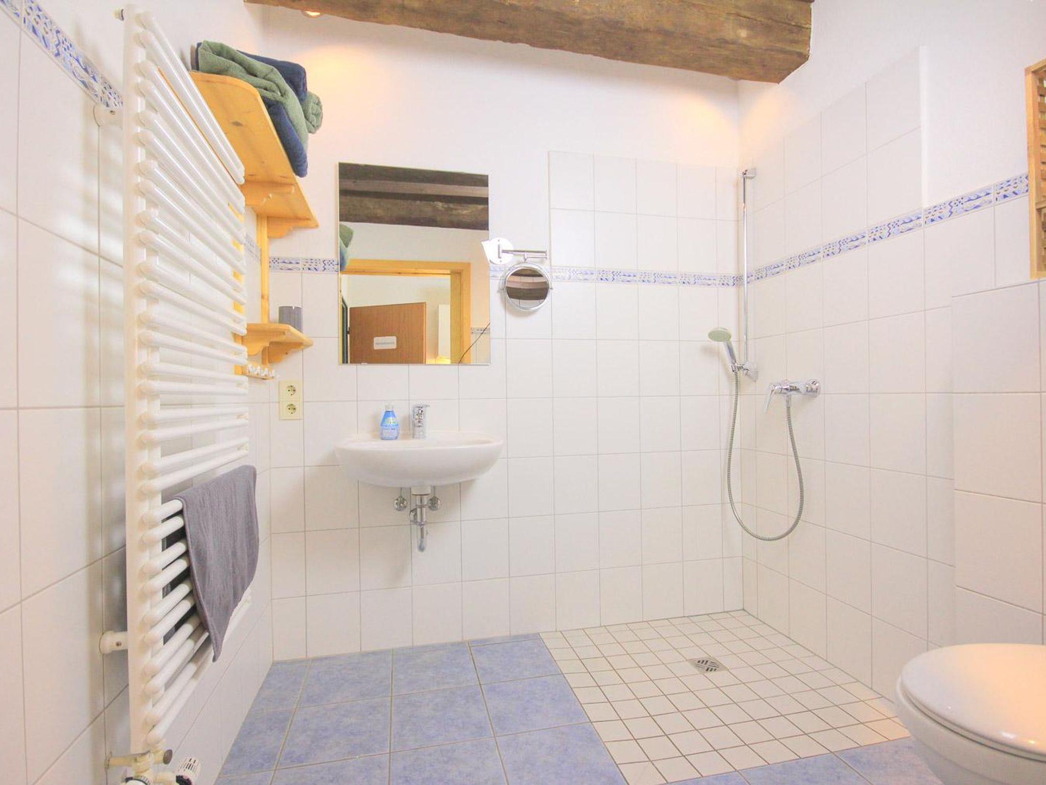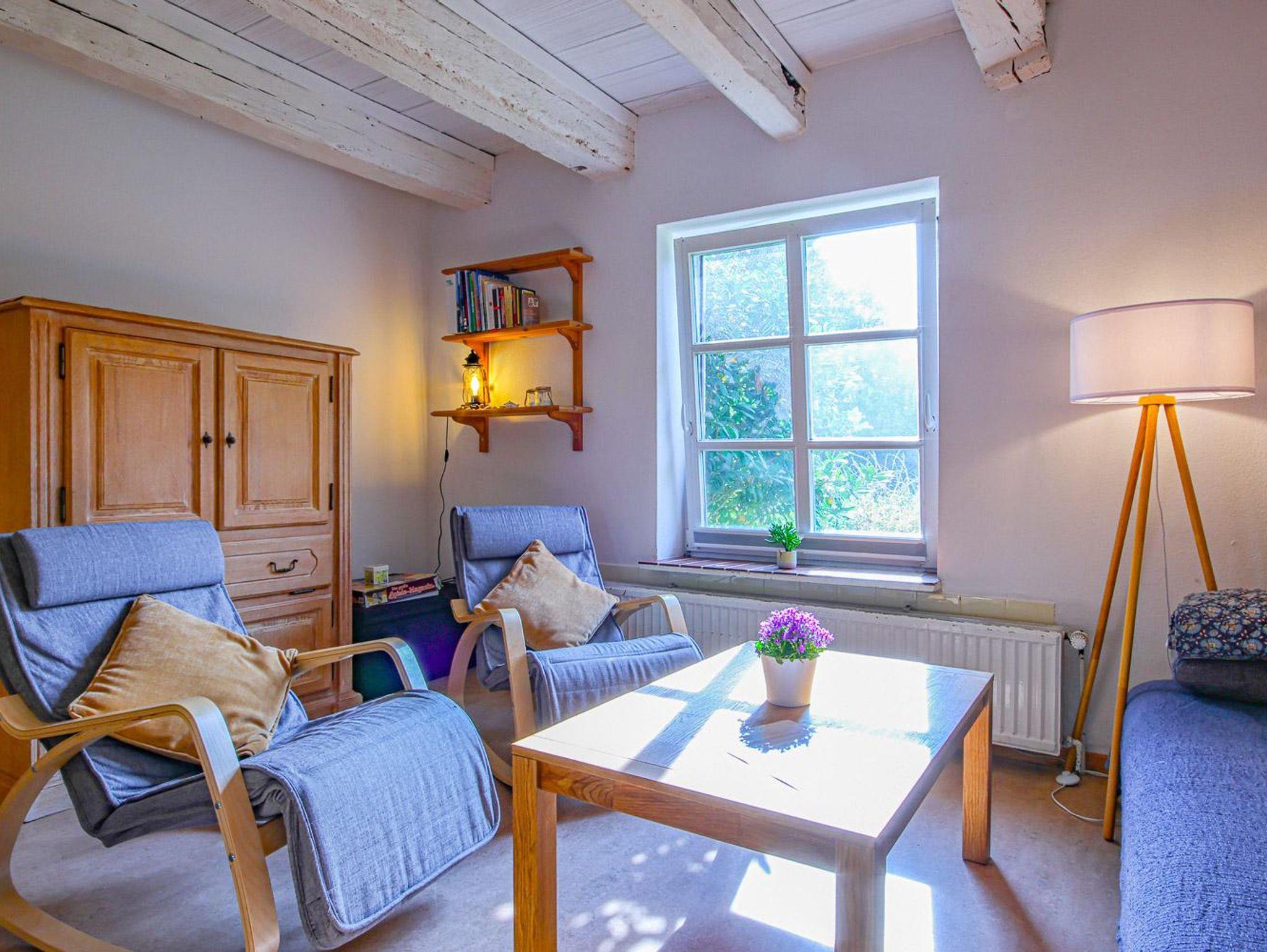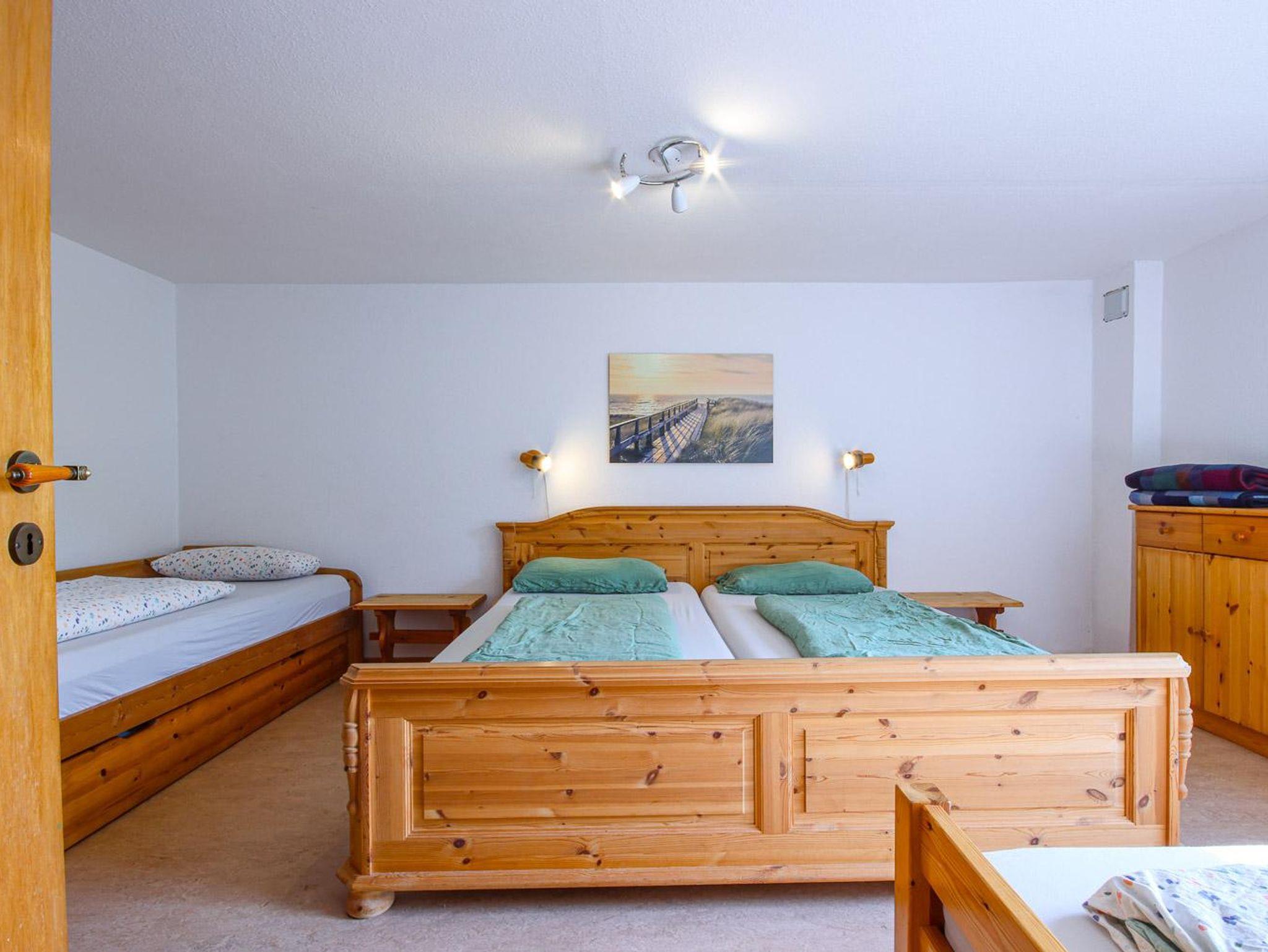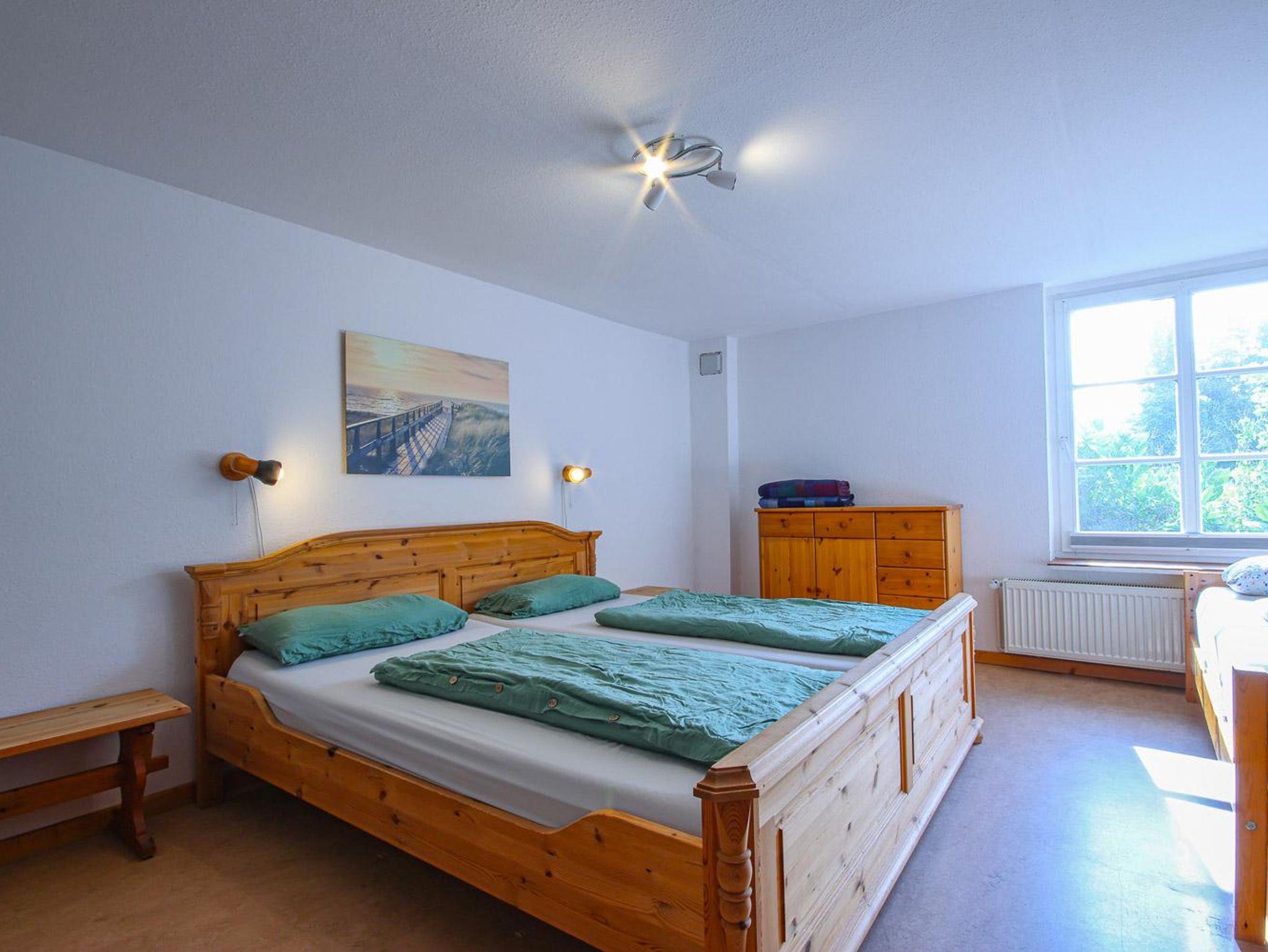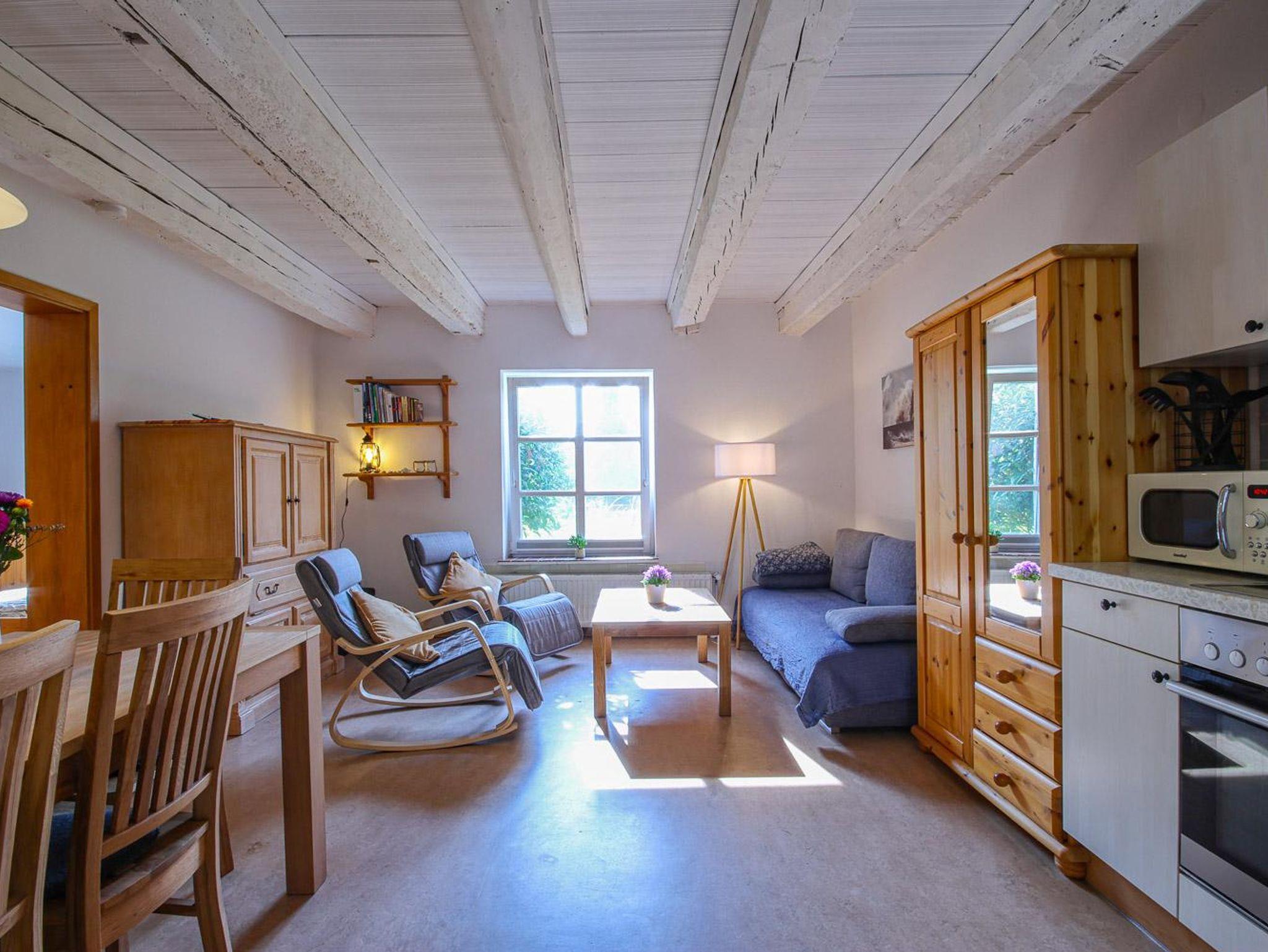 Wohnung im Erdgeschoss mit ca. 56 m² und Gartenblick. Geeignet für 4 Personen. Hunde sind willkommen. Die Nichtraucher-Ferienwohnung ist ausgestattet mit SAT-TV, W-LAN auf Wunsch, Küchenzeile mit 4-Platten-Herd und Backofen, Geschirrspüler, Kühlschrank mit Gefrierfach, Kaffeemaschine, Toaster und Wasserkocher. Badezimmer mit ebenerdiger Dusche, WC und Waschbecken. Im separaten Schlafraum befinden sich ein Doppel- und ein Einzelbett. Im Wohnraum kann die Couch zusätzlich als Schlafmöglichkeit verwendet werden. Kinderbett und Hochstuhl sind vorhanden.