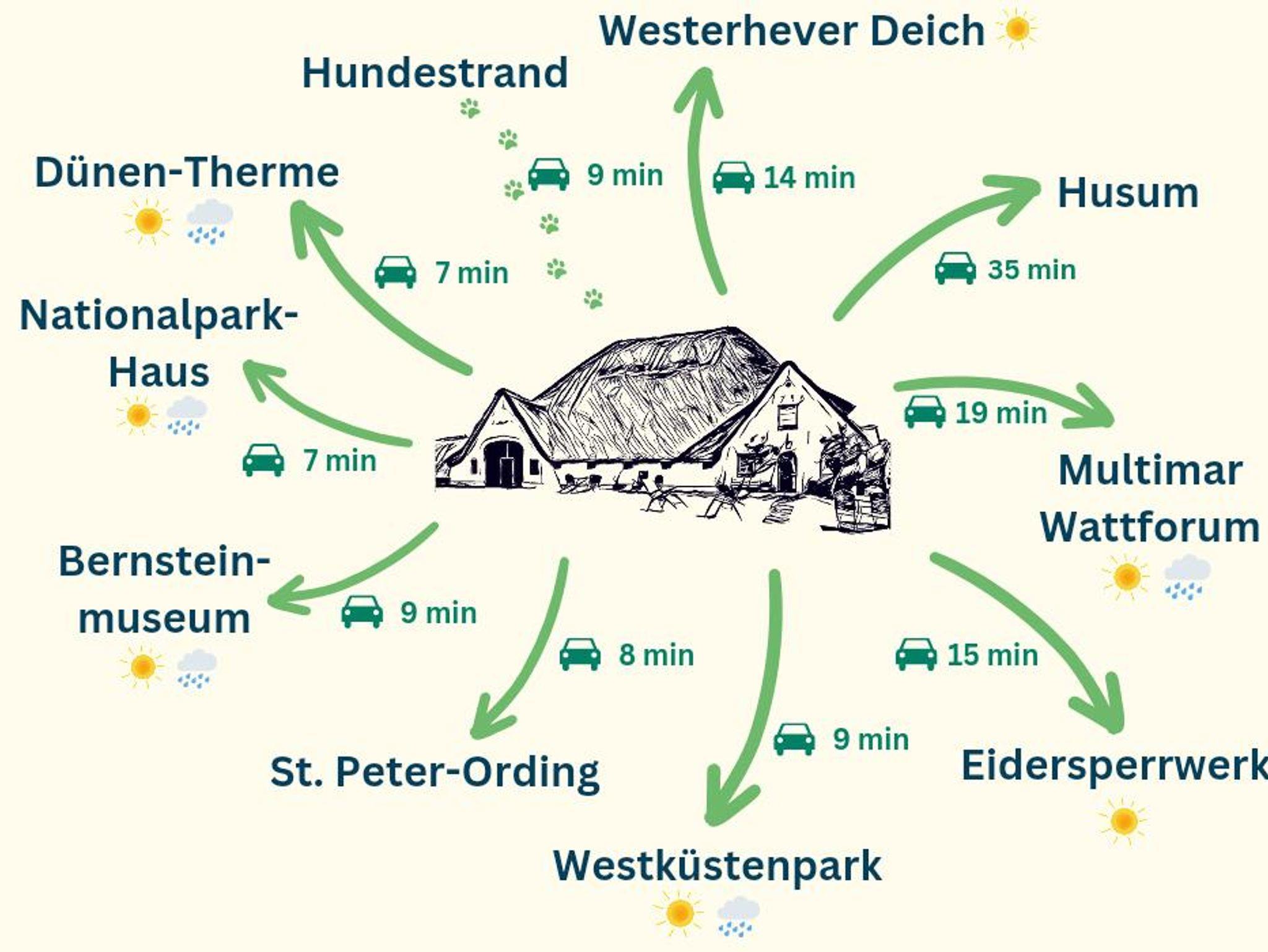 Zehn Autominuten entfernt befindet sich der Sandstrand von St Peter Ording. Der flache Strand ist nicht nur für Familien geeignet, sondern auch für Windsurfer und Wassersportneulinge ideal. Rund um den Haubarg reihen sich Wiesen und Felder und kleine Wege, die zu einer Fahrradtour zum nächsten Deich einladen.