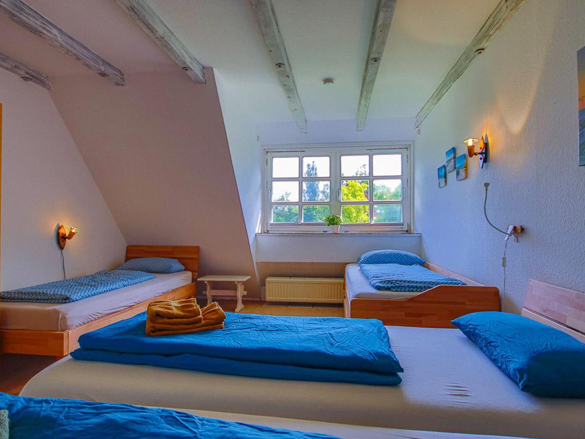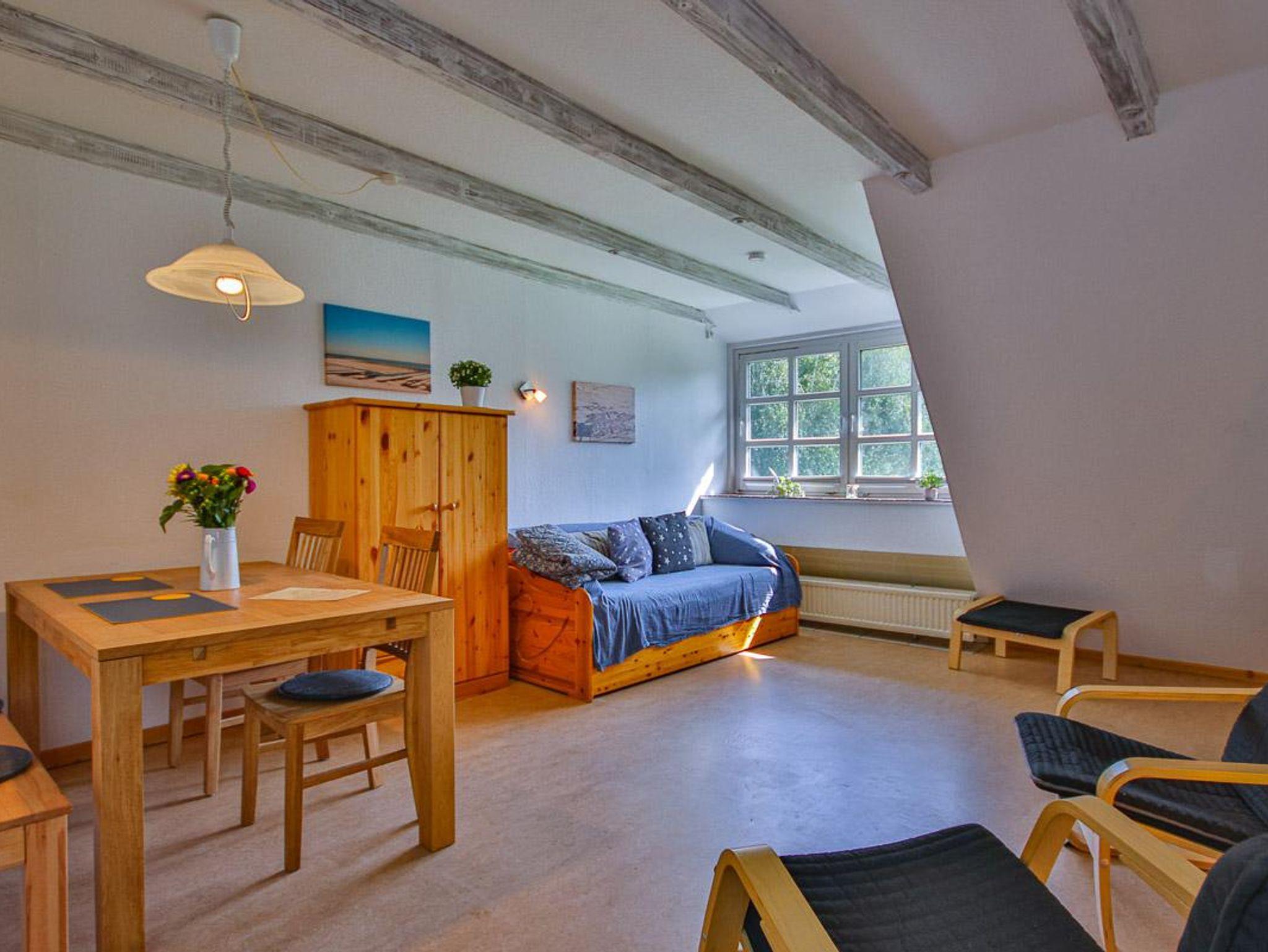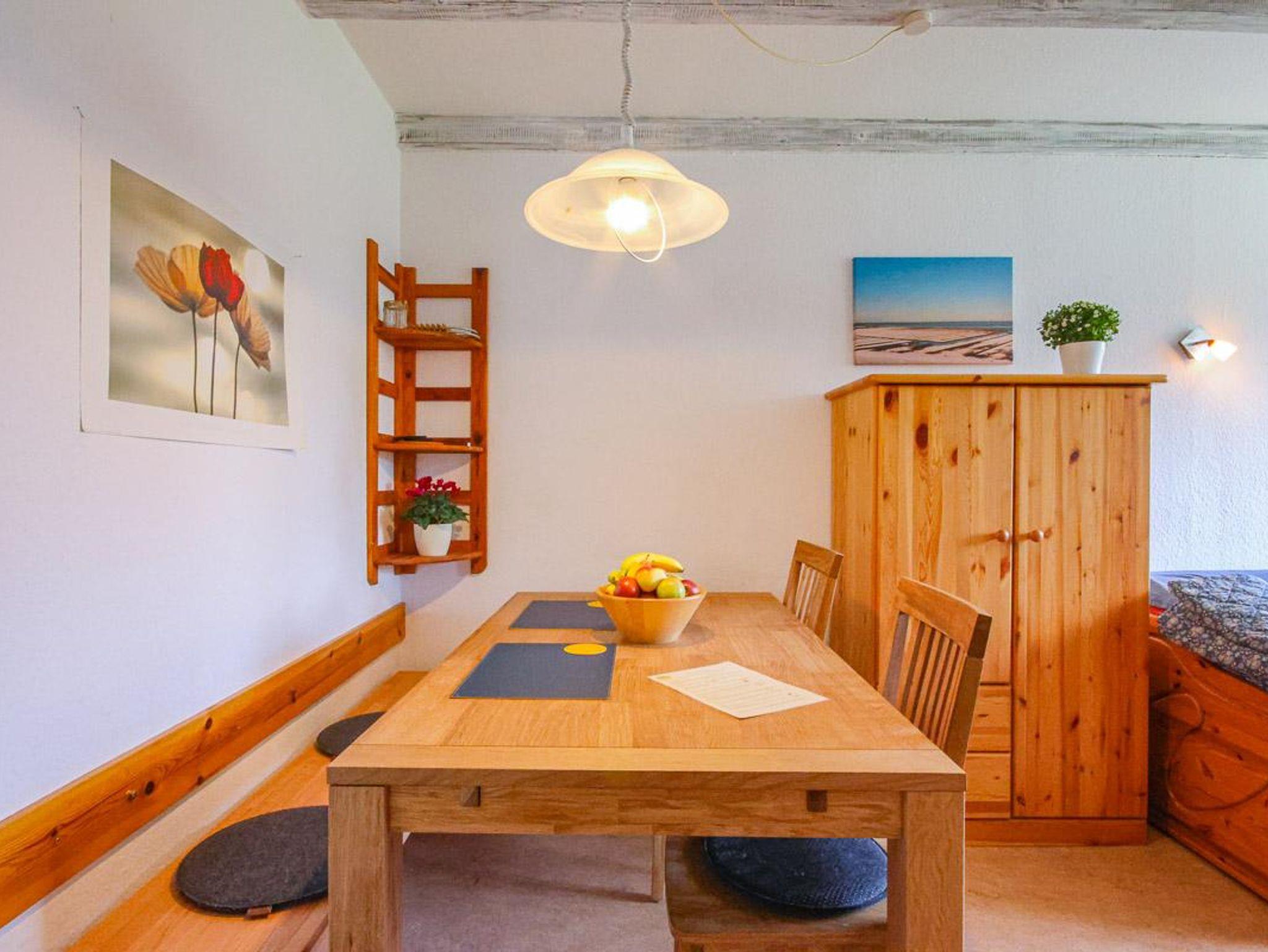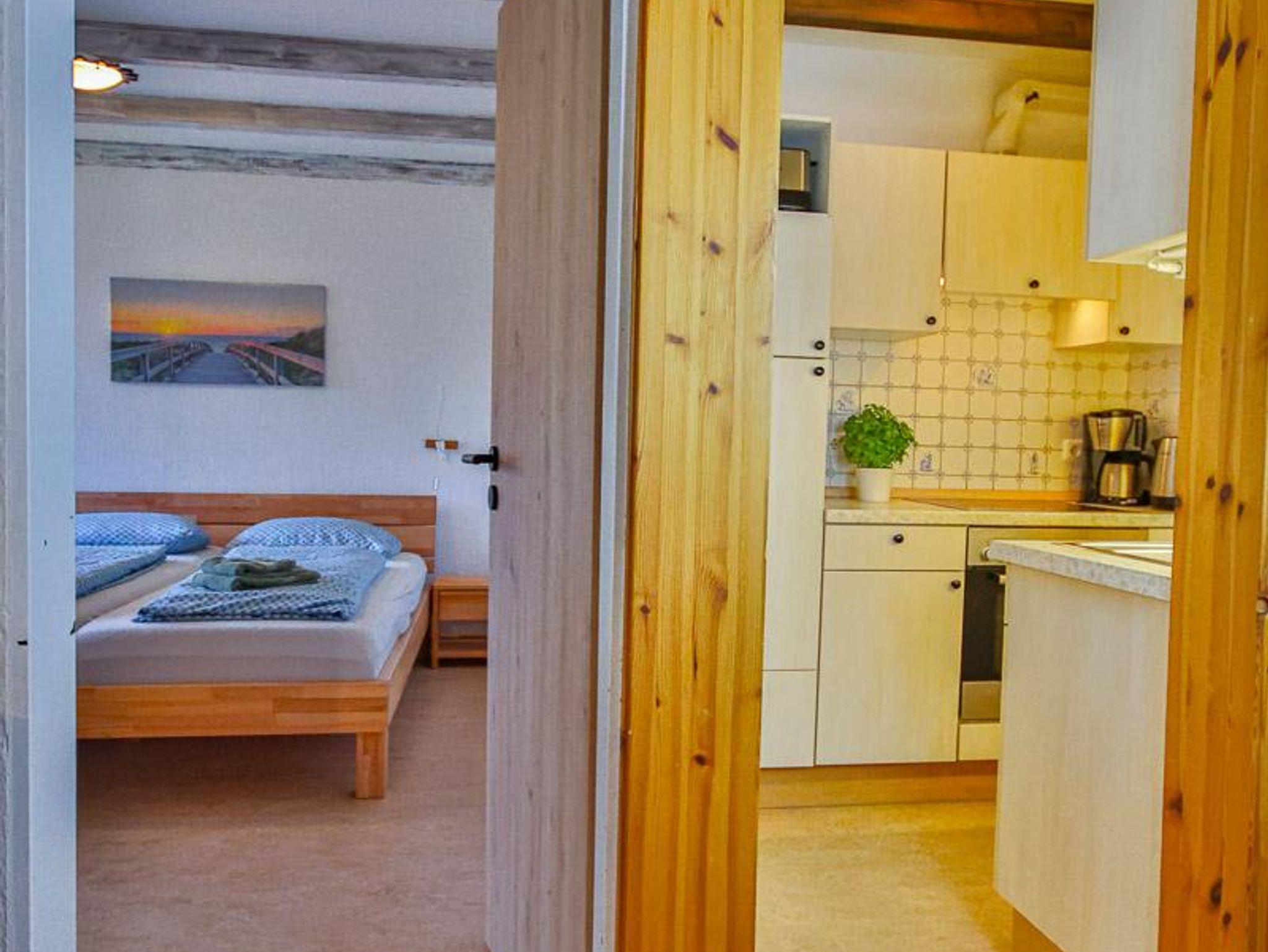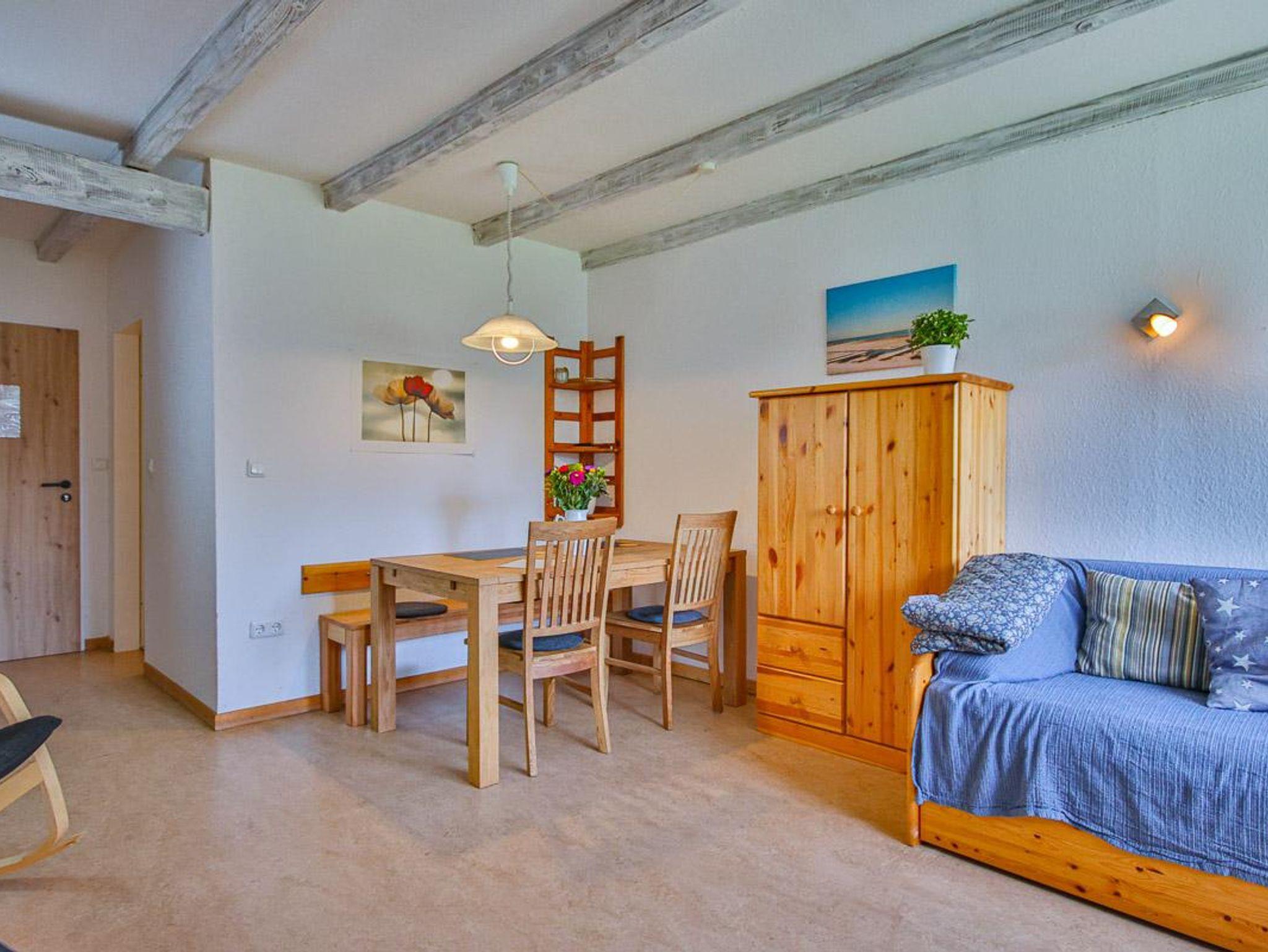 Wohnung im 1. Obergeschoss mit ca. 56 m² und Gartenblick. Geeignet für 4 Personen. Hunde sind in dieser Wohnung nicht erlaubt! Die Nichtraucher-Ferienwohnung ist ausgestattet mit SAT-TV, W-LAN auf Wunsch, Küchenzeile mit 4-Platten-Herd und Backofen, Geschirrspüler, Kühlschrank mit Gefrierfach, Kaffeemaschine, Toaster und Wasserkocher. Badezimmer mit Dusche, WC und Waschbecken. Im separaten Schlafzimmer befinden sich ein Doppel- und ein Einzelbett. Im Wohnraum kann die Couch zusätzlich als Schlafmöglichkeit verwendet werden. Kinderbett und Hochstuhl sind vorhanden.