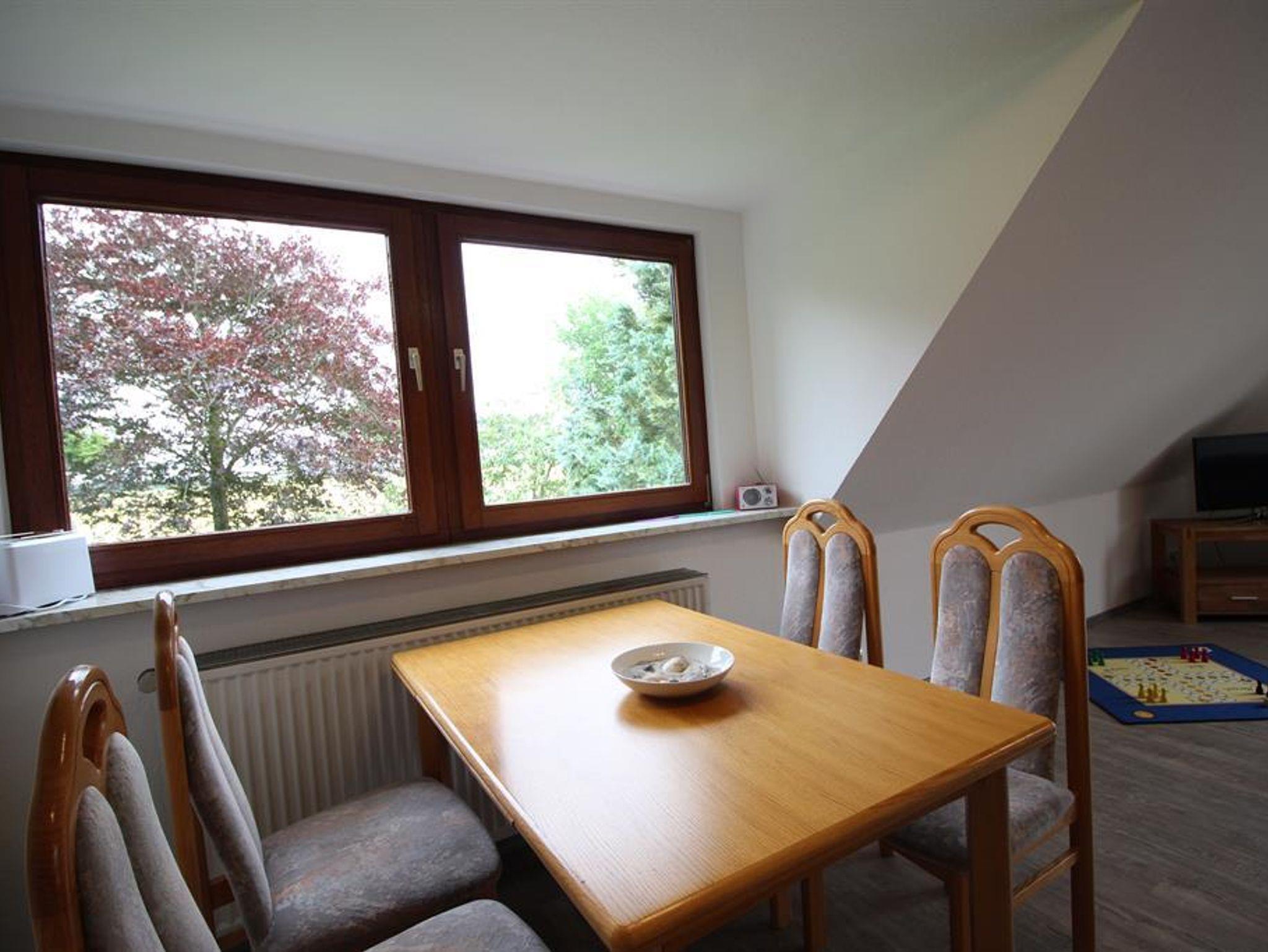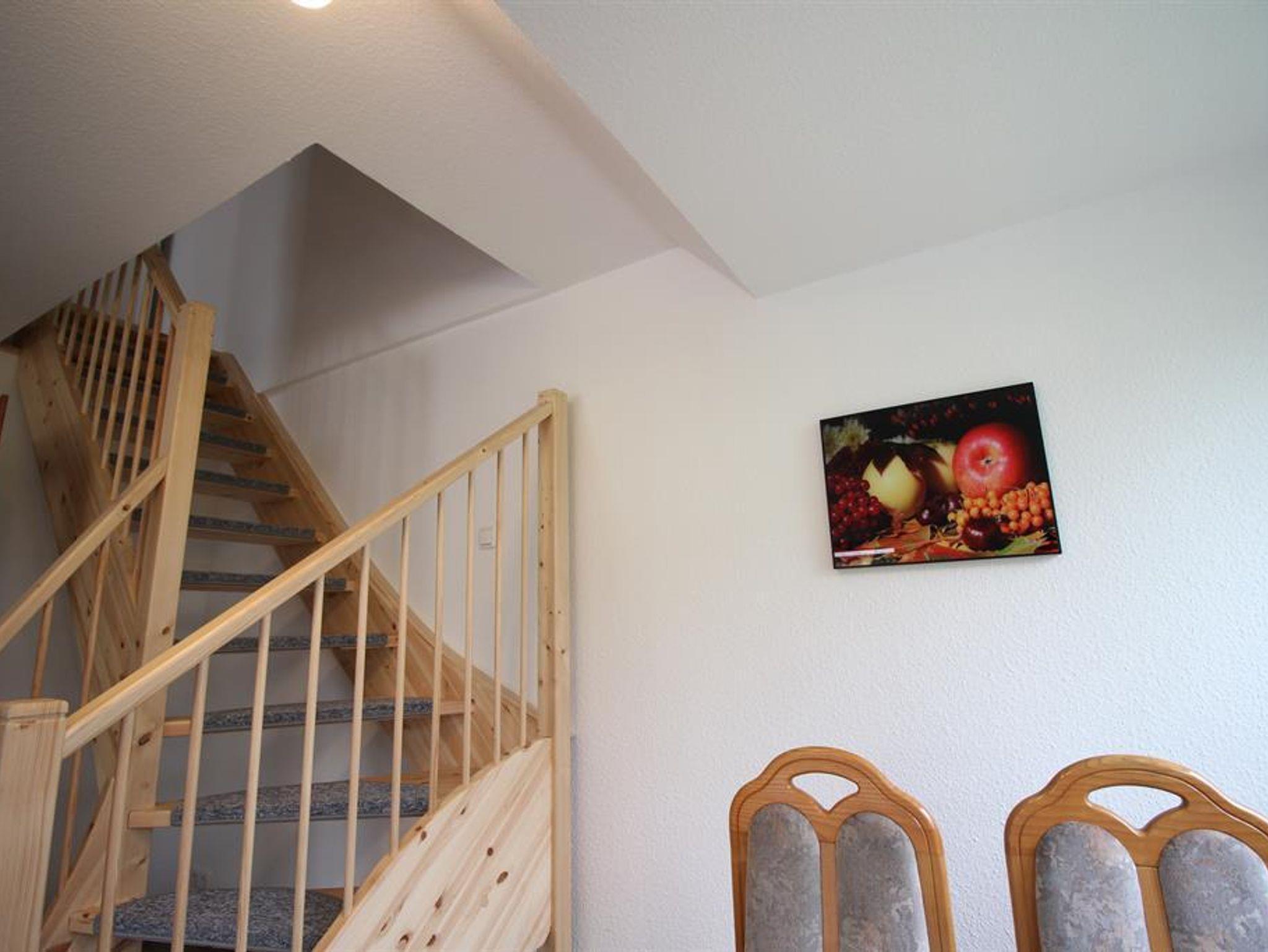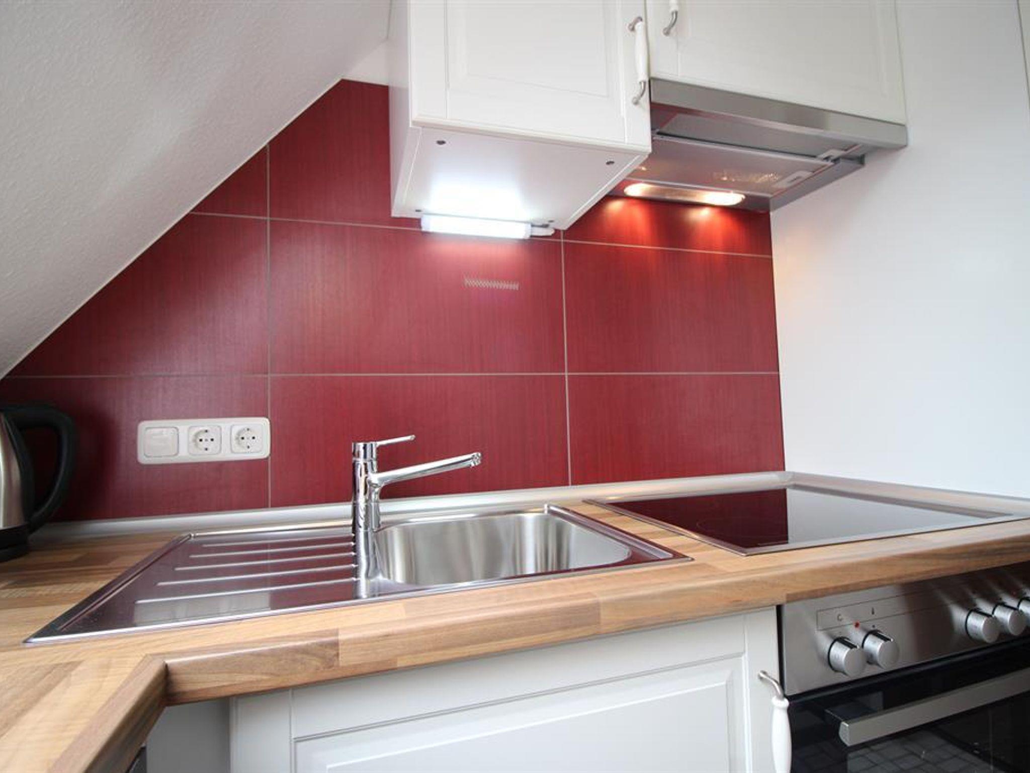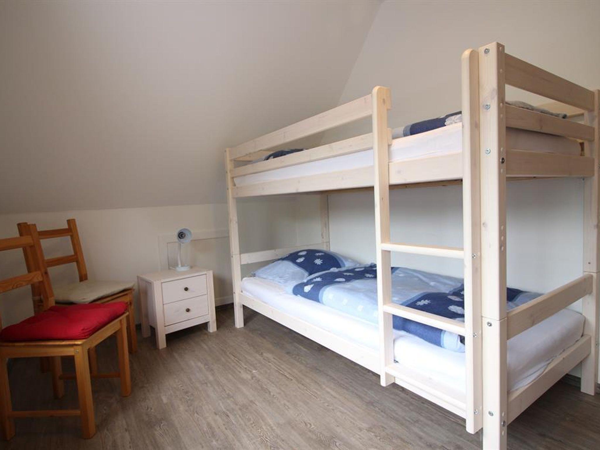 Unsere Ferienwohnung 3 liegt im Obergeschoß. Ein Süd-Westbalkon lässt Sie die Sonne auch in den Abendstunden genießen. Tagsüber können Sie den großen Gemeinschaftsgarten mitnutzen. Die Einrichtung ist hell und freundlich, ein neues Duschbad mit WC und Fußbodenheizung erwartet Sie. Die Küche? Klein aber oho. Sie sollten (bis auf eine Mikrowelle) alles wichtige finden, was Sie zum alltäglichen Kochen benötigen. Im Kinderzimmer ist neben genug Stauraum ein Etagenbett und ein Einzelbett vorhanden. Im Wohnbereich haben Sie eine Sitzgruppe, Sofa, Radio und TV und den Aufgang zum Spitzboden zum separaten Schlafzimmer mit Doppelbett.