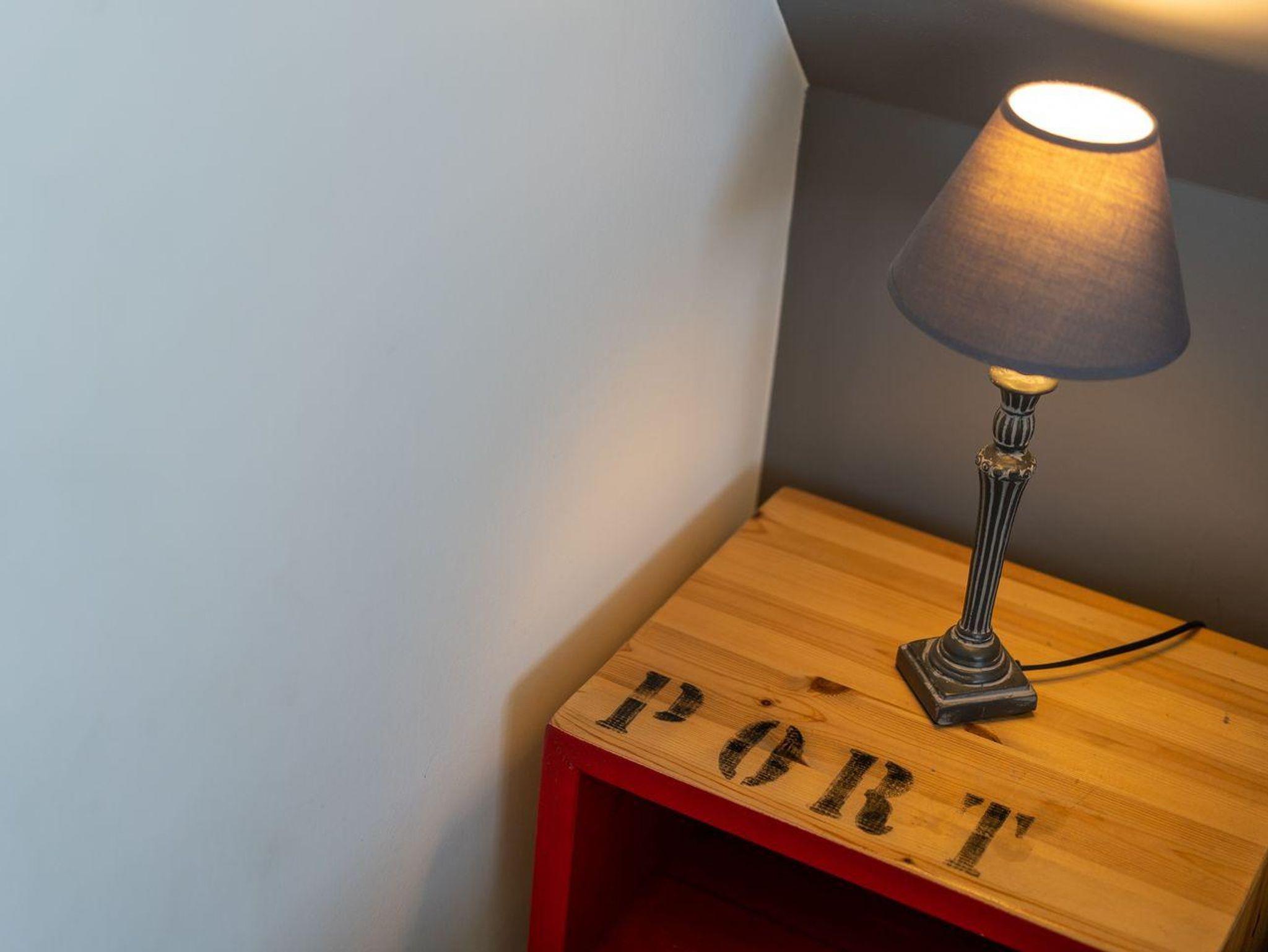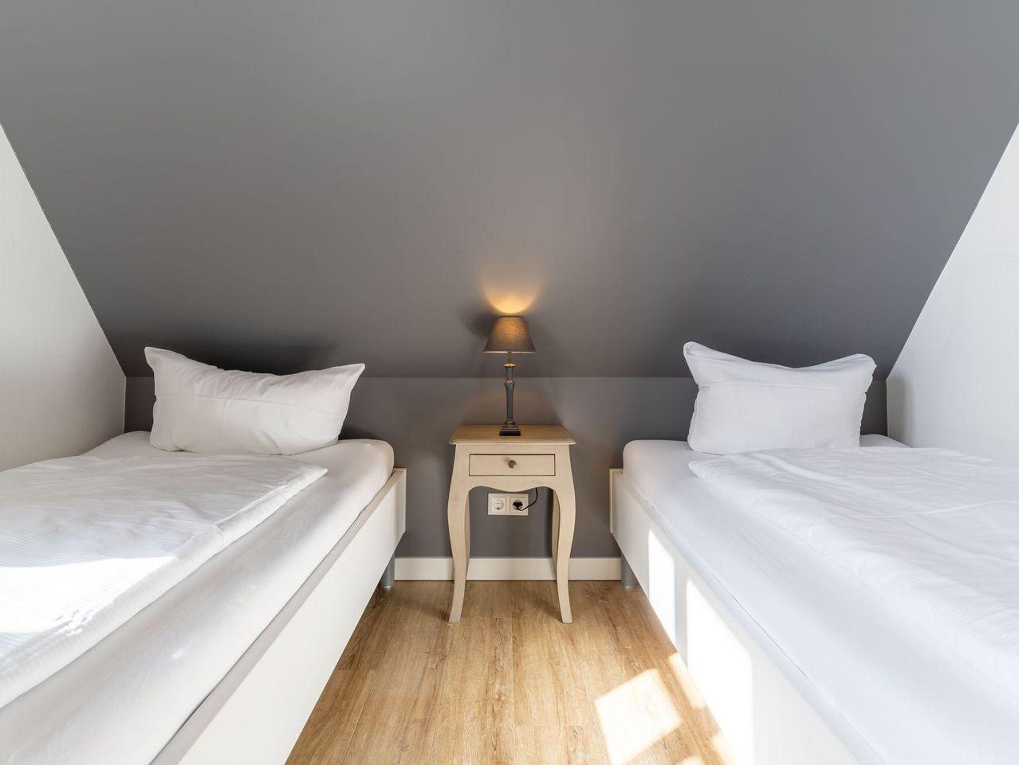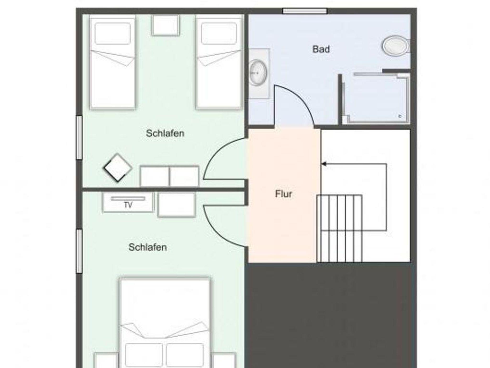 Über eine Holztreppe gelangt man in das Obergeschoss. Die zwei Schlafzimmer, eines mit einem Doppelbett (1,80 x 2,00), TV, und eines mit 2 Einzelbetten (90 x 2,00), sorgen für ruhevolle Erholung.