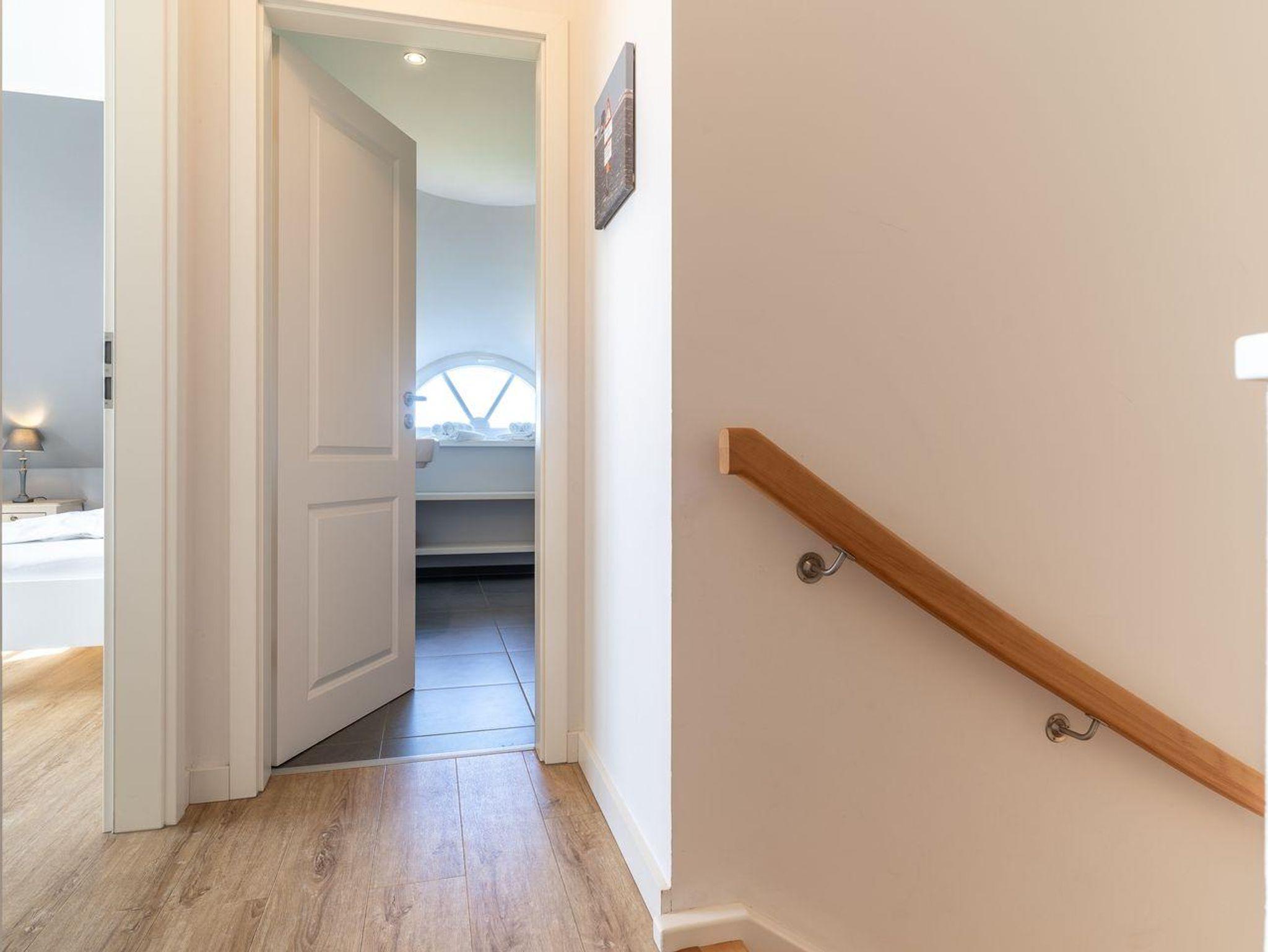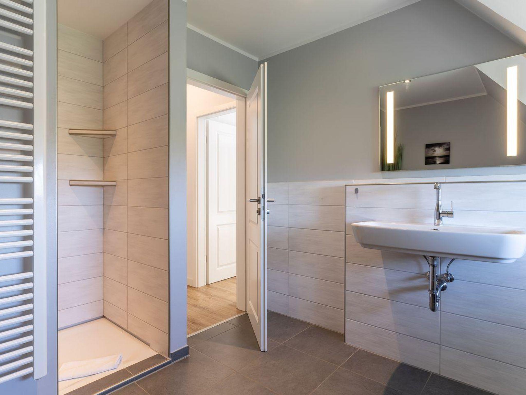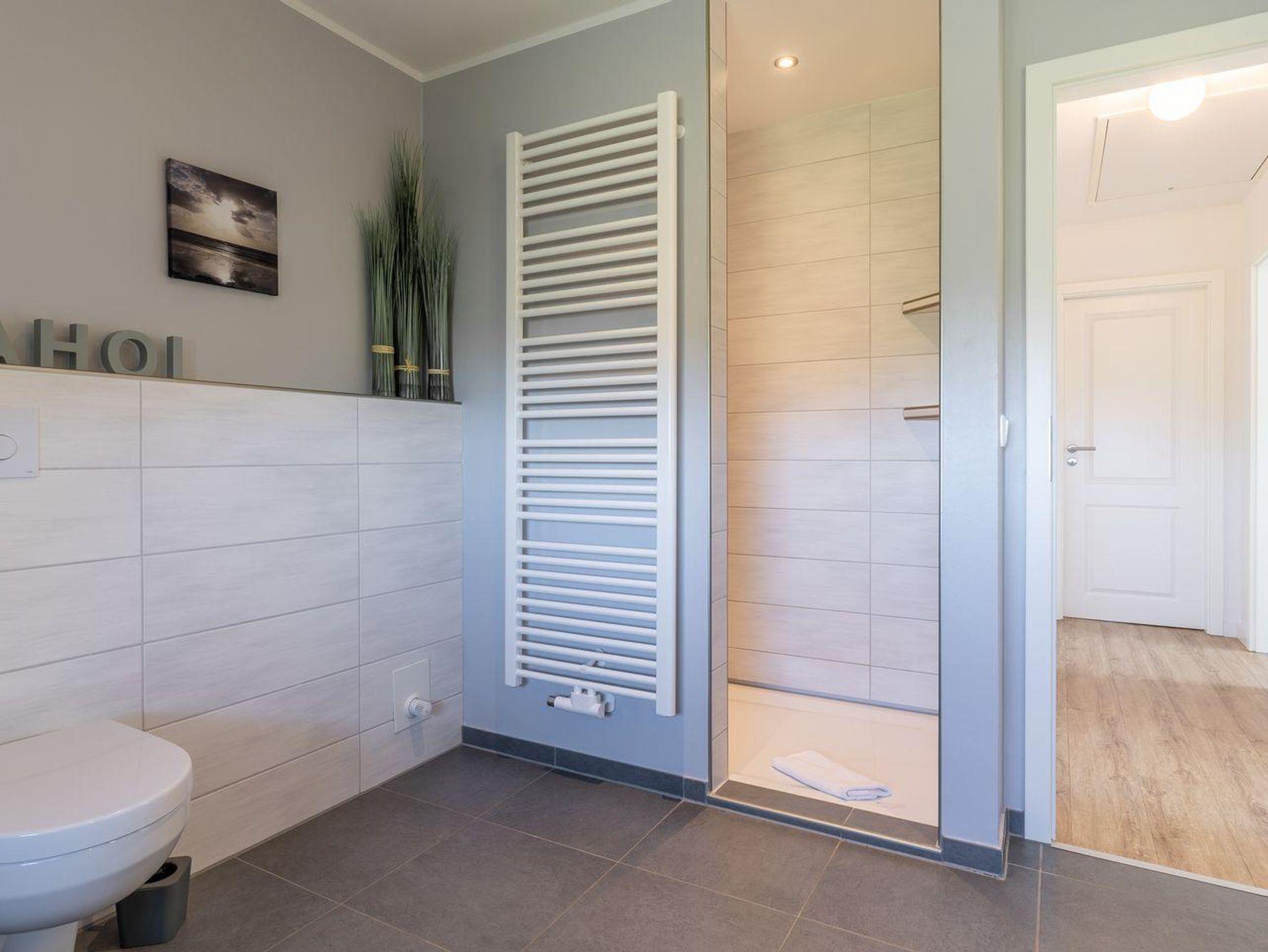 Darüber hinaus befindet sich im Obergeschoss ein weiteres großzügiges Duschbad mit Komfortdusche, WC und Handtuchheizkörper.